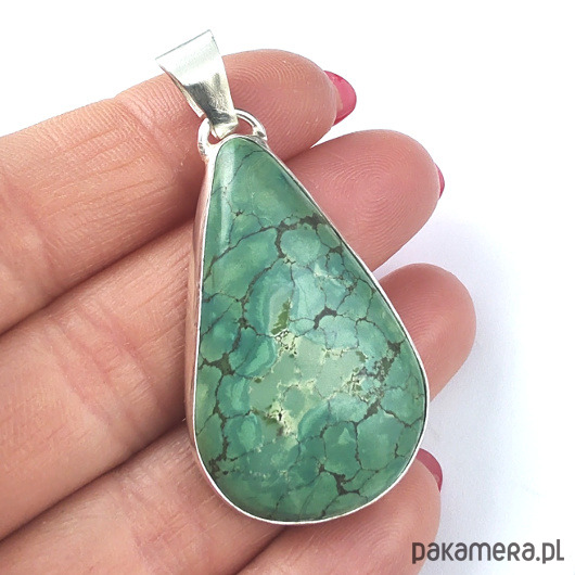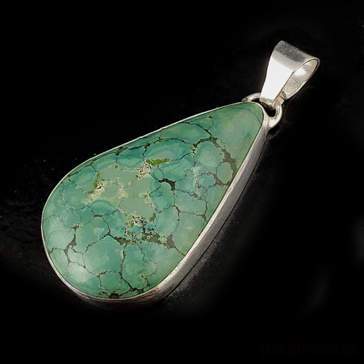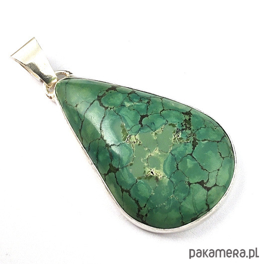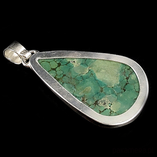 Wisior wykonany ze srebra pr 925 oraz pięknego, naturalnego turkusu. Oprawa 43 x 25 mm, długość z krawatką 52 mm. Waga 12,5 grama. Wisior wyslany zostanie w ozdobnym pudełeczku