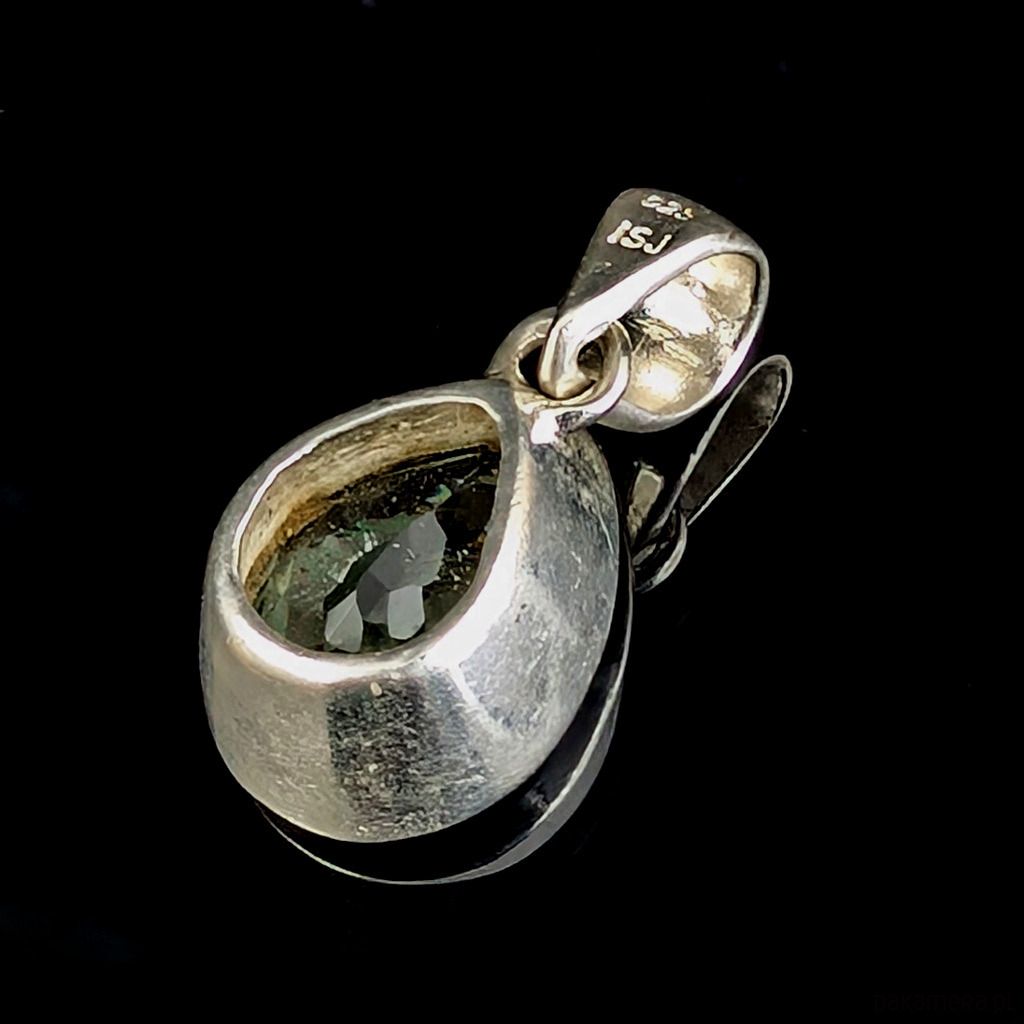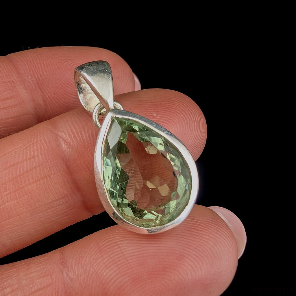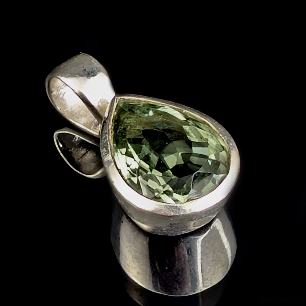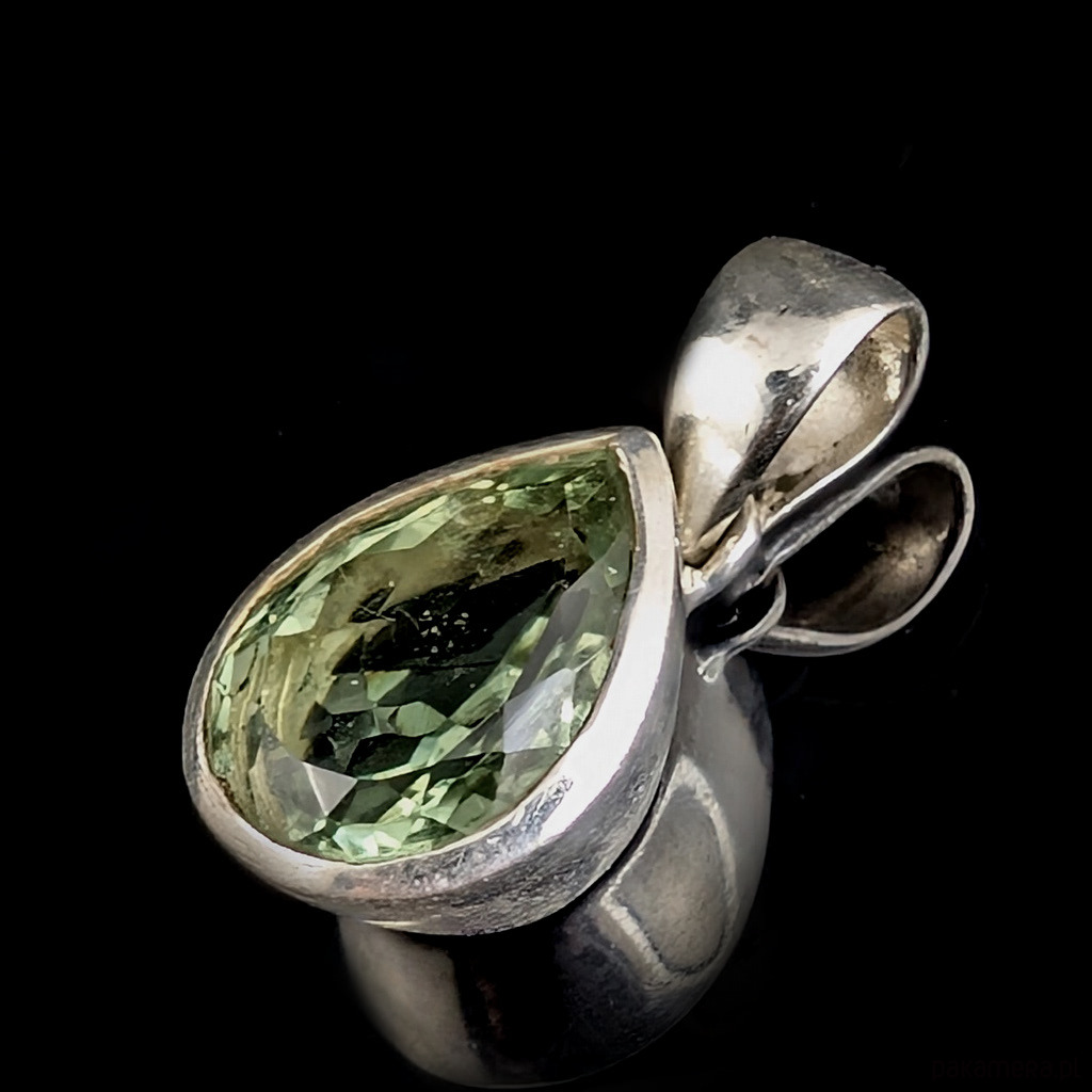 Elegancki wisiorek wykonany ze srebra próby 925 oraz zjawiskowego zielonego kryształu ametystu o precyzyjnym szlifie.