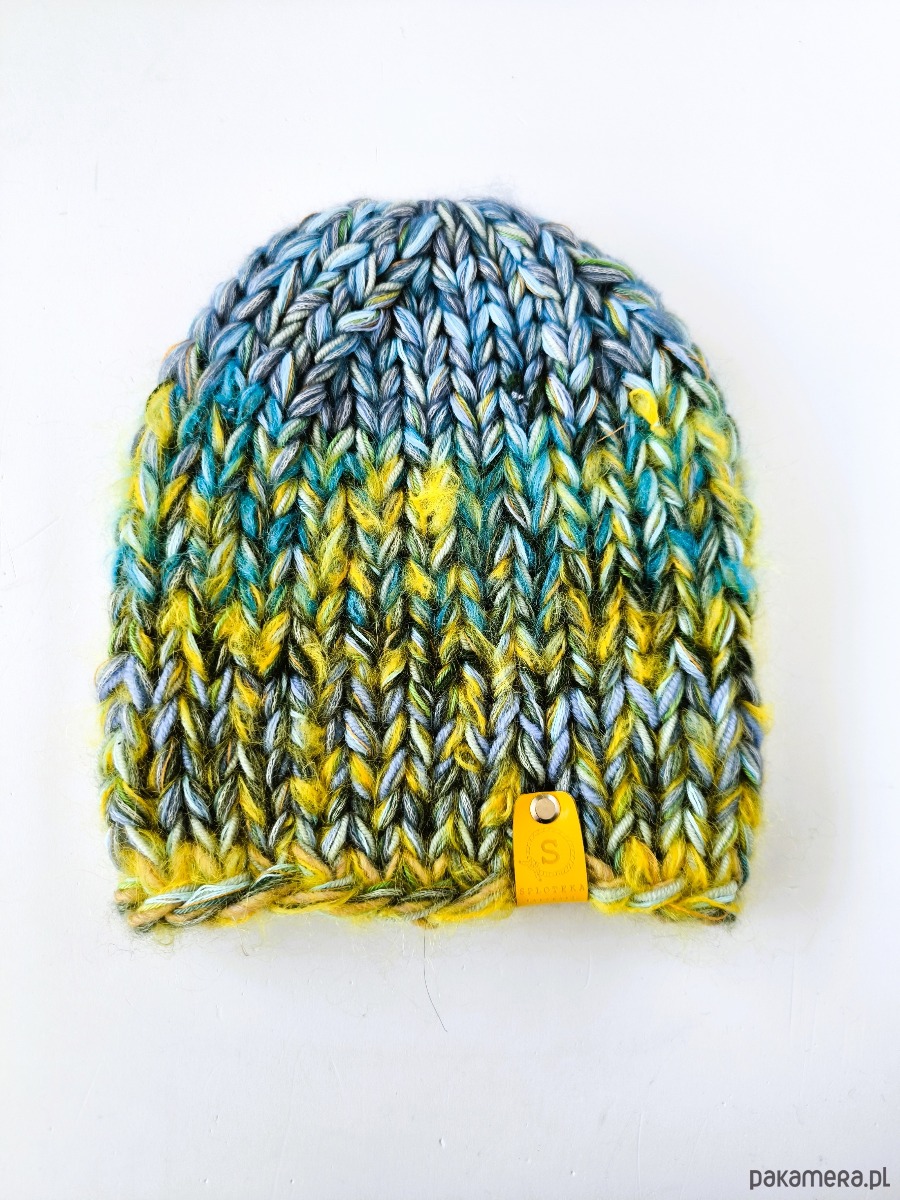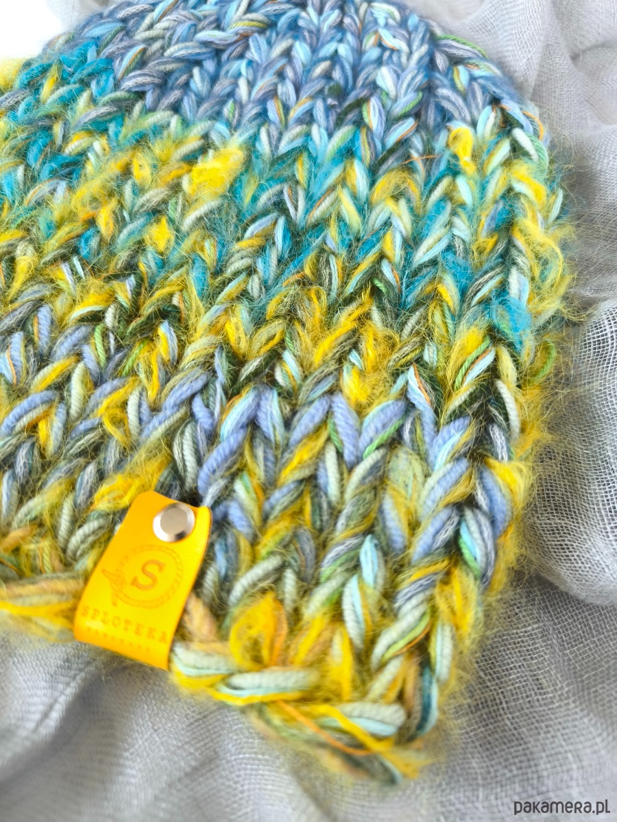 Czapka zrobiona ręcznie na drutach z mieszanki przeróżnych włóczek