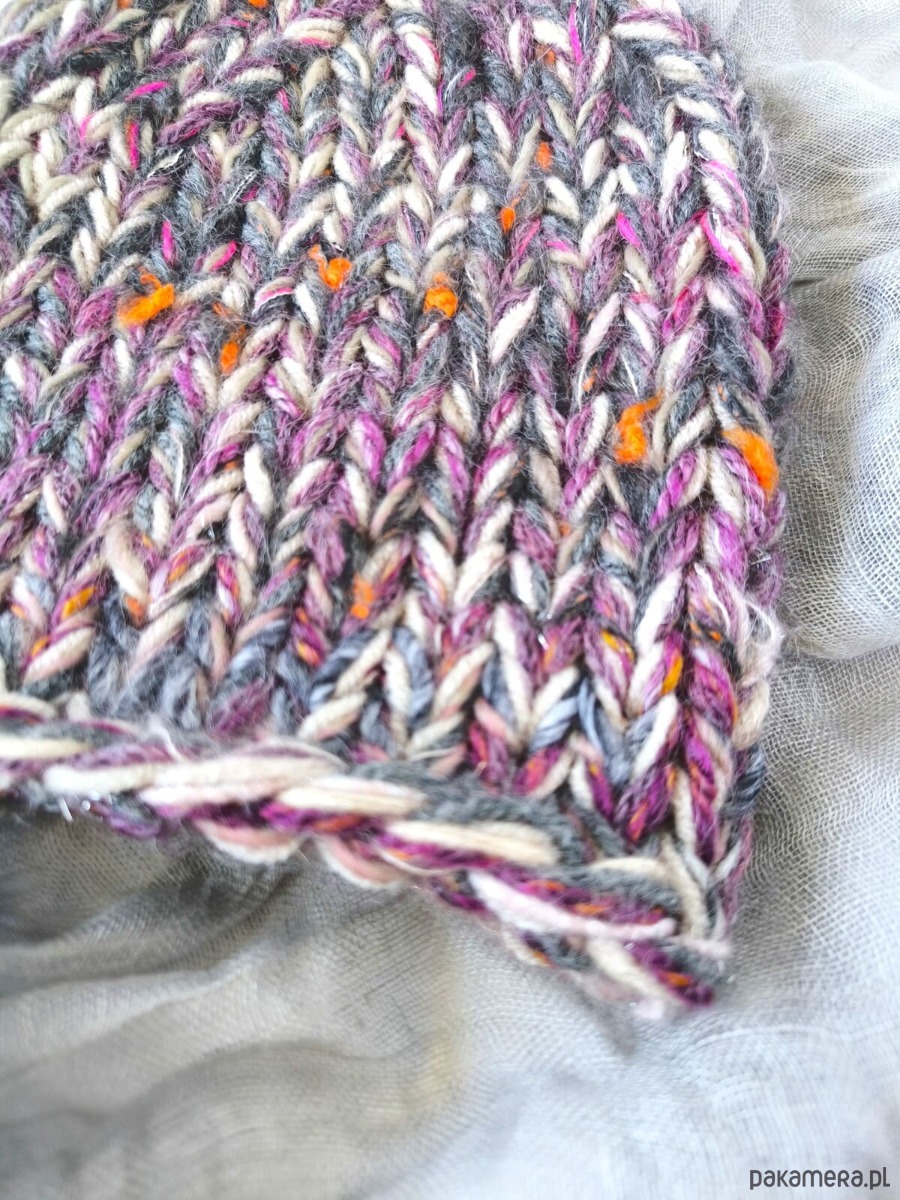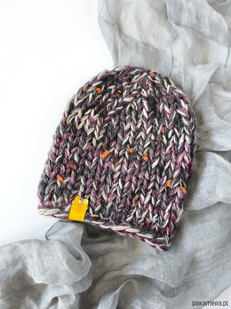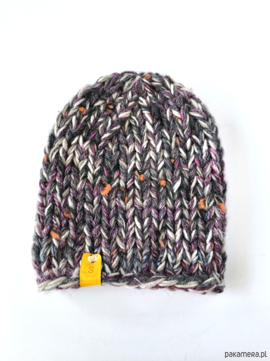 Czapka zrobiona ręcznie na drutach z mieszanki przeróżnych włóczek