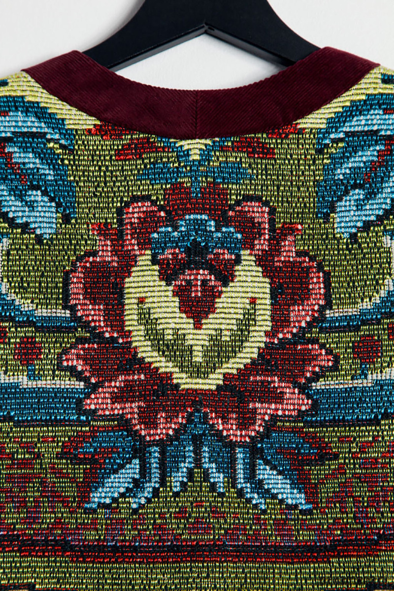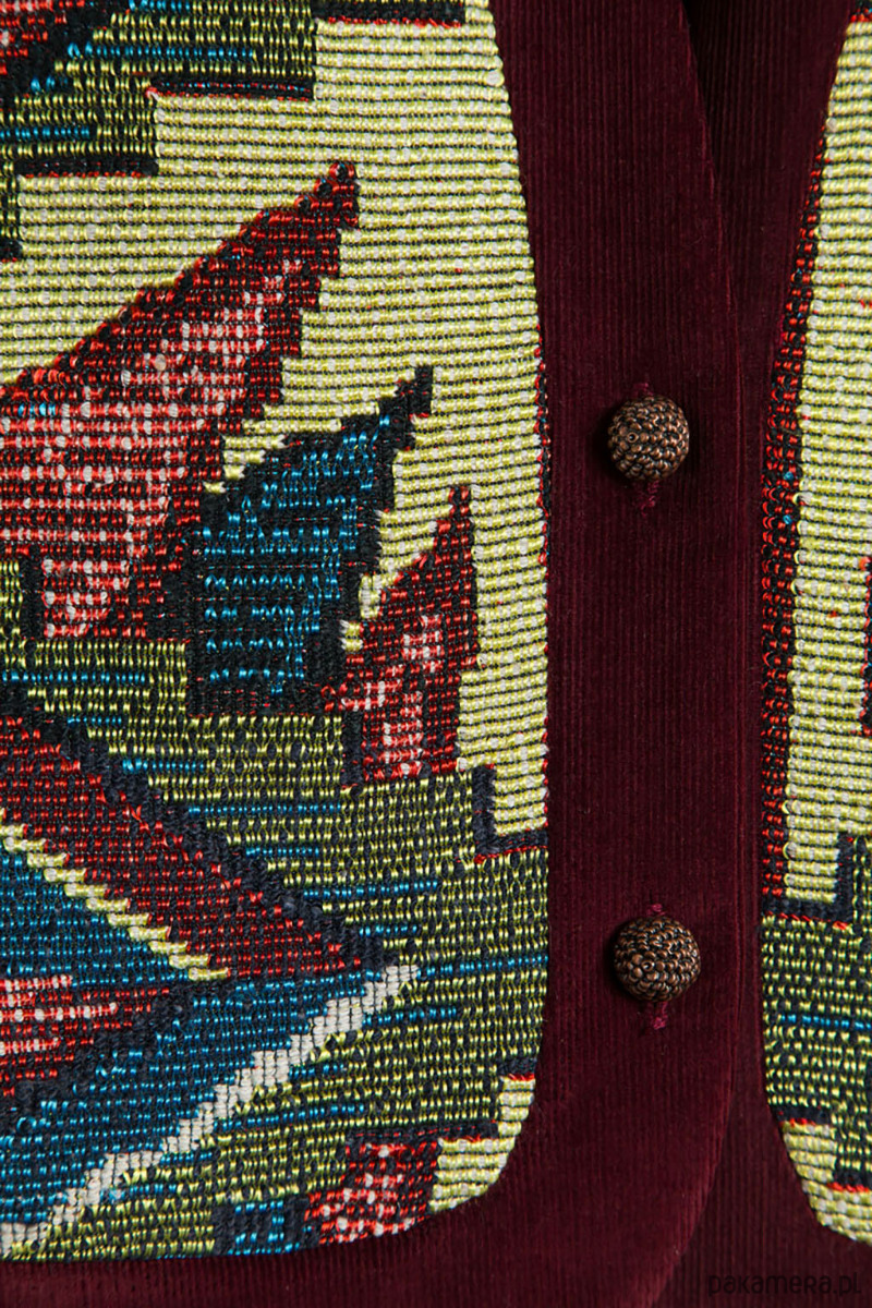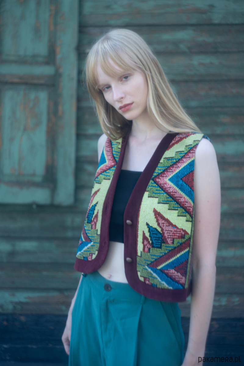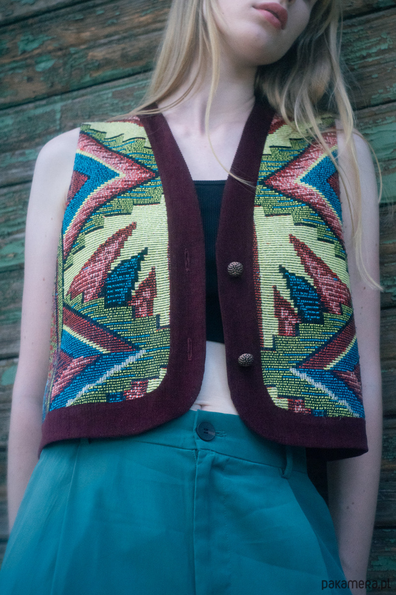 Upcyclingowa krótka kamizelka wykonana z pięknej, żakardowej narzuty z okresu PRL-u, z geometryczno - kwiatowym wzorem. Zapinana na guziki. W środku bawełniana podszewka, miła dla ciała. Idealna na każdą porę roku. Użyte tkaniny są bawełniane, dzięki czemu kamizelka jest przewiewna.