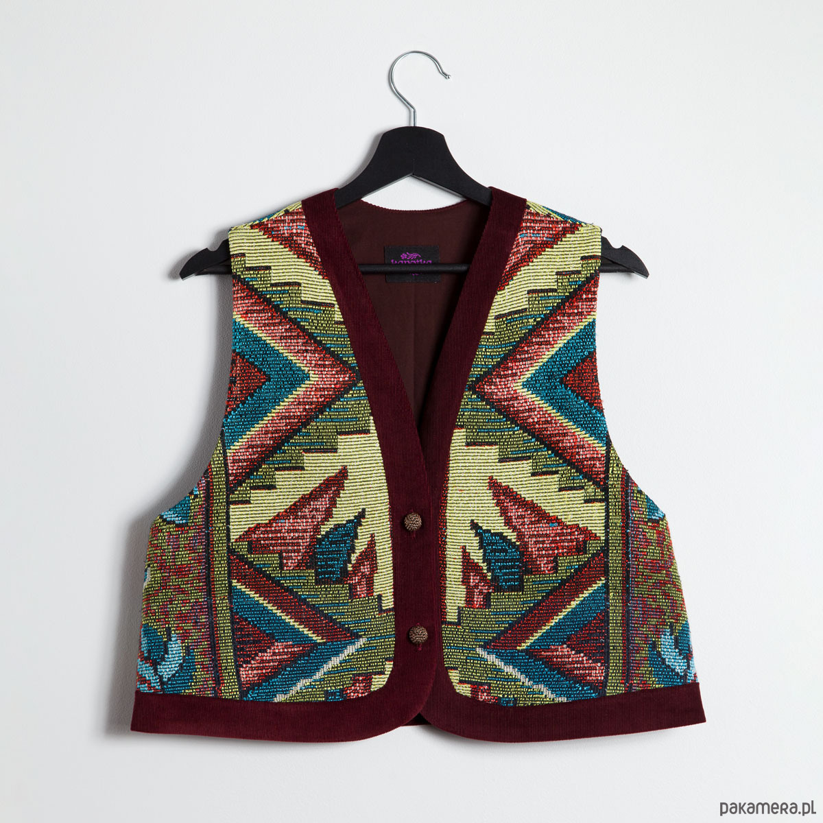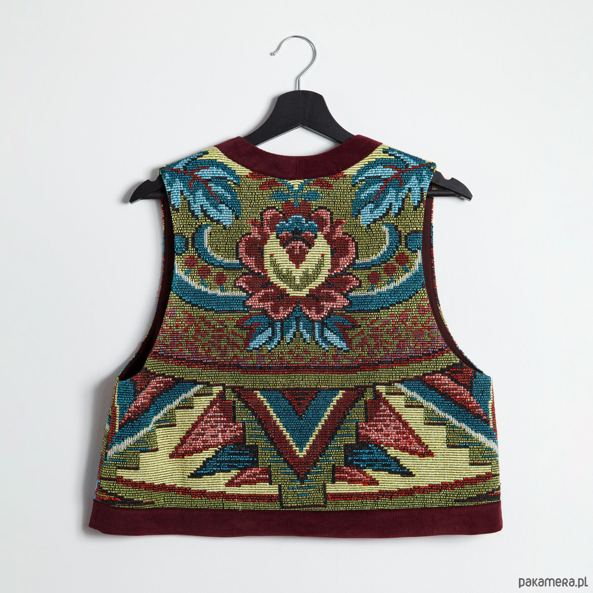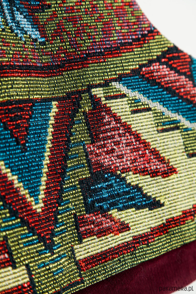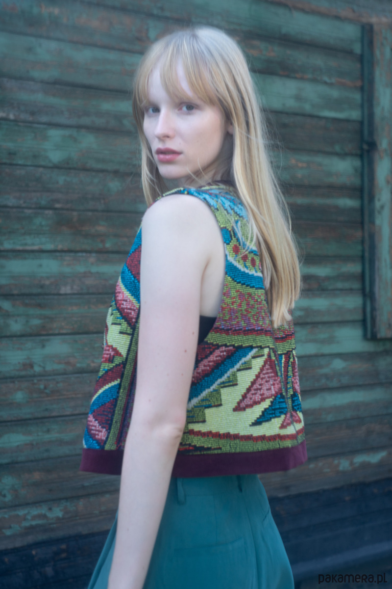 Upcyclingowa krótka kamizelka wykonana z pięknej, żakardowej narzuty z okresu PRL-u, z geometryczno - kwiatowym wzorem. Zapinana na guziki. W środku bawełniana podszewka, miła dla ciała. Idealna na każdą porę roku. Użyte tkaniny są bawełniane, dzięki czemu kamizelka jest przewiewna.
