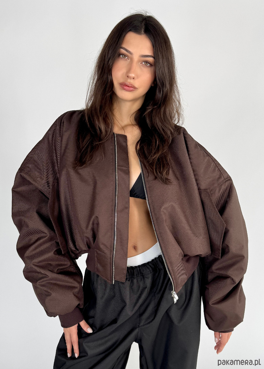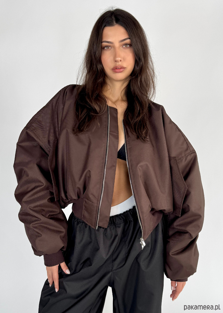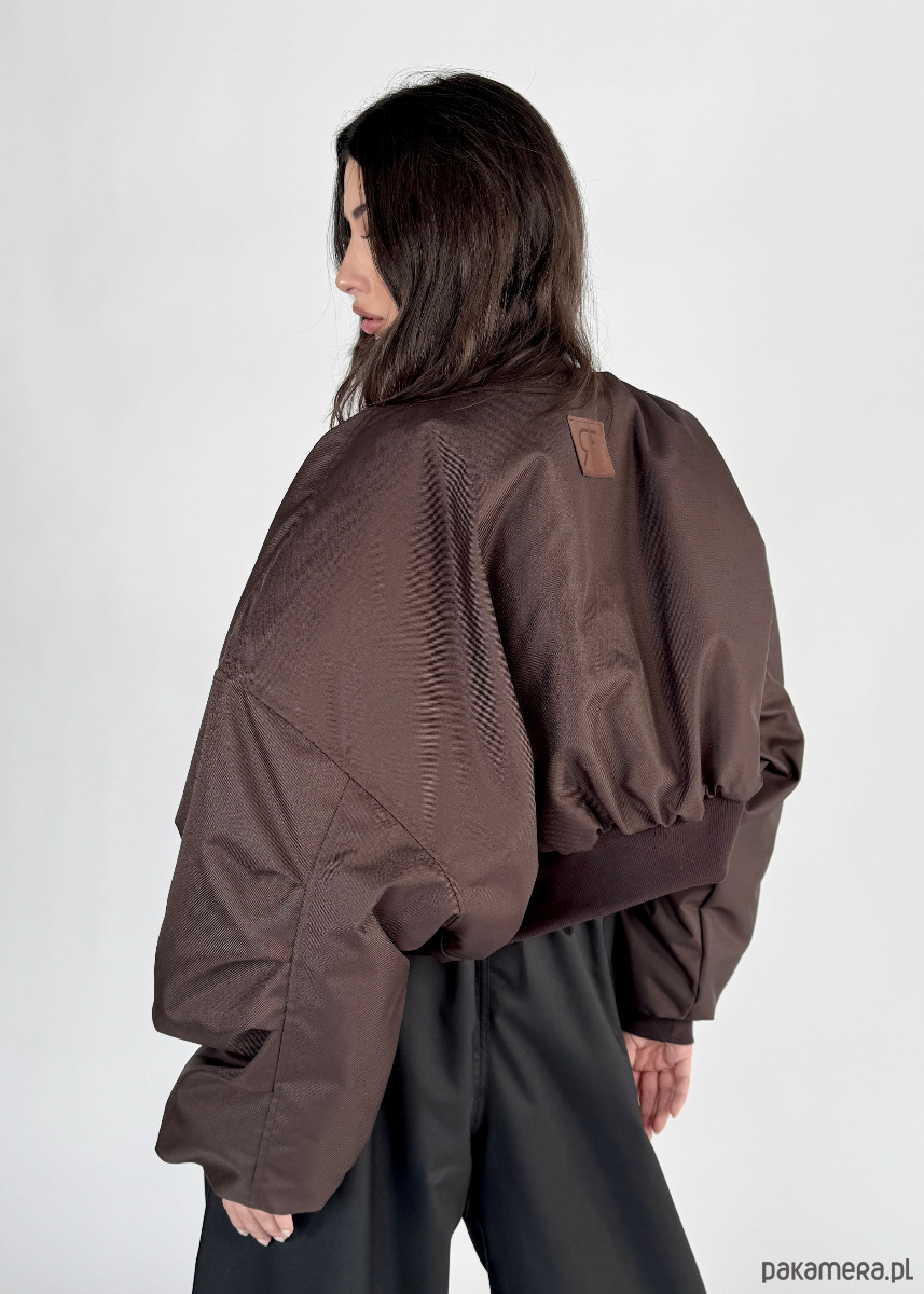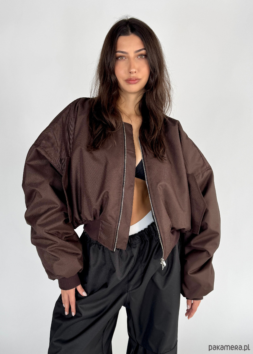 Krótka wersja naszej bestseller'owej bomberki wykonana z przeciwdeszczowej tkaniny w brązowym kolorze, zapinana na metalowy zamek z charakterystyczną patką