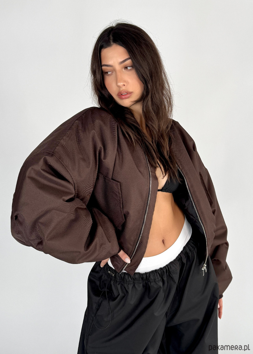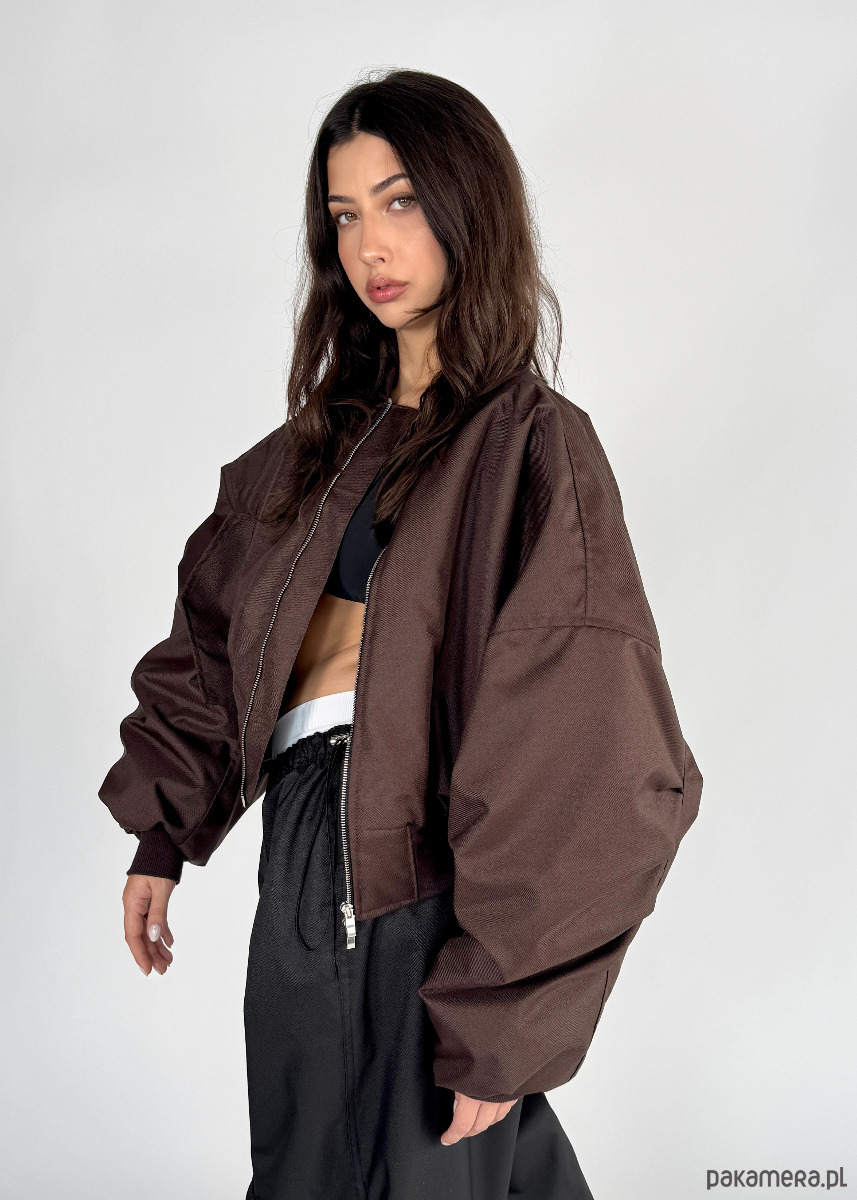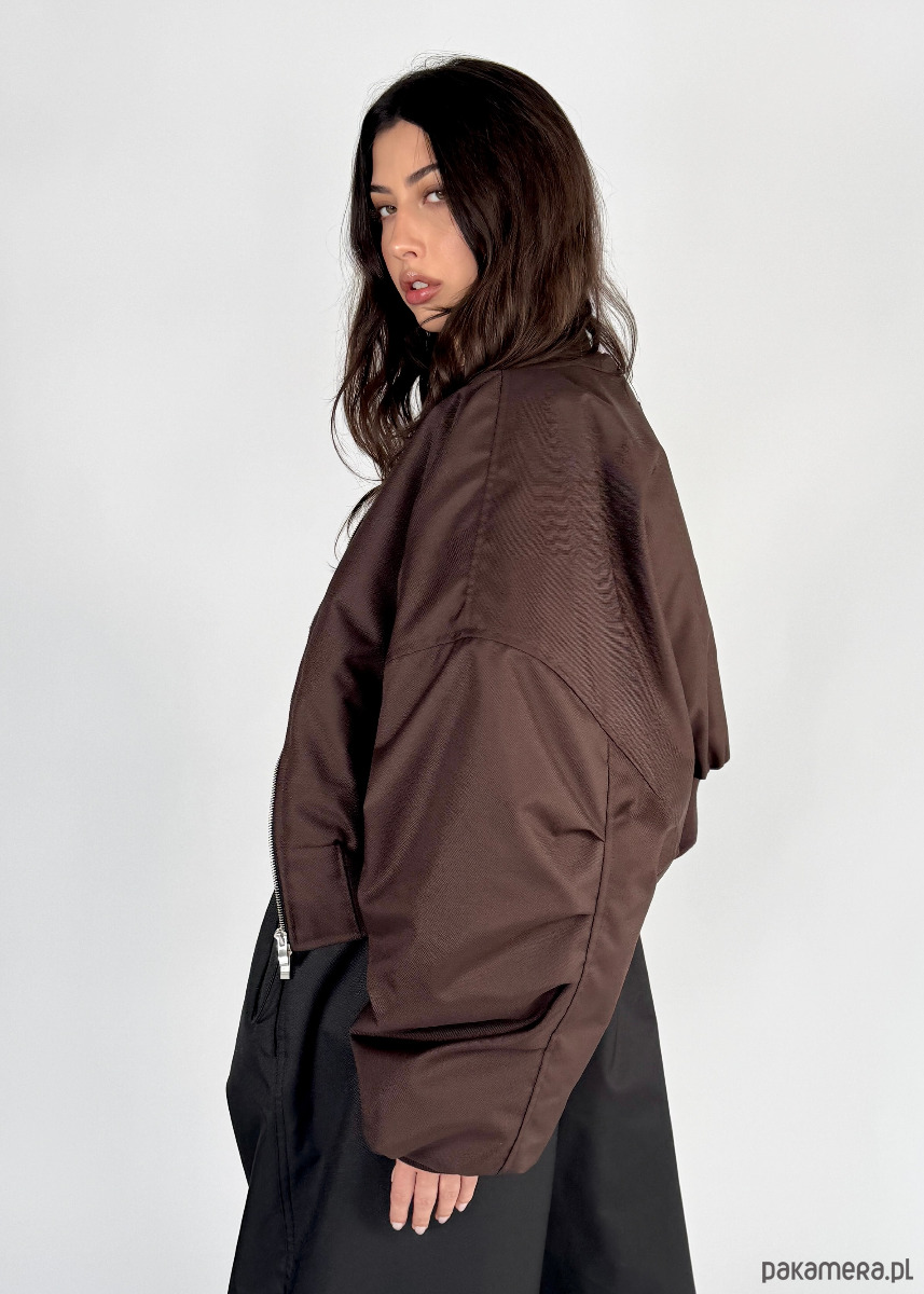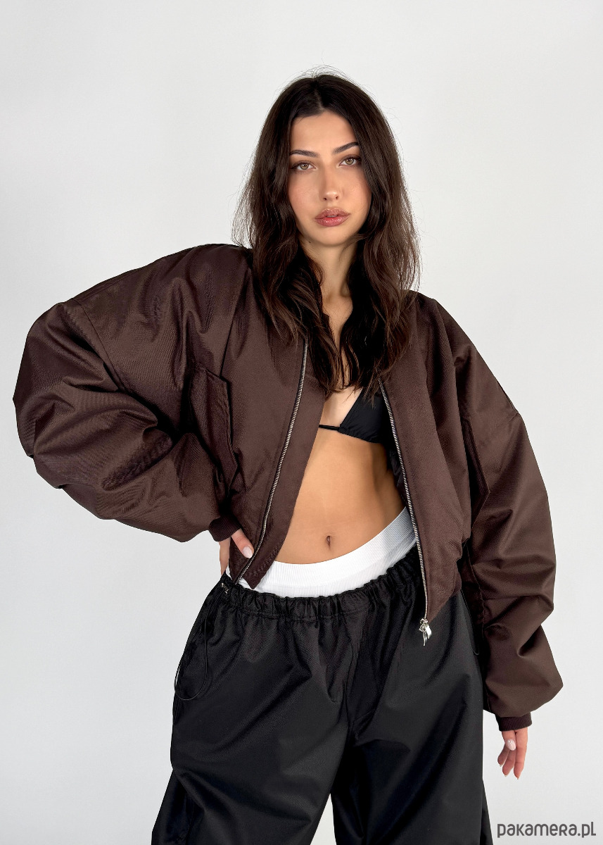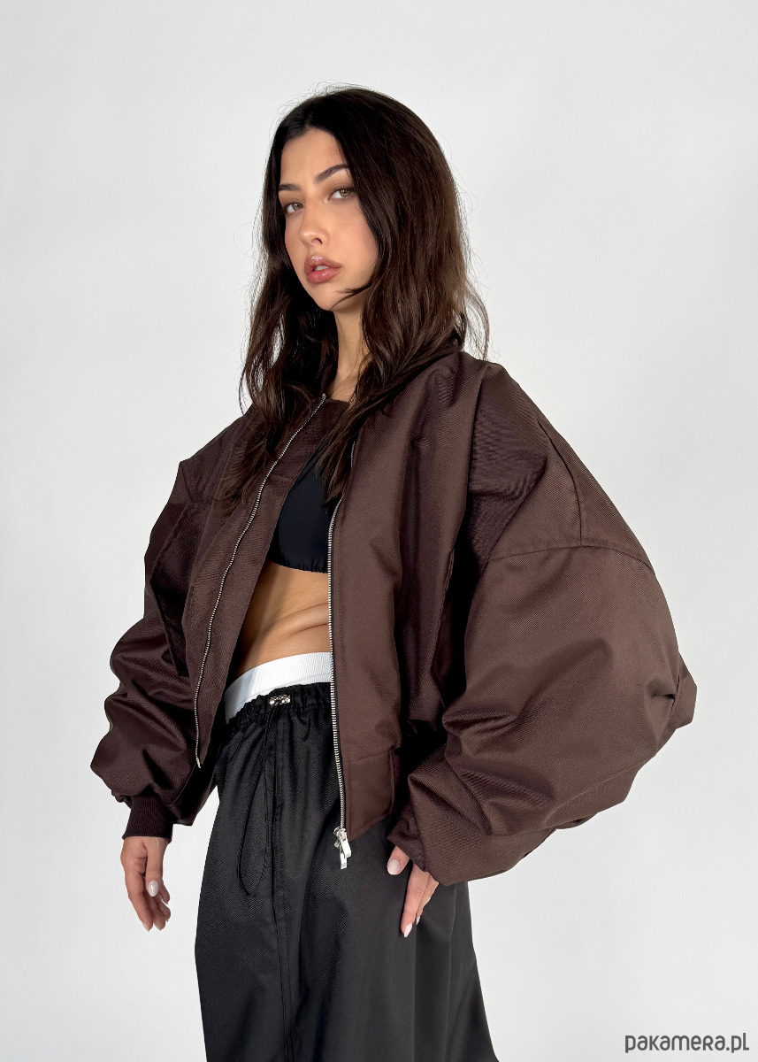 Krótka wersja naszej bestseller'owej bomberki wykonana z przeciwdeszczowej tkaniny w brązowym kolorze, zapinana na metalowy zamek z charakterystyczną patką