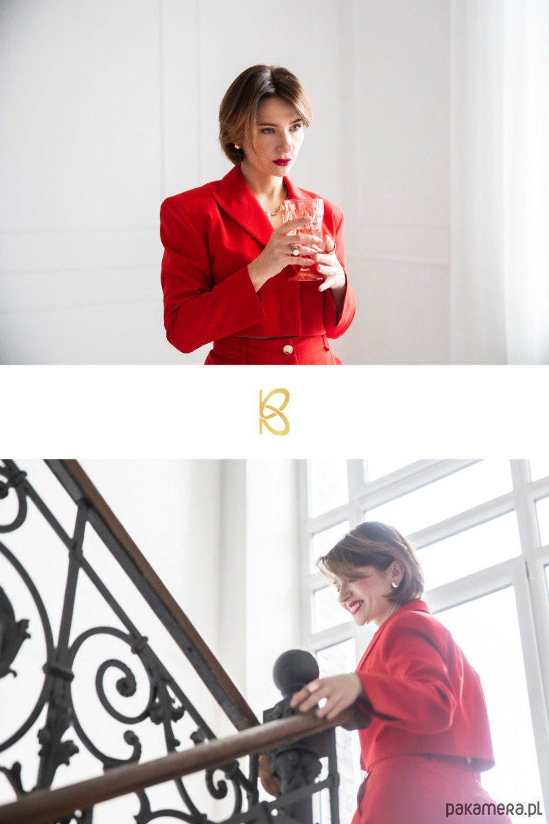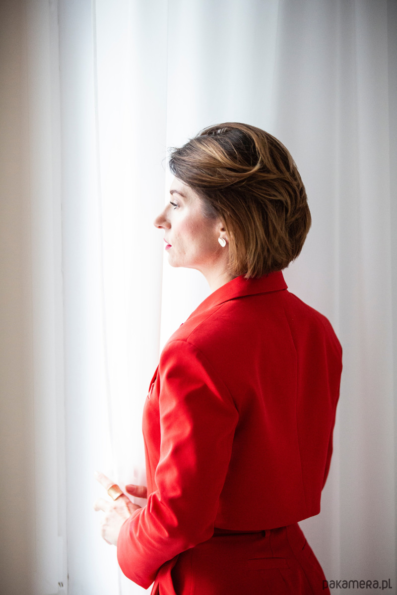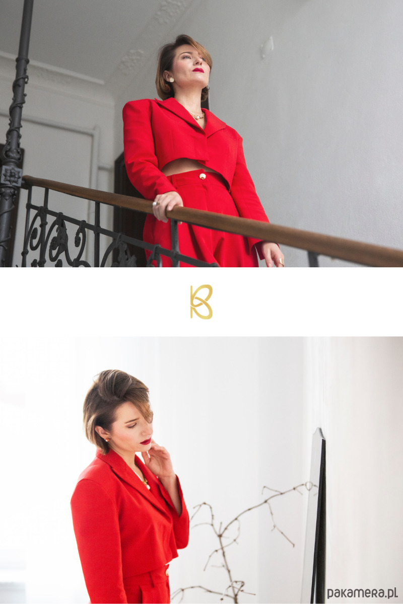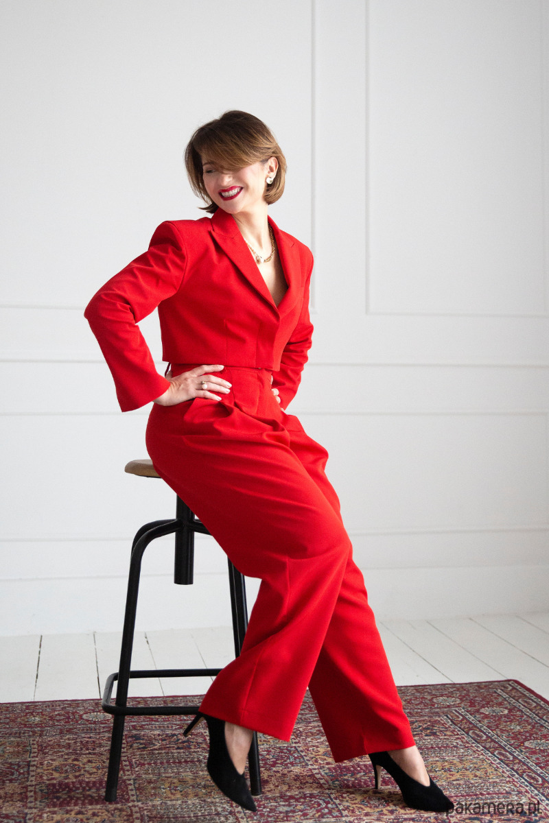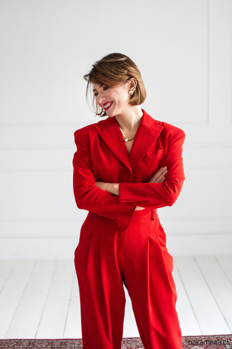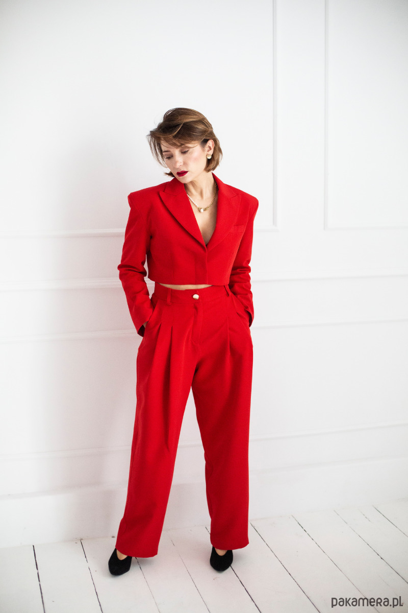 Krótka marynarka, zapinana na jeden guzik. Poszerzone ramiona dzięki poduszkom. Rozporki w rękawach.
