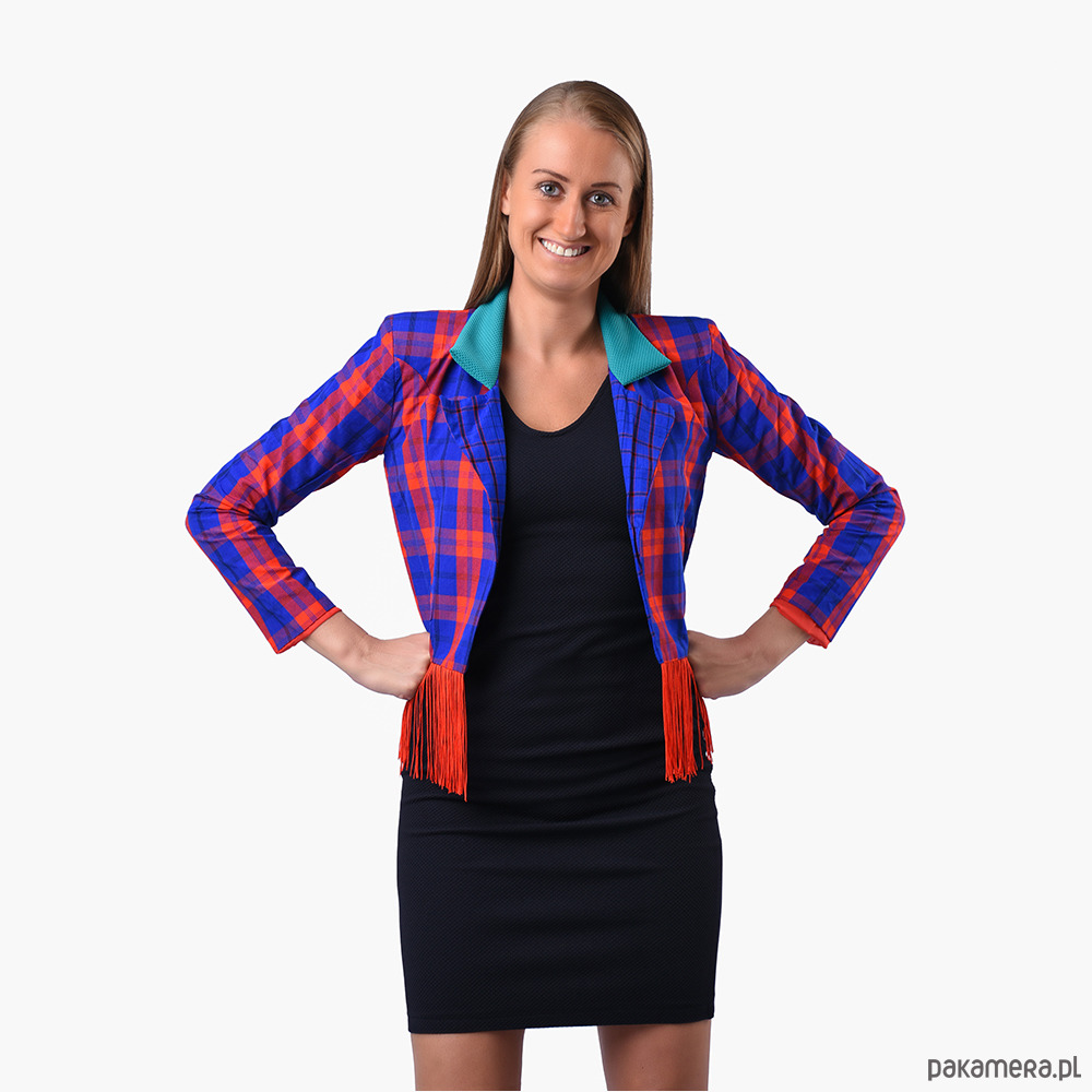 Krótka marynarka z frędzlami u dołu na całej długości to przede wszystkim zabawa z kolorem i wzorem.