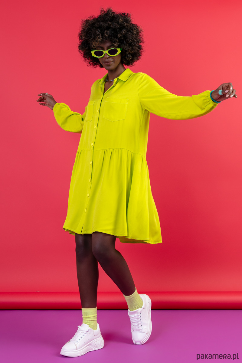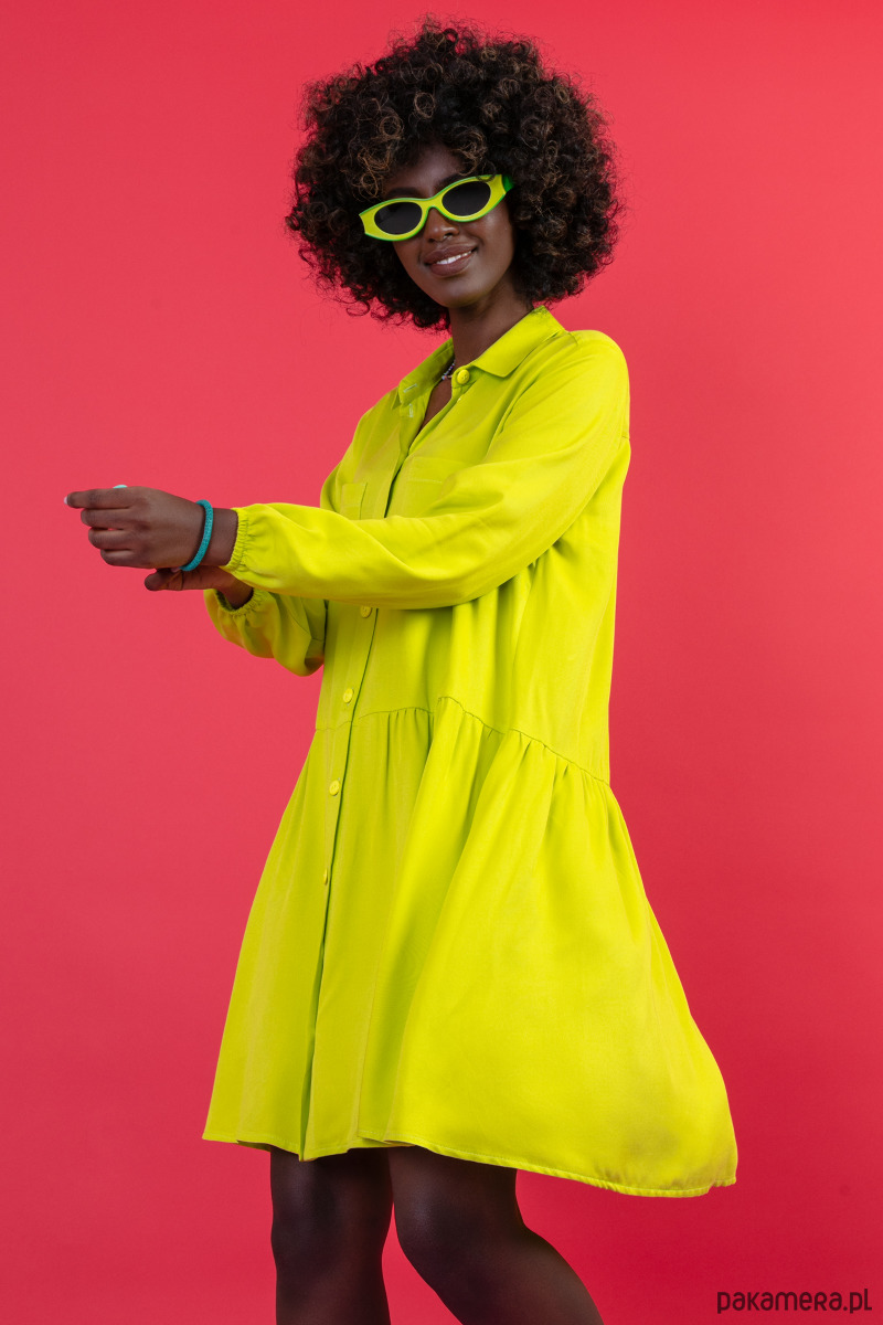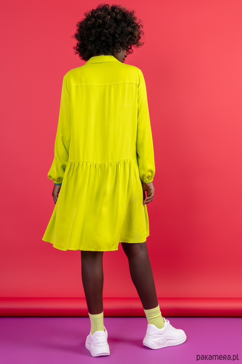 Krótka zapinana sukienka o luźnym kroju z wiskozy w kolorze LIMONKOWYM.