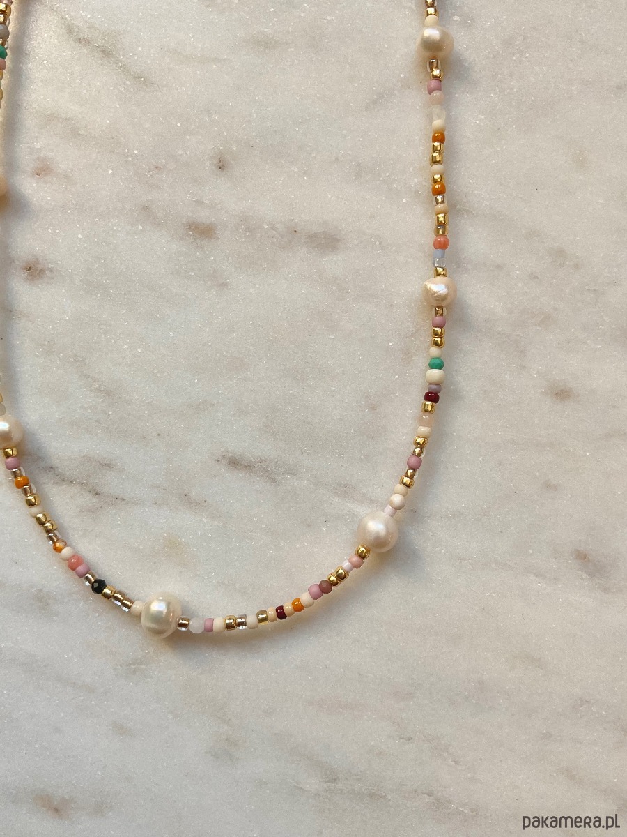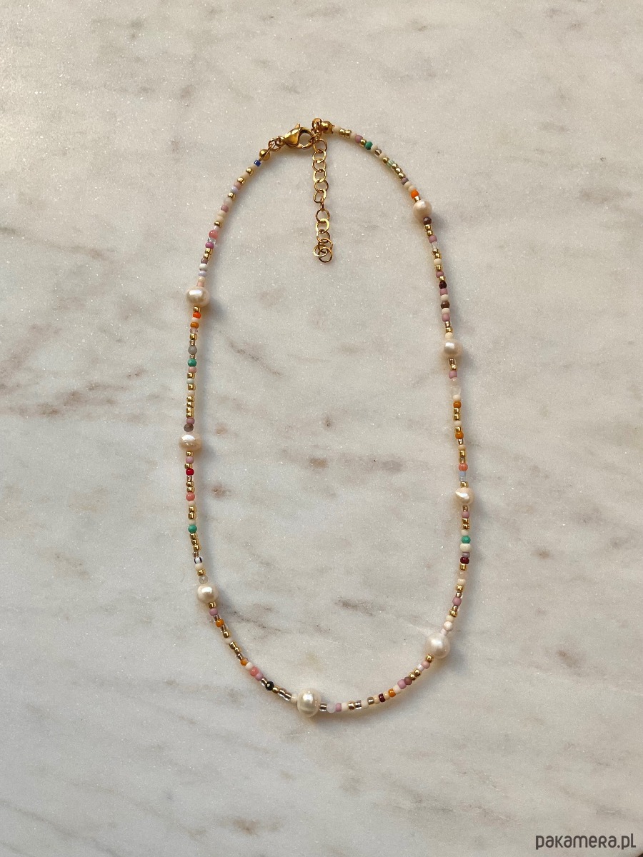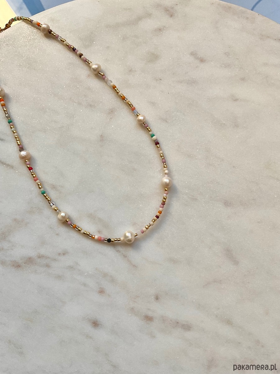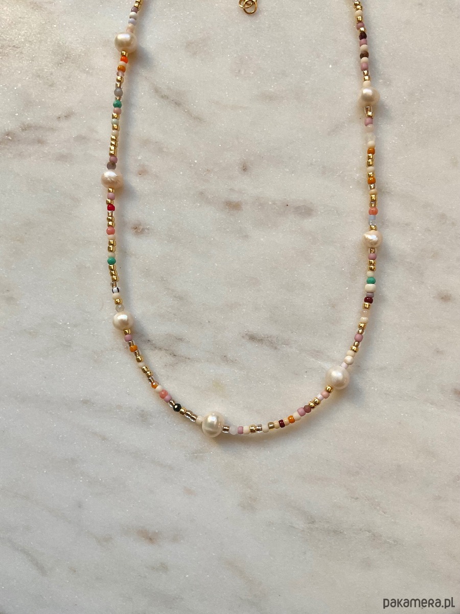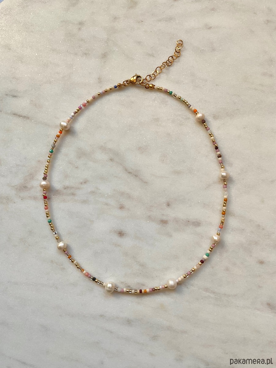 Krotki naszyjnik z kolorowej mieszanki kamieni i szklanych koralików oraz pereł naturalnych o rozmiarze 5mm.
