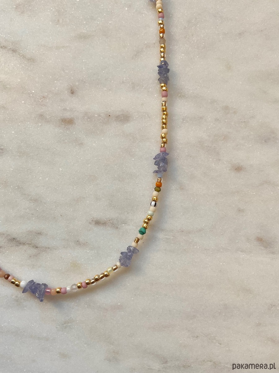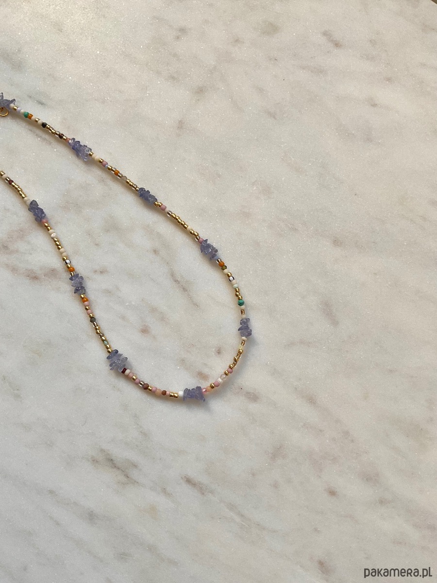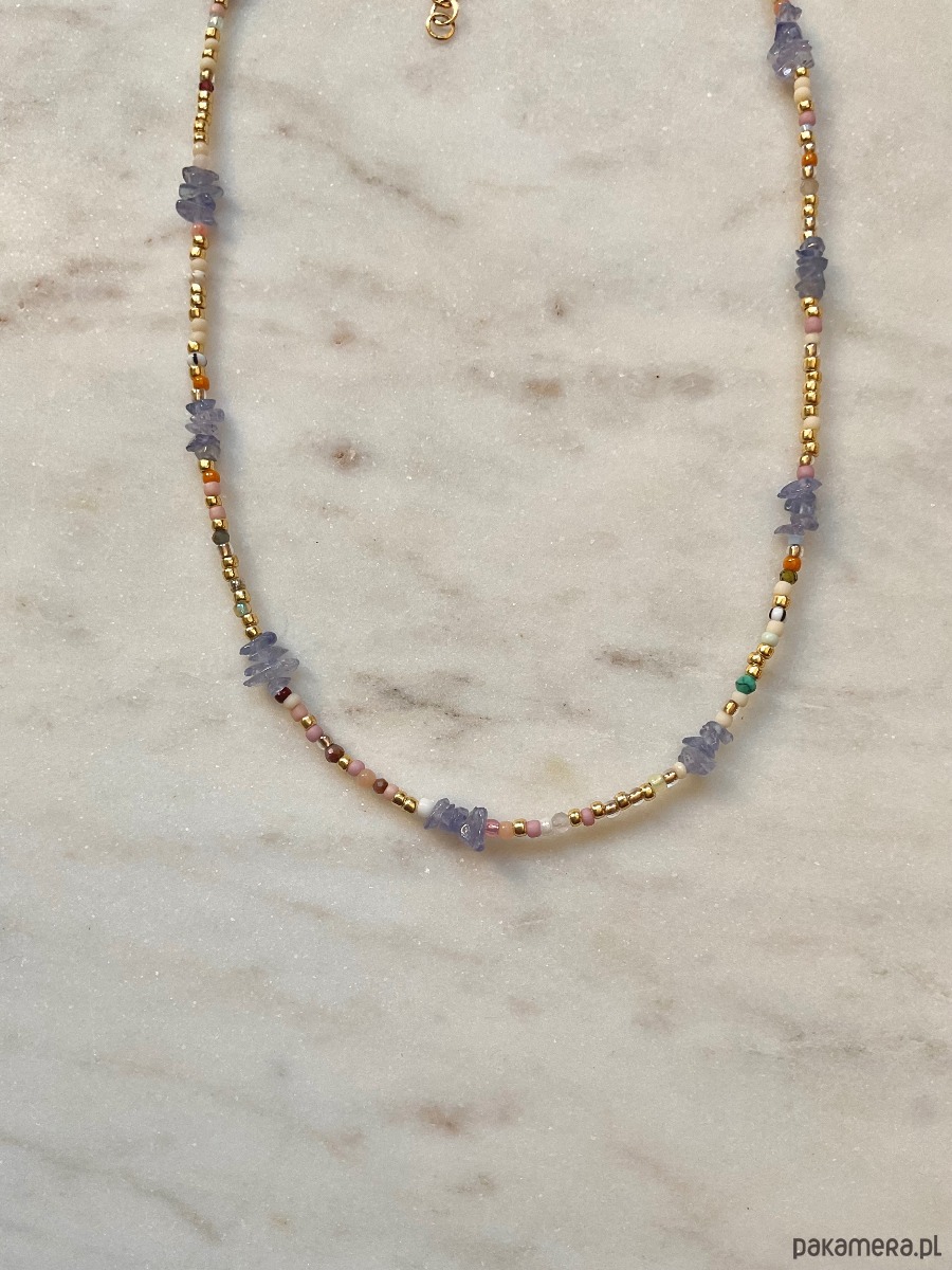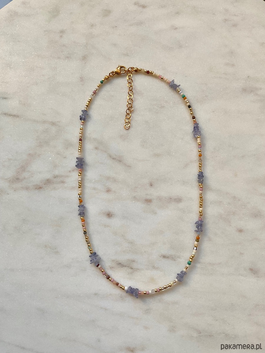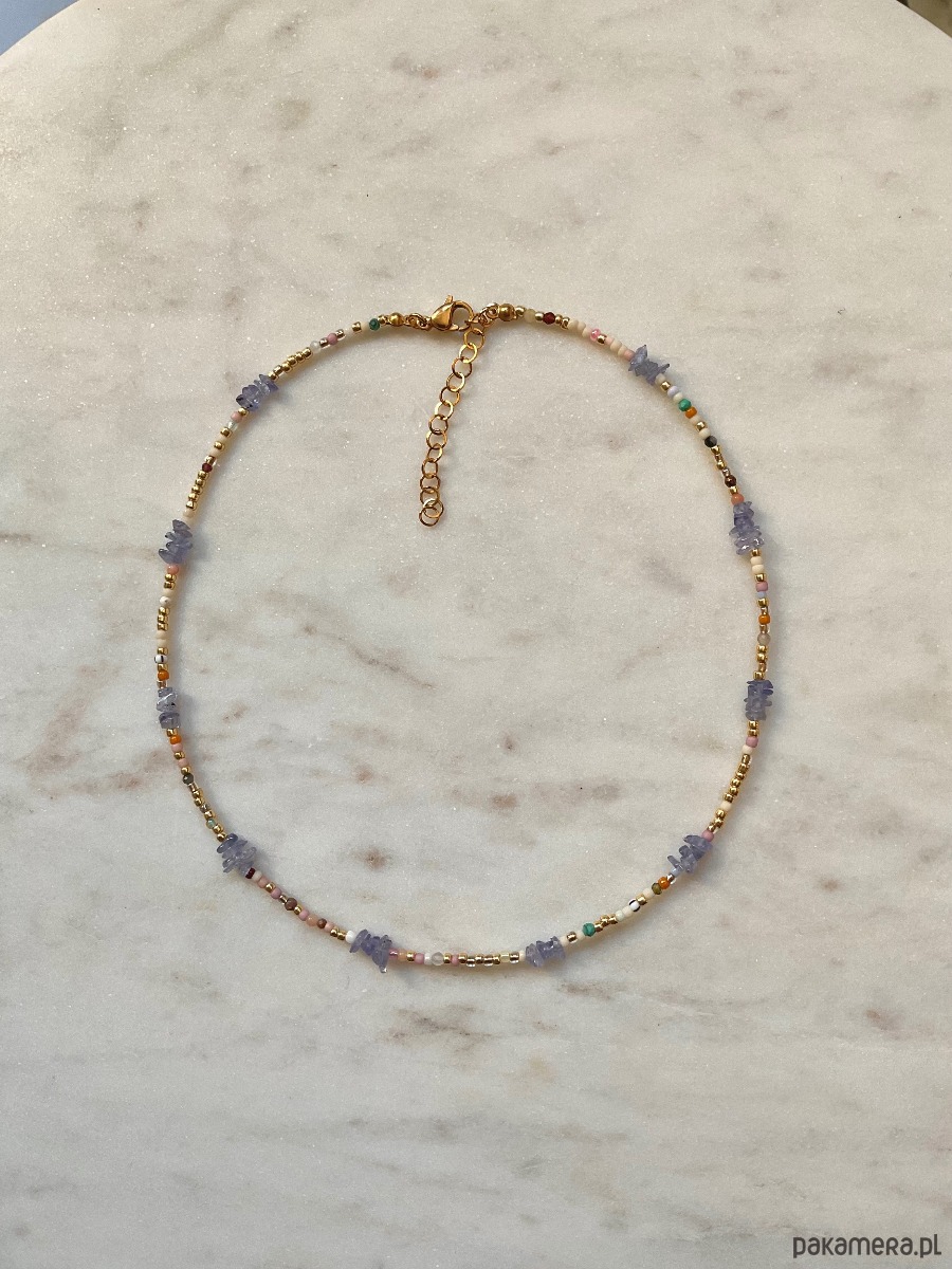 Krotki naszyjnik z kolorowej mieszanki kamieni i szklanych koralików oraz drobnych kamieni tanzanit o nieregularnym kształcie.