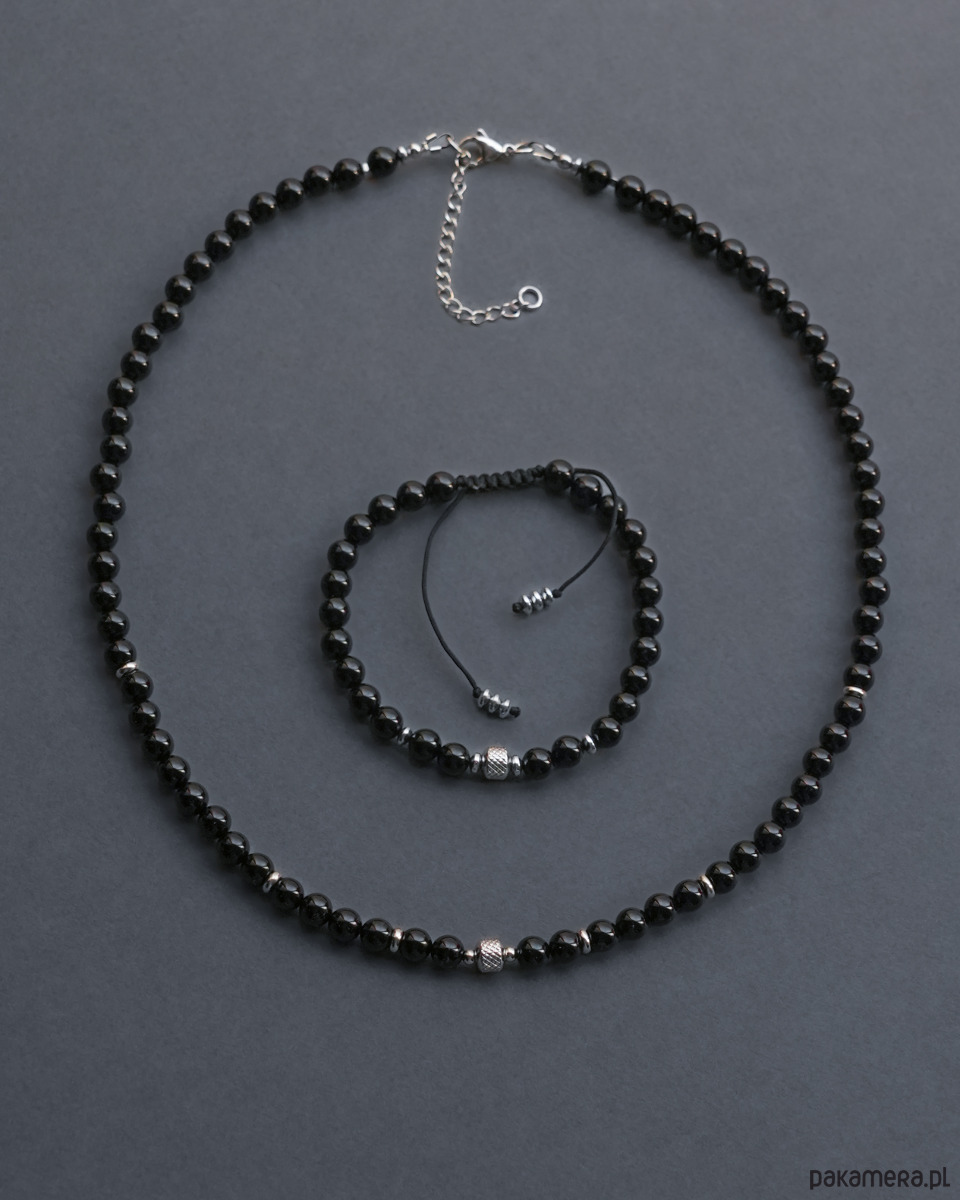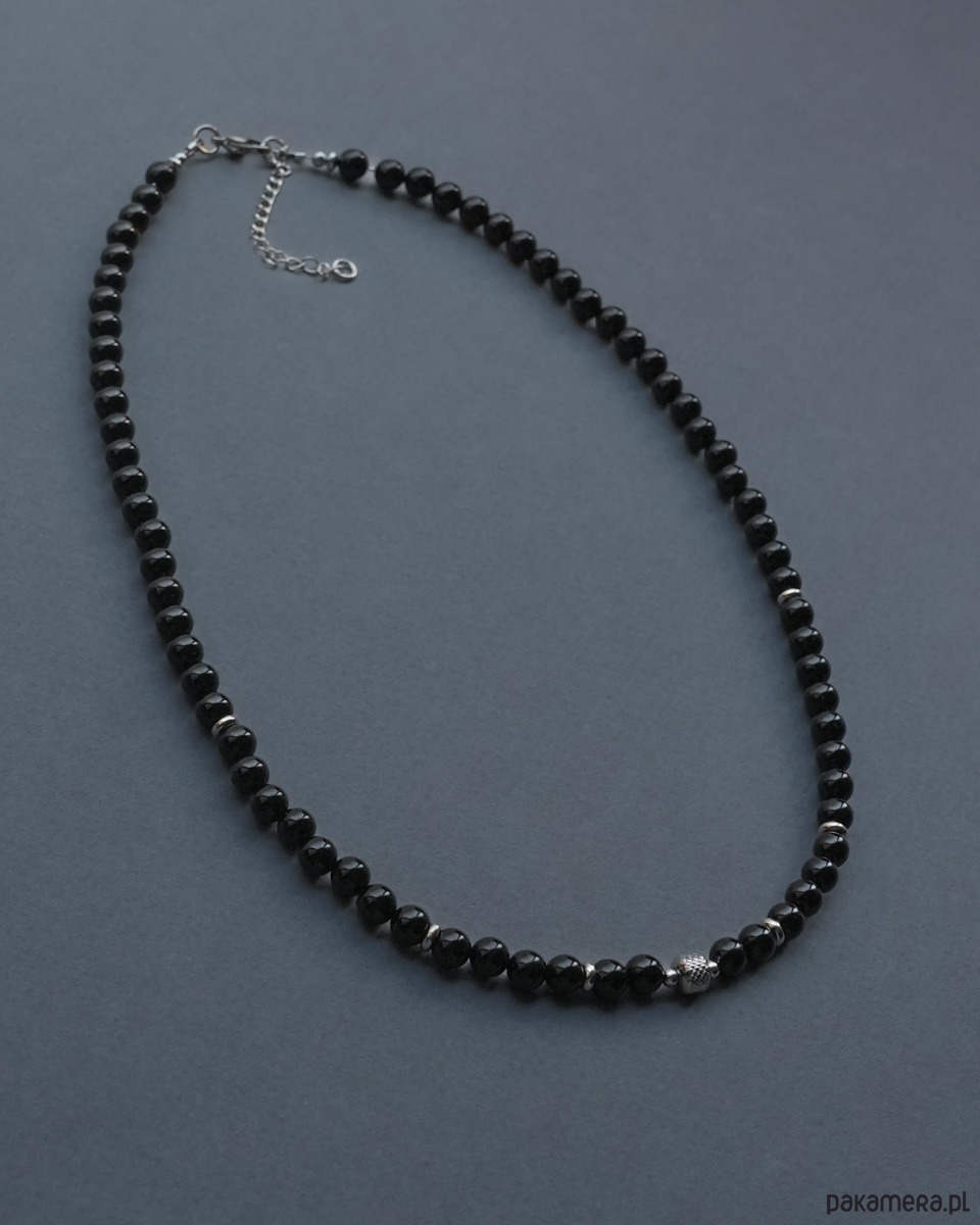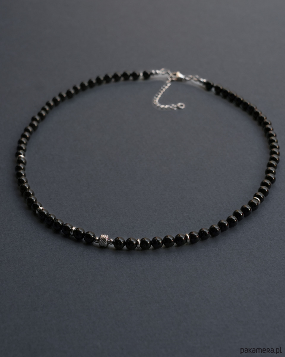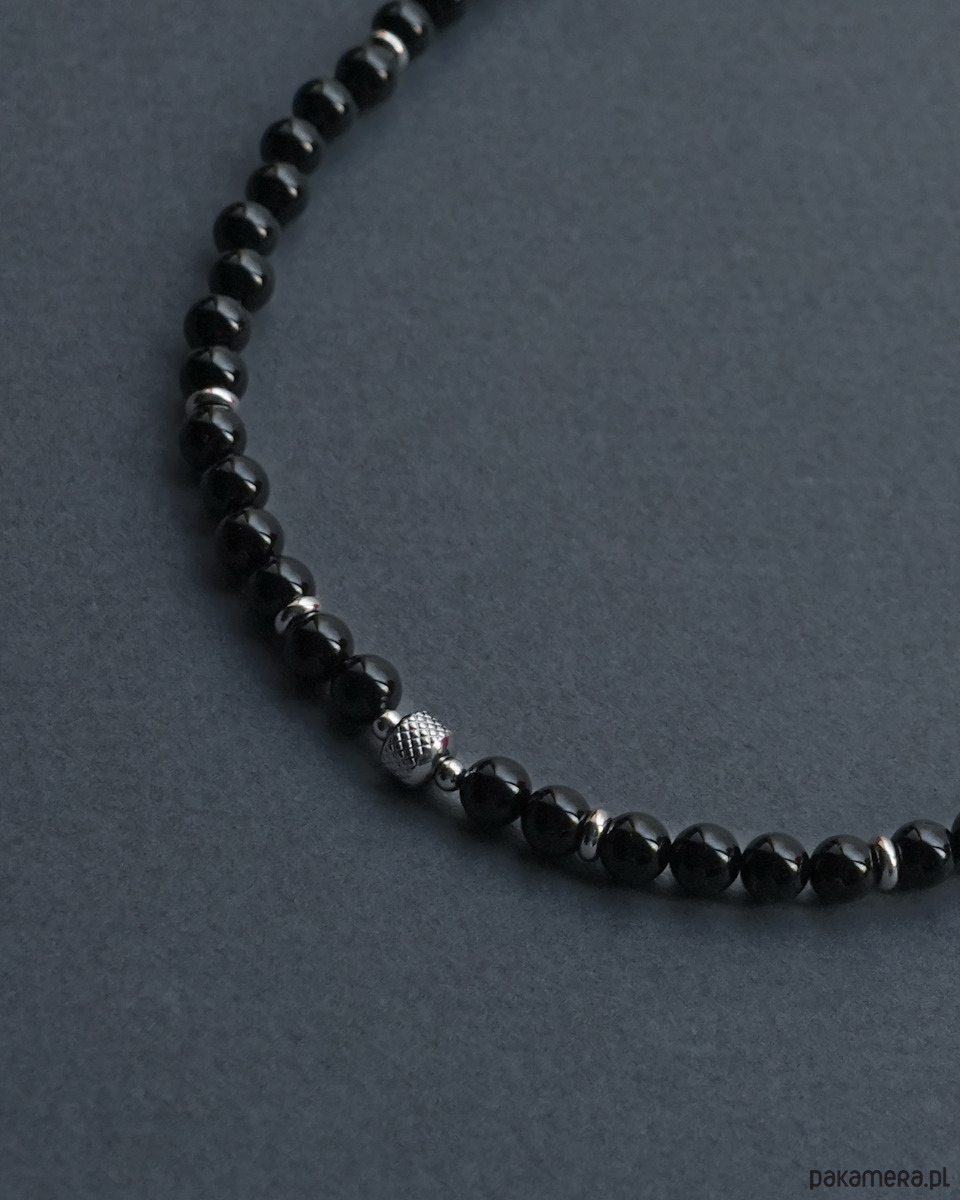 Krótki, męski naszyjnik z czarnego ONYKSU, którego centralny element stanowi ozdobny koralik ze STALI SZLACHETNEJ. Naszyjnik posiada klasyczne zapięcie karabińczyk oraz dodatkowy łańcuszek tzw. przedłużkę. Wszystkie srebrne elementy (koraliki, łańcuszek i zapięcie) to STAL SZLACHETNA.