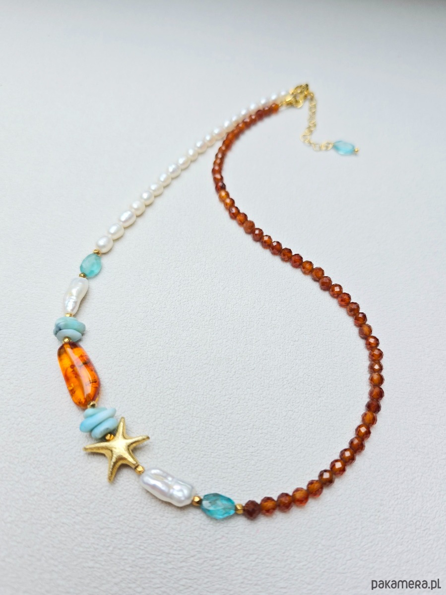 Piekny naszyjnik z motywem rozgwiazdy, z kamieni naturalnych tj.: granat hessonit, apatyt, larimar, bursztyn, perły, złocony hematyt.