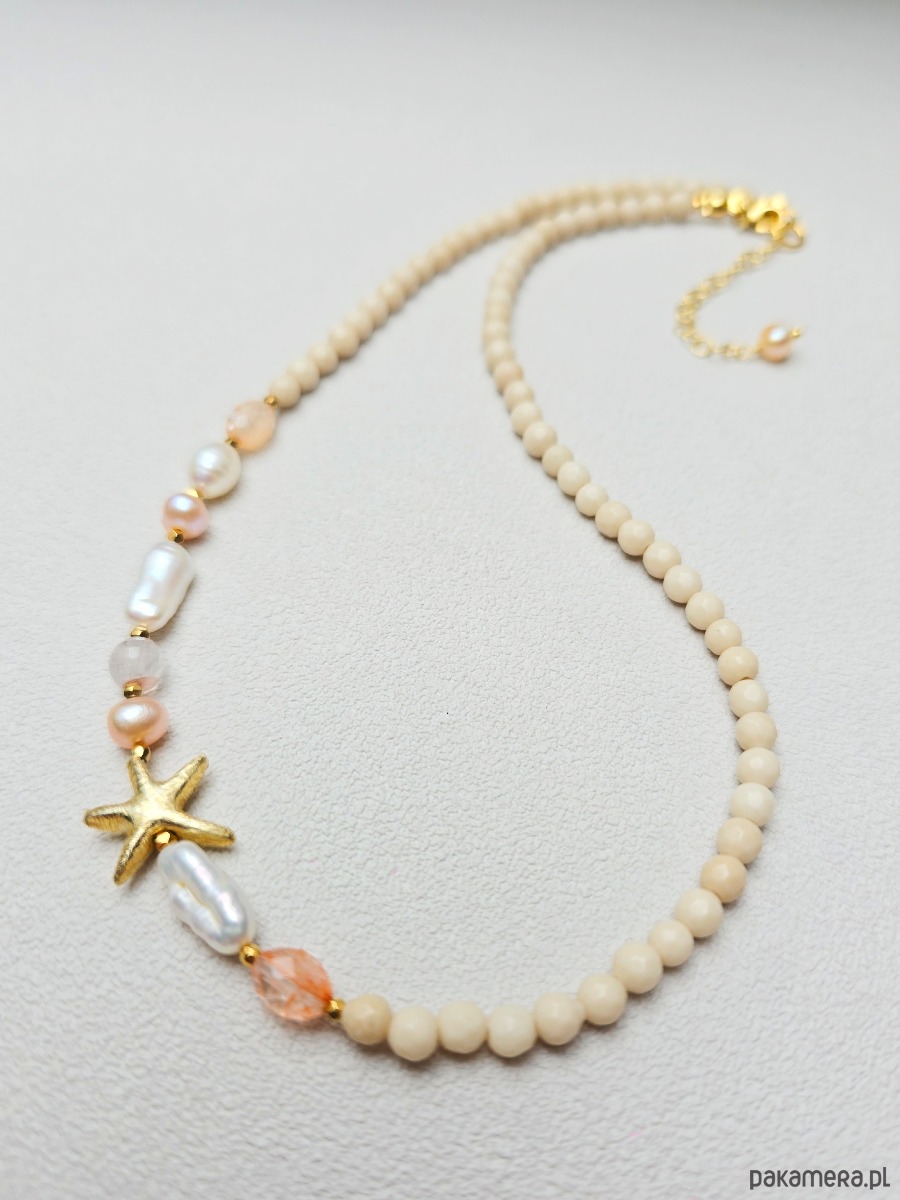 Piekny naszyjnikz motywem rozgwiazdy, z kamieni naturalnych tj.: jaspis rzeczny, kwarc, perły, złocony hematyt.