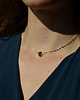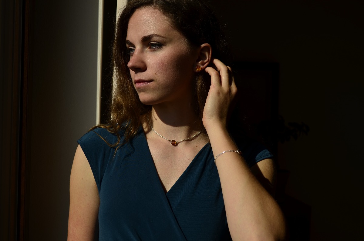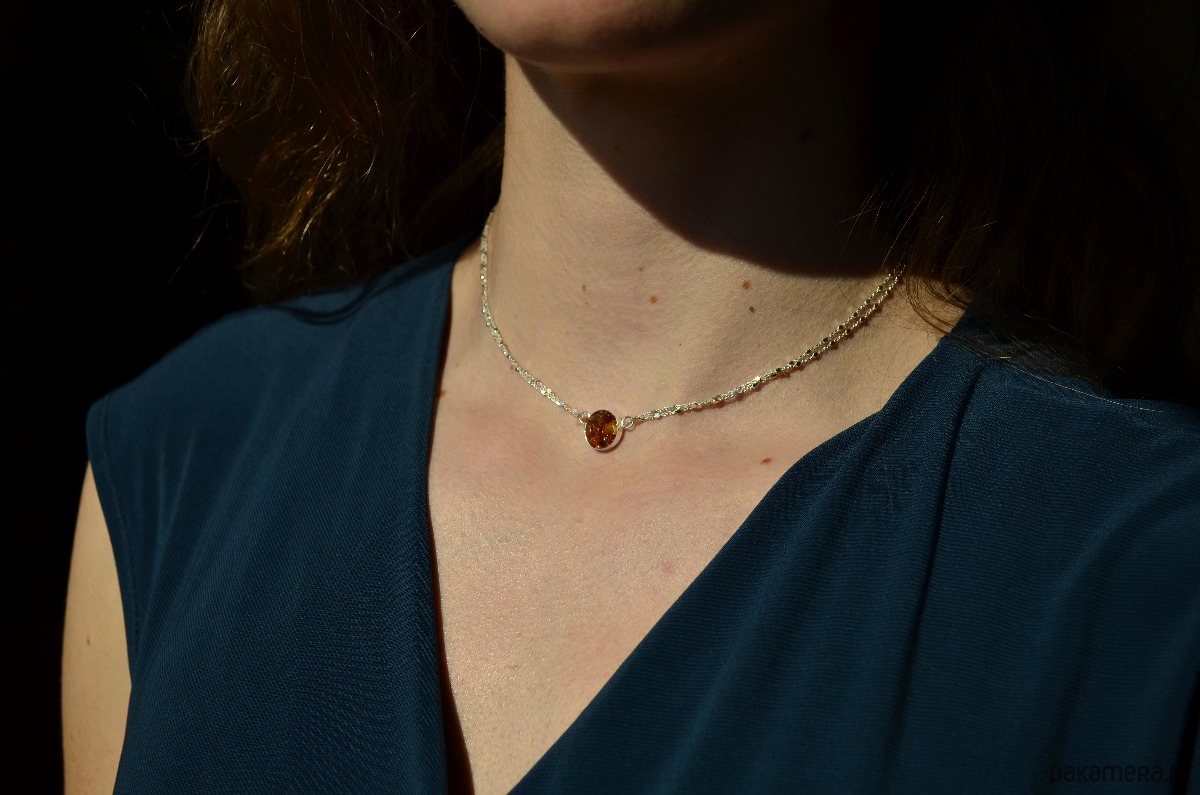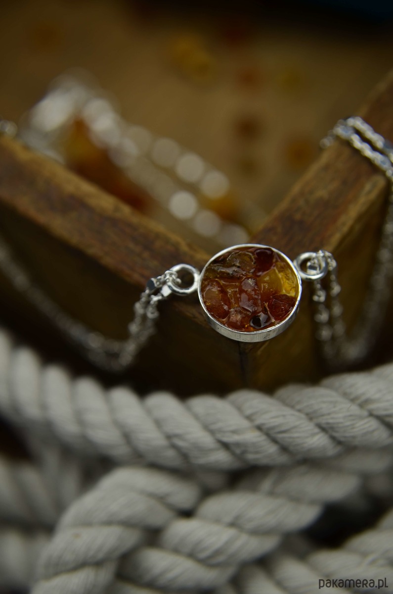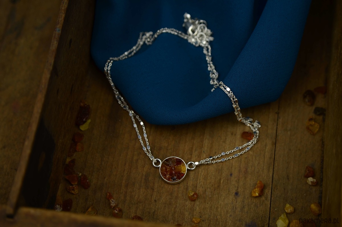 Delikatny krótki naszyjnik wykonany ze srebra próby 925 i kawałków surowego bursztynu bałtyckiego. Naturalne, zebrane z plaży bursztynki zamknęłam w srebrnym kole o średnicy 1 cm. Bursztynowe kółeczko zawieszone jest na podwójnym srebrnym łańcuszku z ozdobnymi kostkami. Bursztyny w naszyjniku mają różne ciepłe odcienie: od żółtego, poprzez pomarańczowy do brązu. Z uwagi na różne kształty i kolory bursztynu każda sztuka biżuterii różni się delikatnie od siebie.