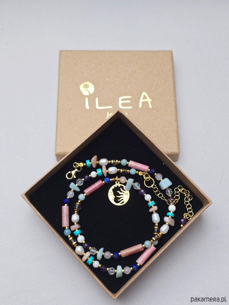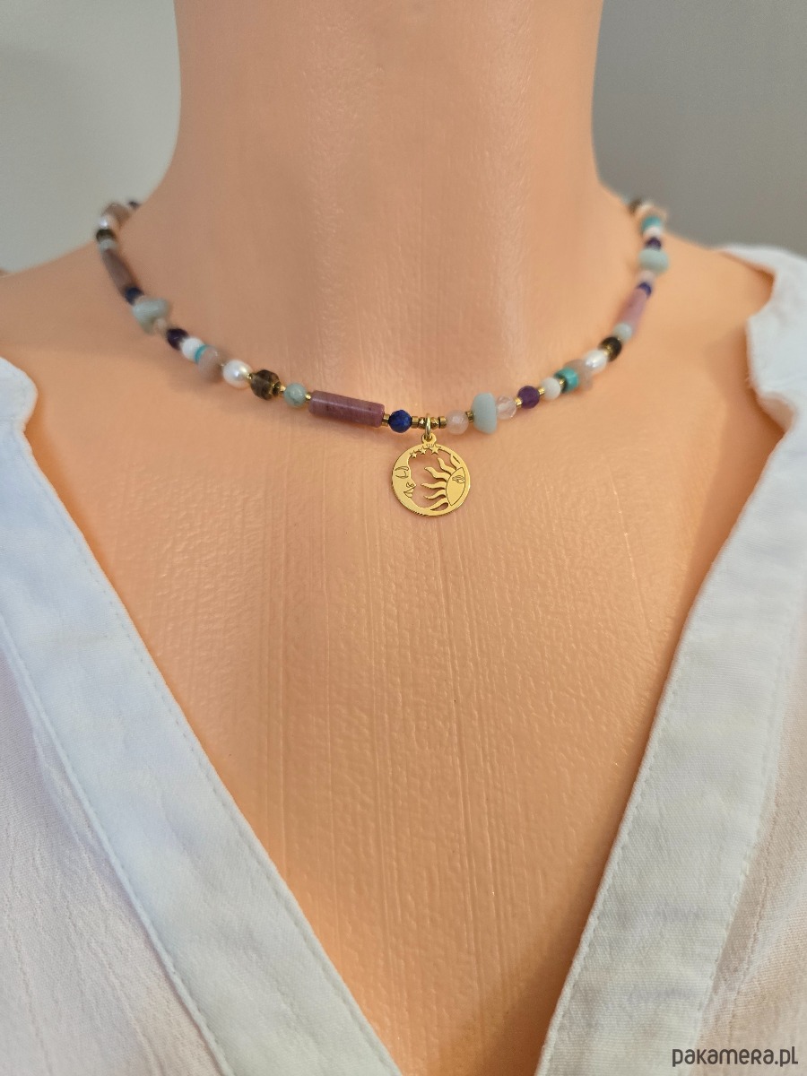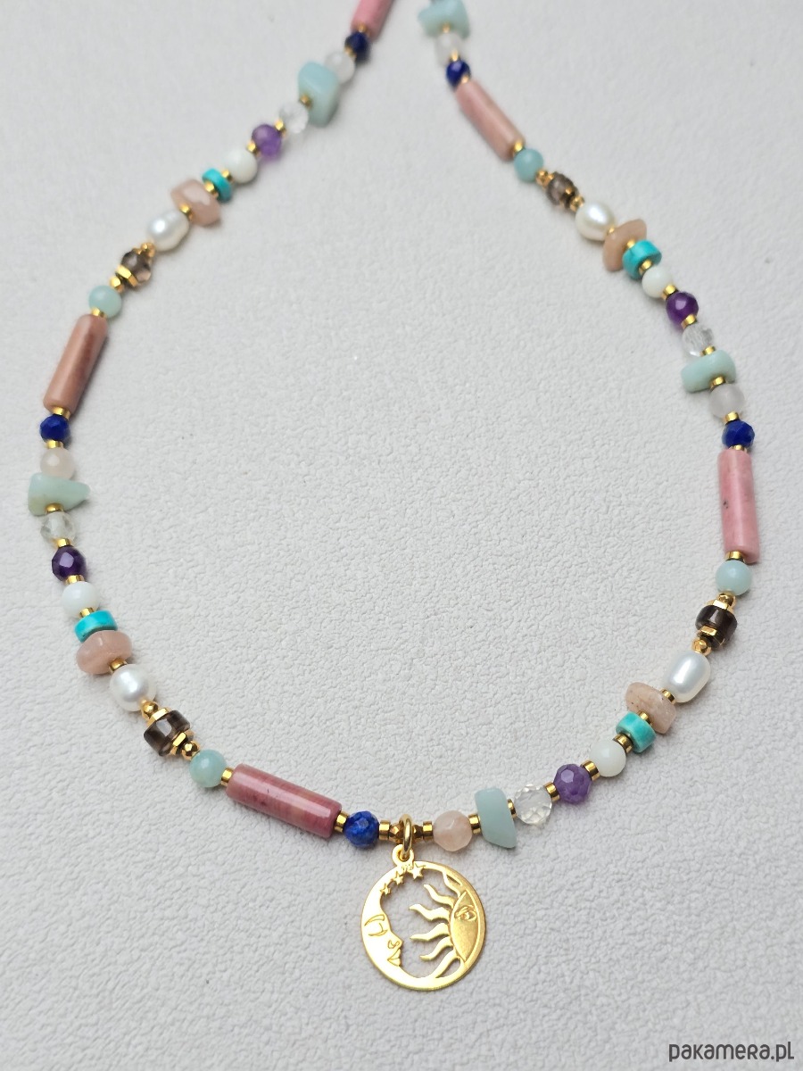 Piękny naszyjnik z kamieni naturalnych w pastelowej kolorystyce tj.: amazonit, kryształ górski, kwarc dymny i różowy, ametyst, koral, lapis lazuli, rodonit, perły, złocony hematyt.