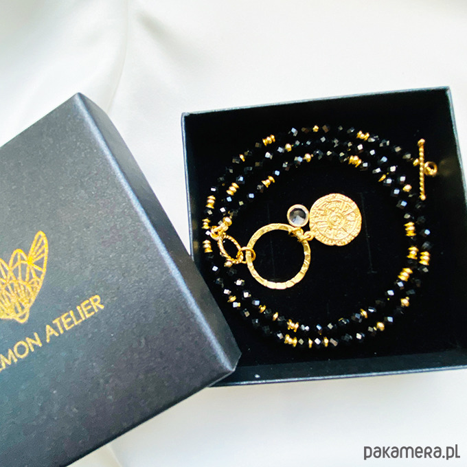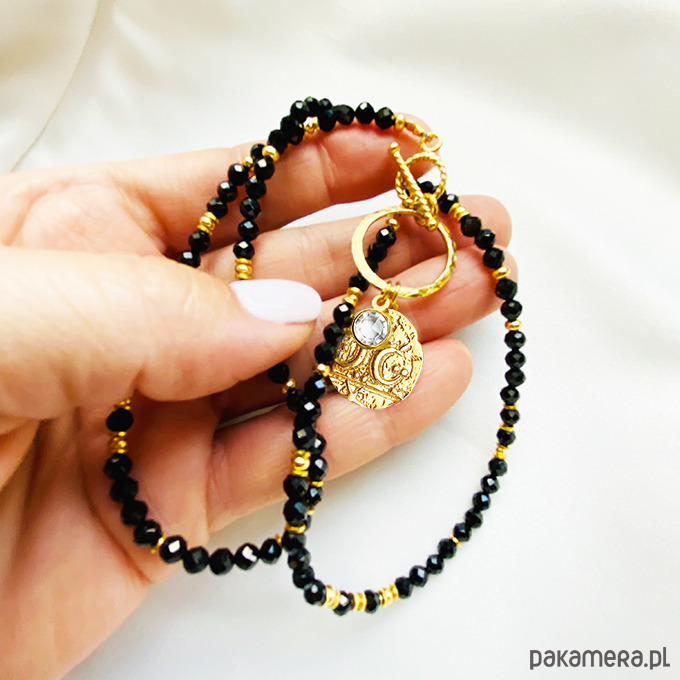Efektowny przepiękny naszyjnik skomponowany z naturalnych ręcznie dobranych czarnych kamieni Spineli ze złotym ozdobnym zapięciem i zawieszka stylizowana na monetę oraz kryształem górskim w oprawie.