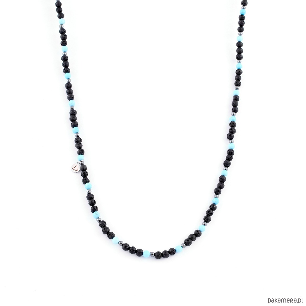 Każdy naszyjnik różni się nieco od siebie, ponieważ nie ma dwóch takich samych kamieni. Dla klienta wybieramy kamienie z wielką starannością, zawsze intuicyjnie.Wymiary: Kamienie: Lawa/Turkus/HematytWielkość kamieni: 4mm/4mm/3mmDługość: ok. 54 cm + ok. 5 cm regulacji Blaszka z logo: 6mm