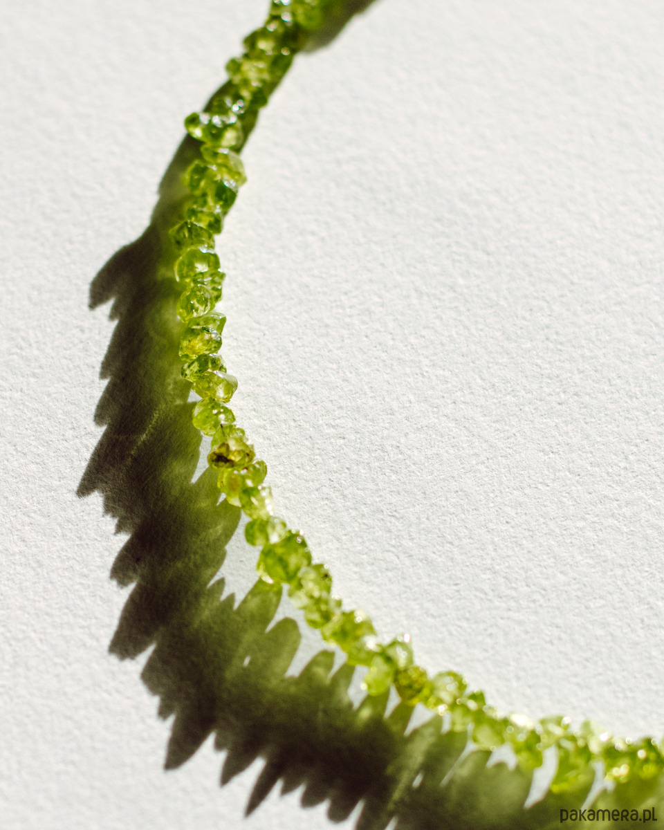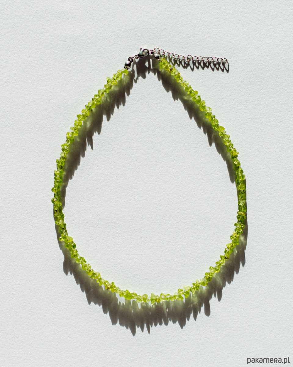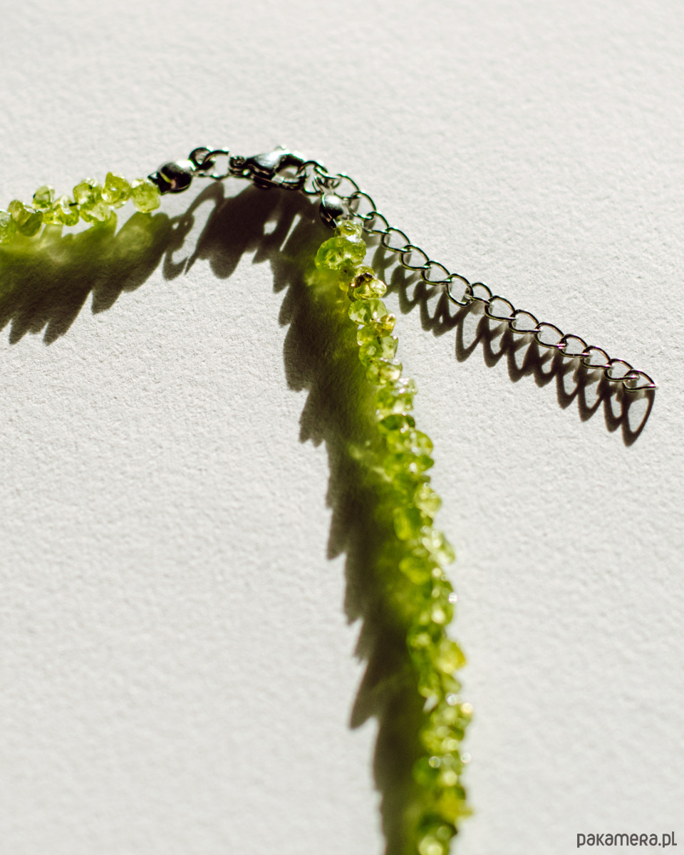 Krótki naszyjnik z oliwinu w pięknym zielonym kolorze. Naszyjnik wykonany z kamienia naturalnego, zapięcia ze stali chirurgicznej w kolorze ciemnego srebra.