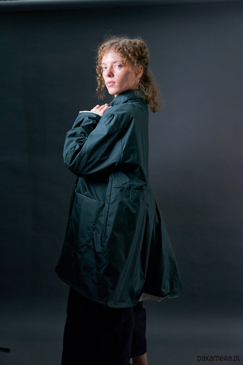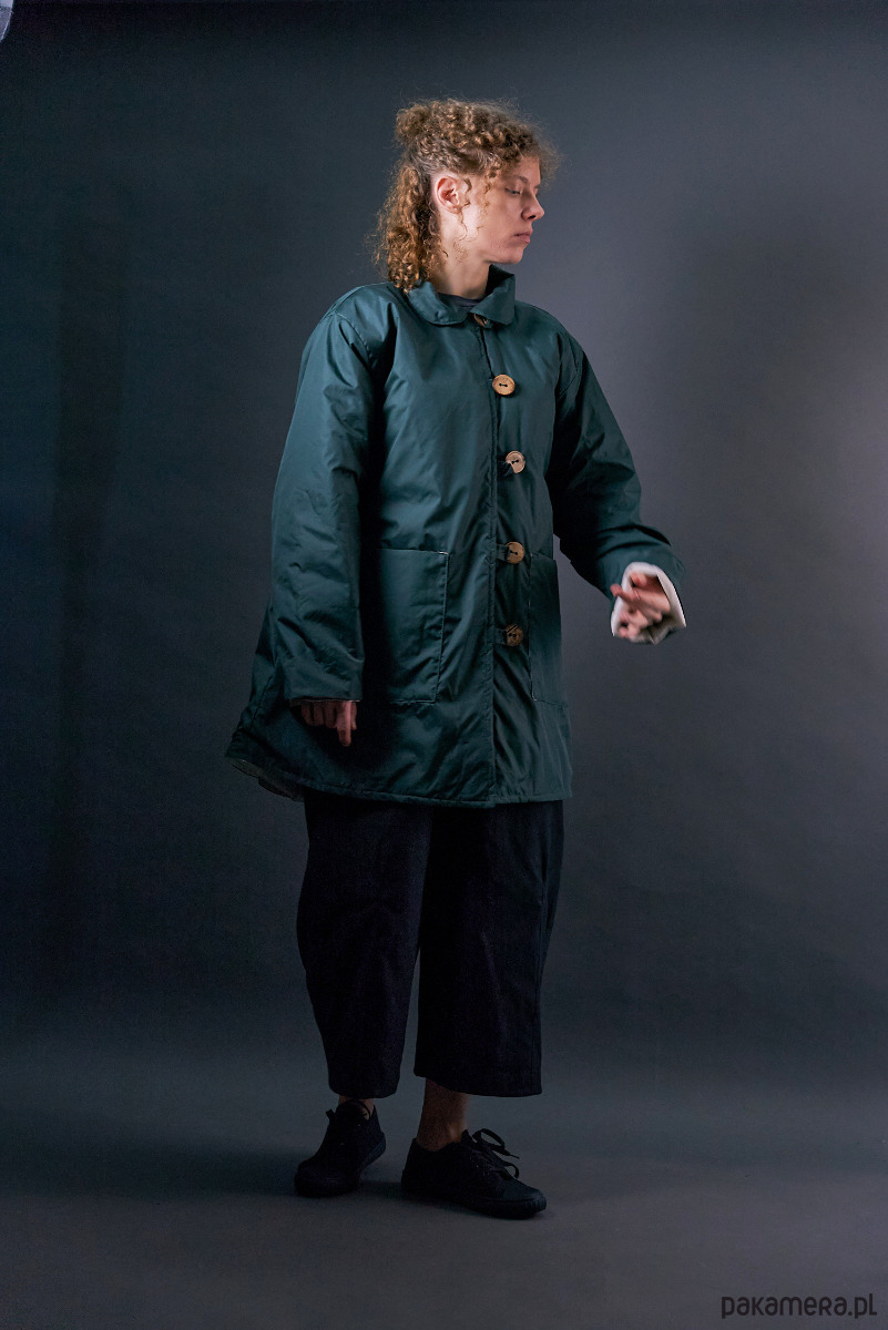 Krótki płaszczyk nabłyszczany ocieplanyw kolorze zieleni butelkowej