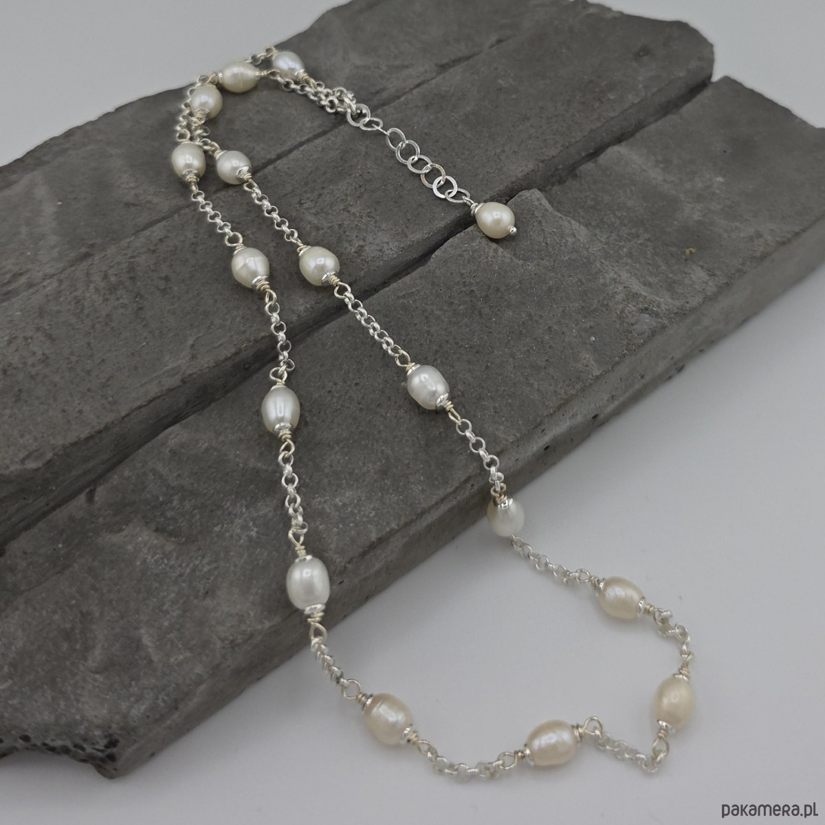 Kobiecy,subtelny, elegancki naszyjnik pasujacy do wszystkiego. Wykonany w całości ze srebra próby 925 oraz wysokiej jakosci białych, naturalnych pereł słodkowodnych wielkości ok. 0,6 cm. Solidny łańcuszek typu rolo o grubości 2,2 mm. Całkowita długość naszyjnika to ok. 42 cm plus przedłużka 2,5 cm. Na życzenie mogę go zoksydować. Ozdobnie zapakowany.