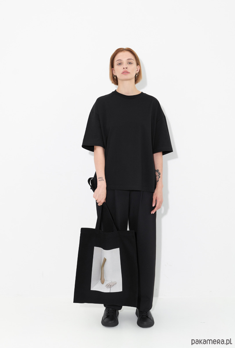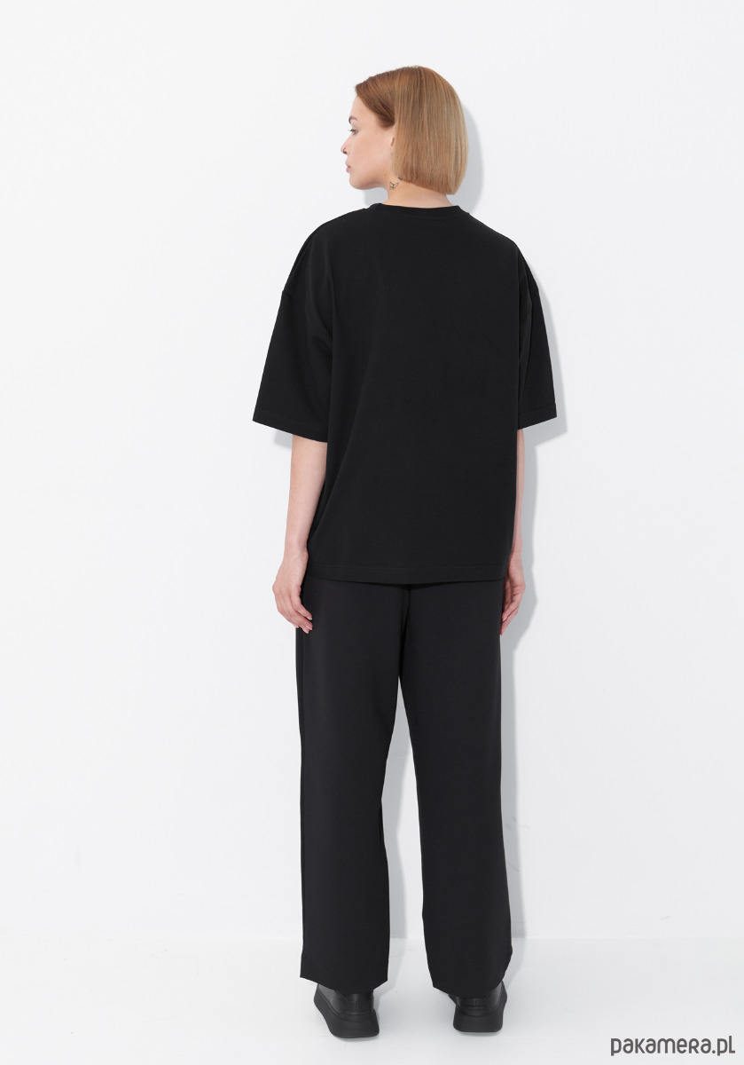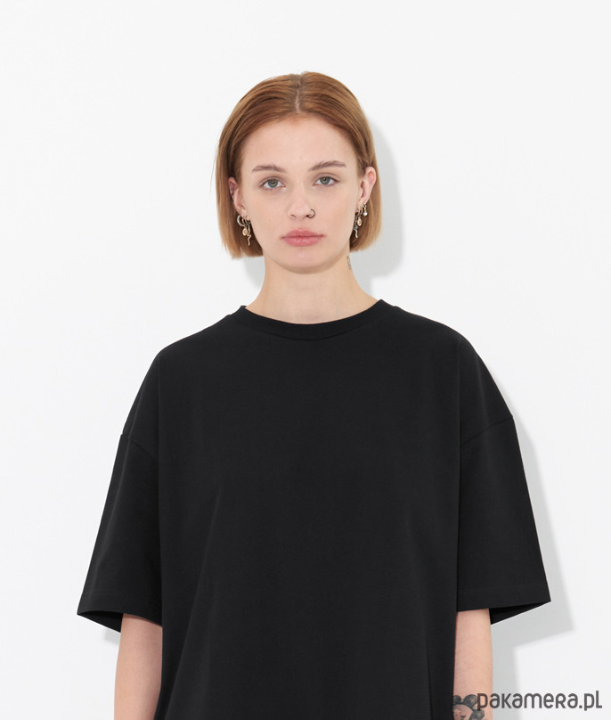 T-shirt jest w rozmiarze one size, który zachowuje formę oversize na sylwetkach o rozmiarze S, M oraz L.