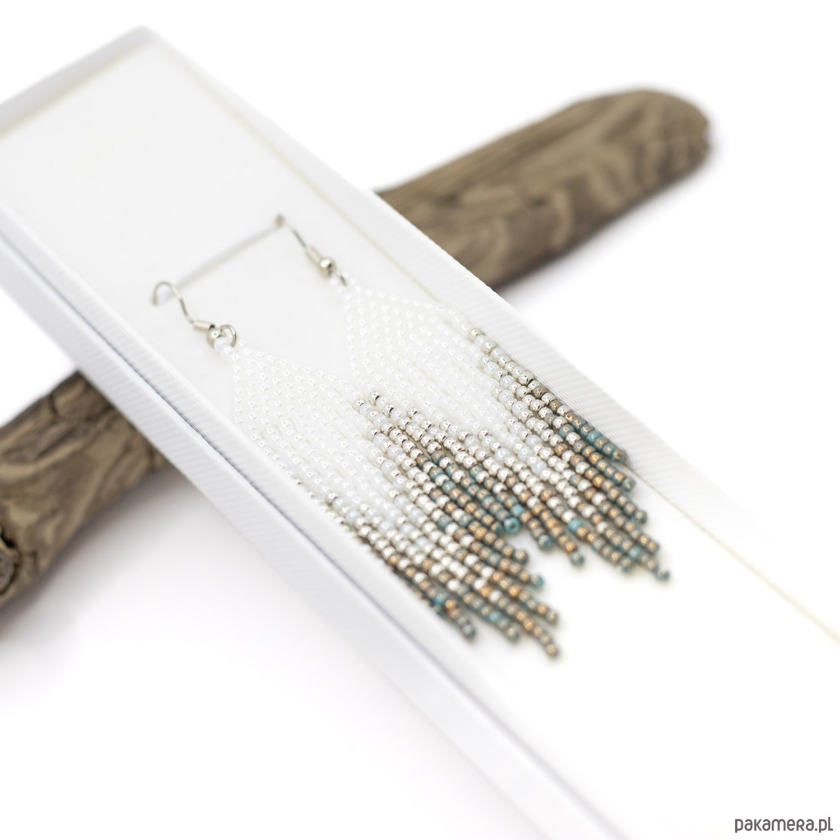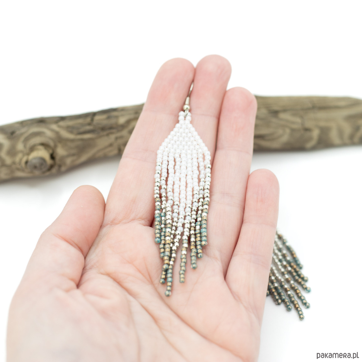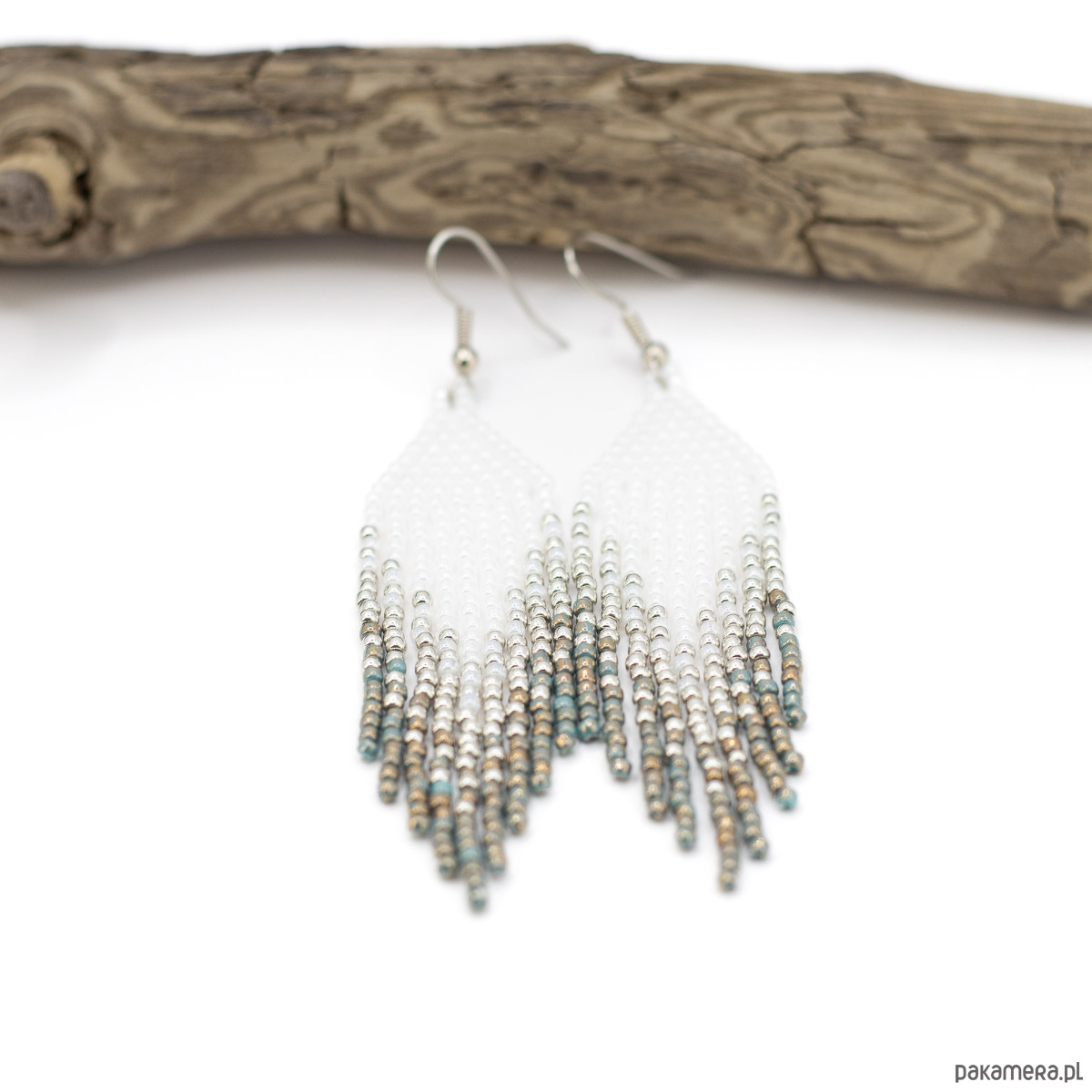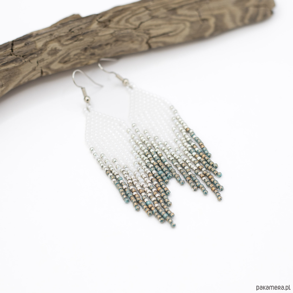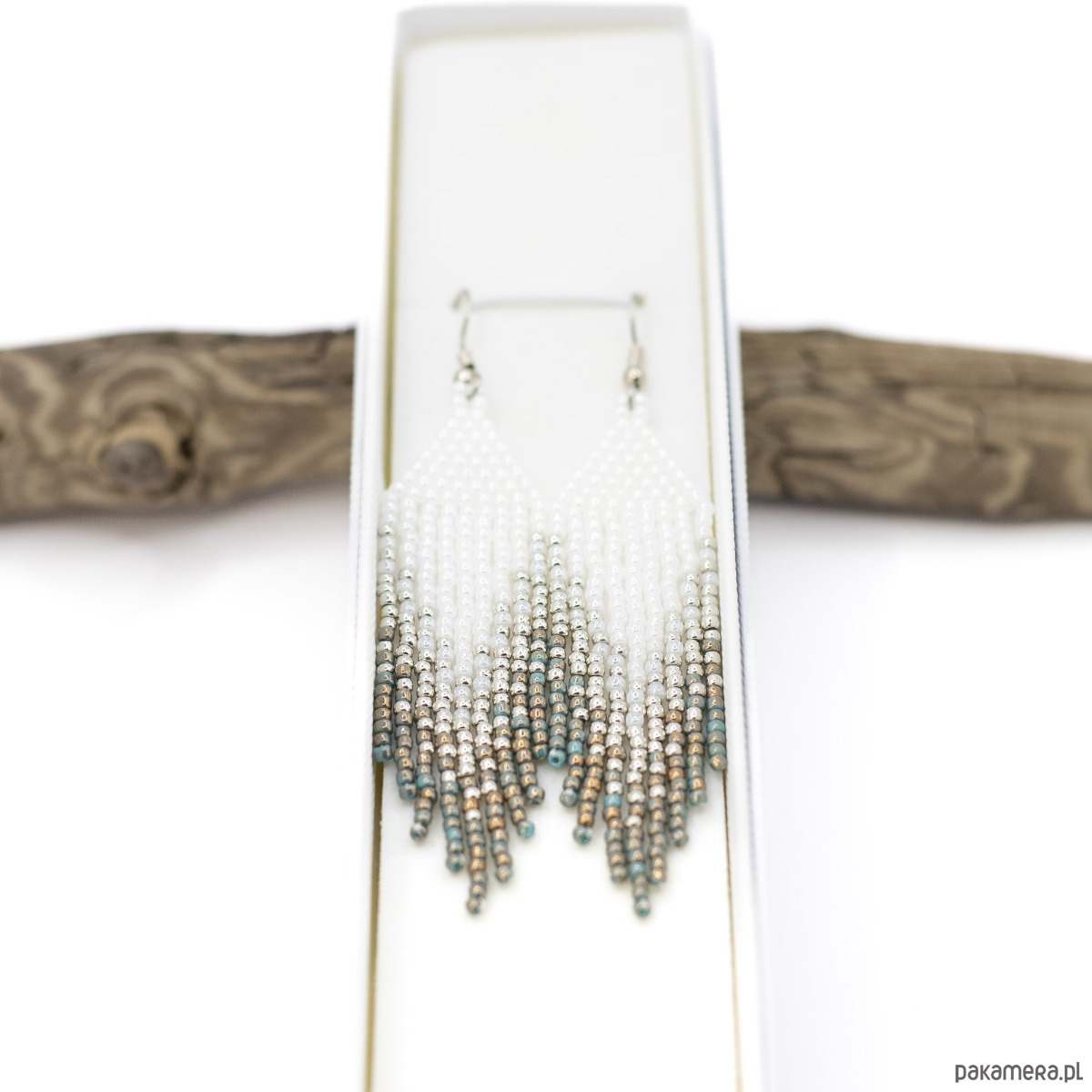 Krótkie kolczyki koralikowe cieniowane bielą, srebrem i antycznym turkusem ze złotym blaskiem