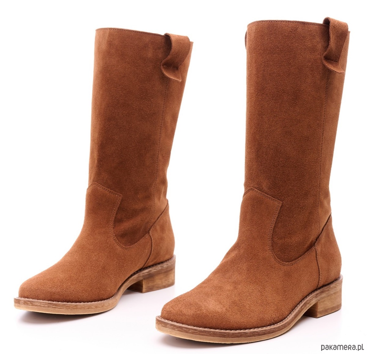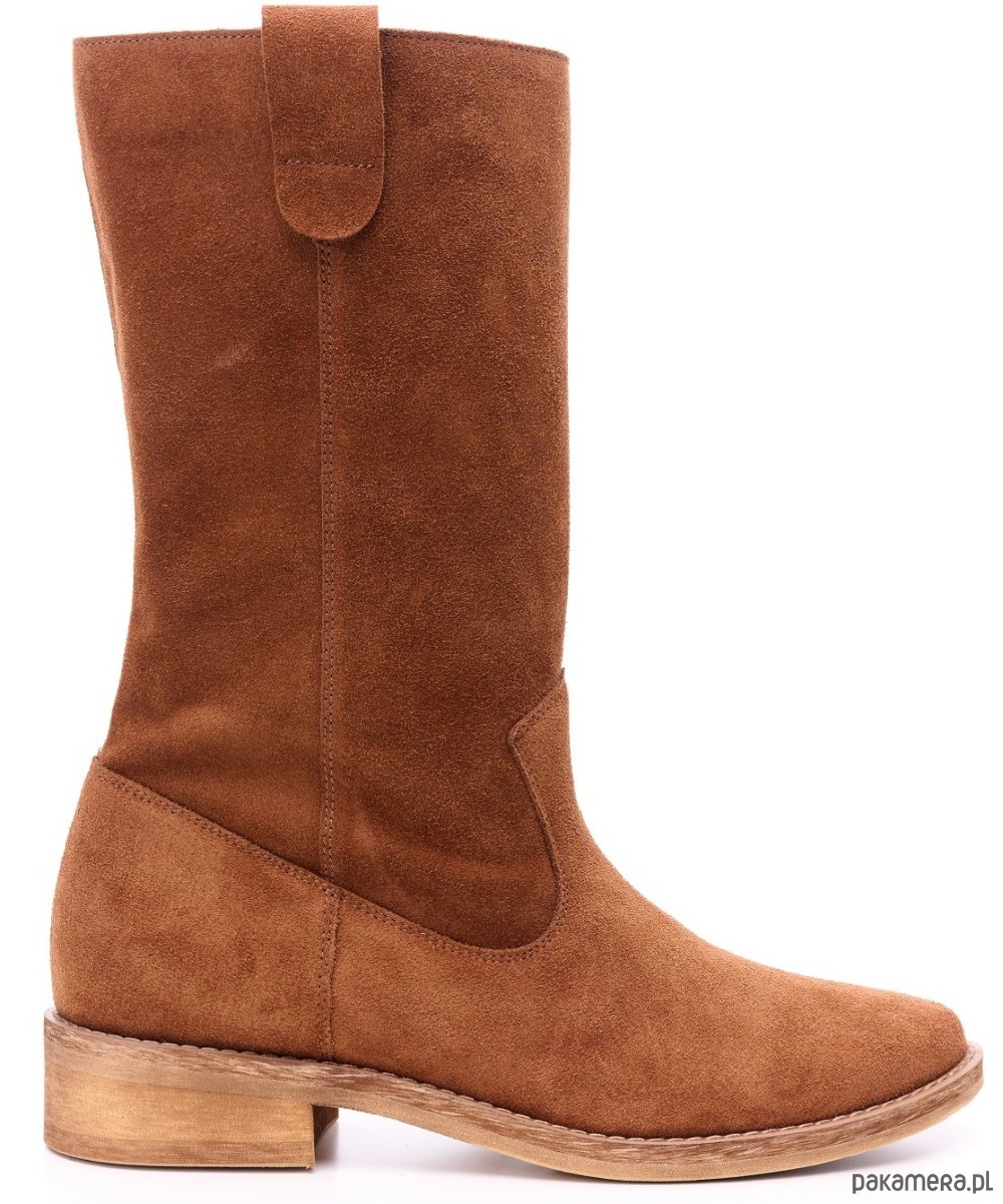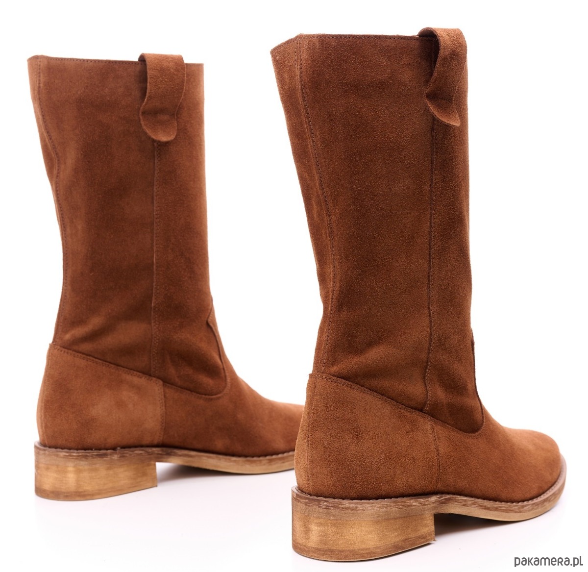 Krótkie kozaczki damskie na obcasie, wykonane ze skóry naturalnej, nubuku, miękkiej w dotyku. Buty wciągane, futrówka tylko na stopie.