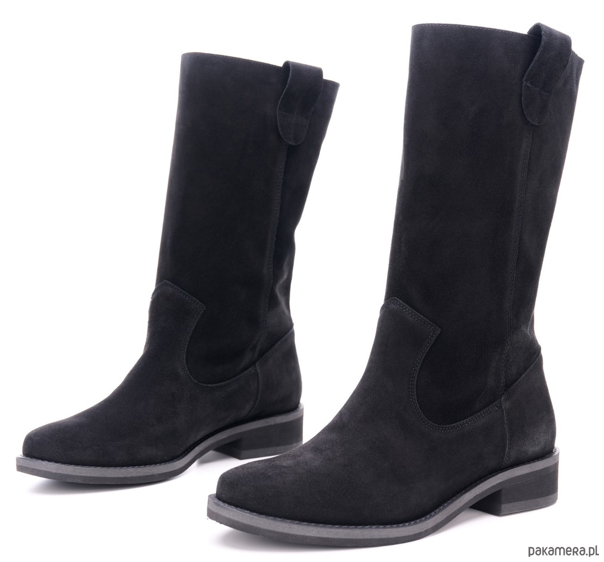 Krótkie kozaczki damskie na obcasie, wykonane ze skóry naturalnej, nubuku, miękkiej w dotyku. Buty wciągane, futrówka tylko na stopie.