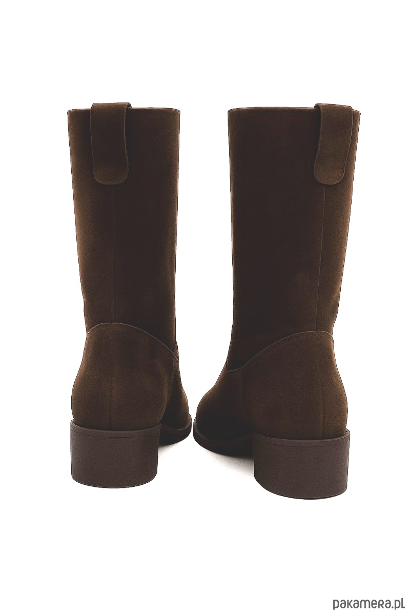 Krótkie kozaczki damskie na obcasie, wykonane ze skóry naturalnej, nubuku, miękkiej w dotyku. Buty wciągane, futrówka tylko na stopie.