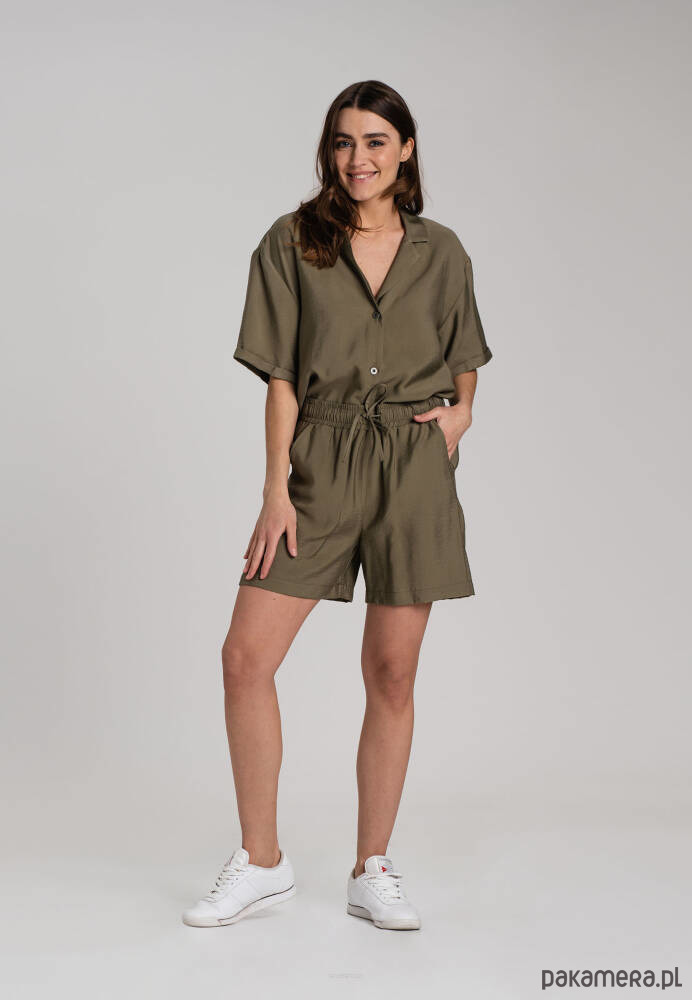 Doskonały letni komplet safari koszula i krótkie spodenki w stylu safari. Spodenki są szerokie, przewiewne, wykonane z wiskozy z tencelem, zebrane gumką w talii z dodatkowym troczkiem. Mają dwie boczne kieszenie.