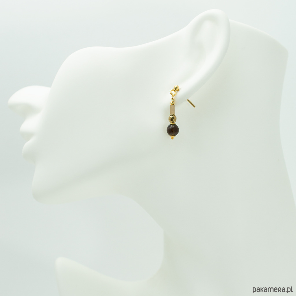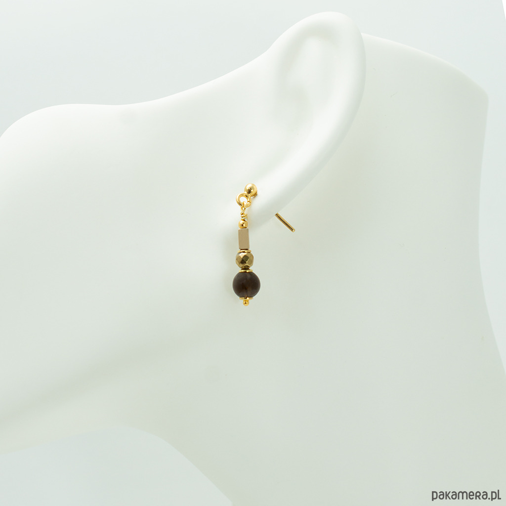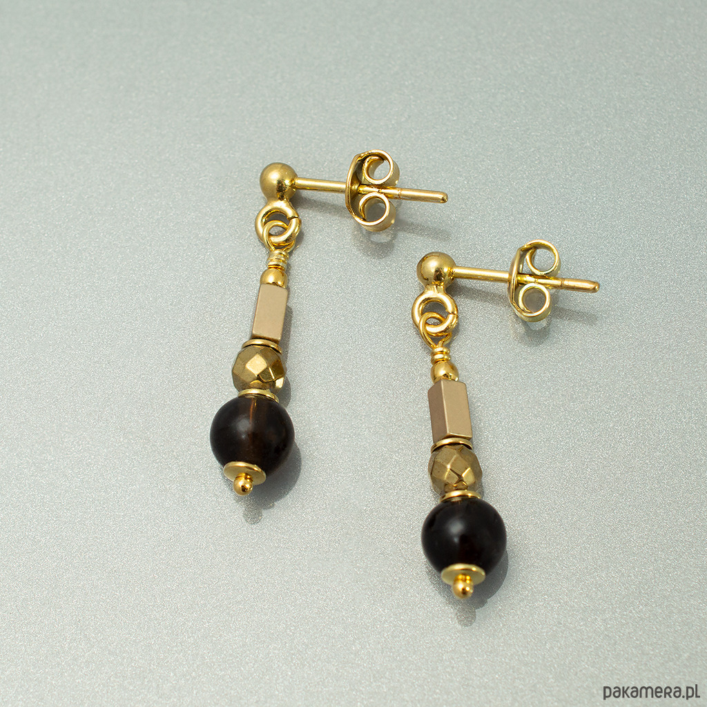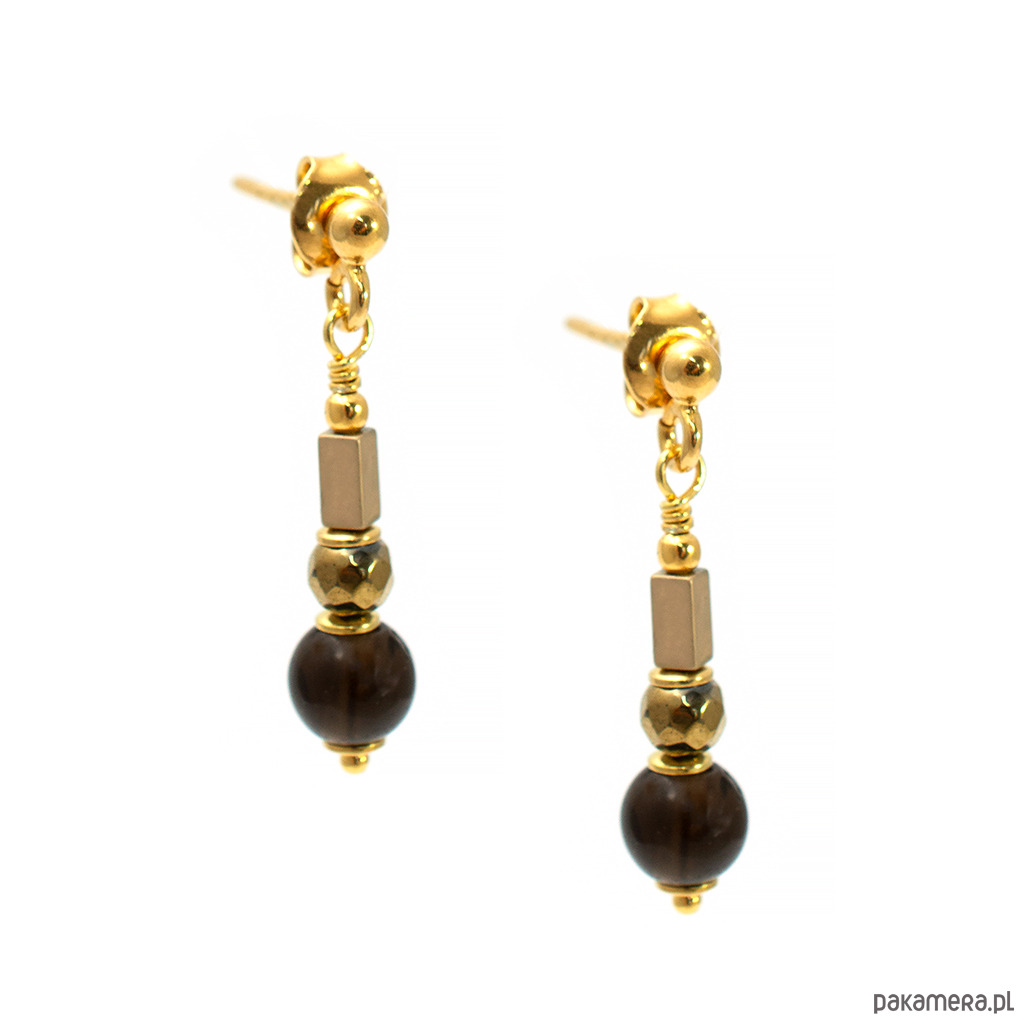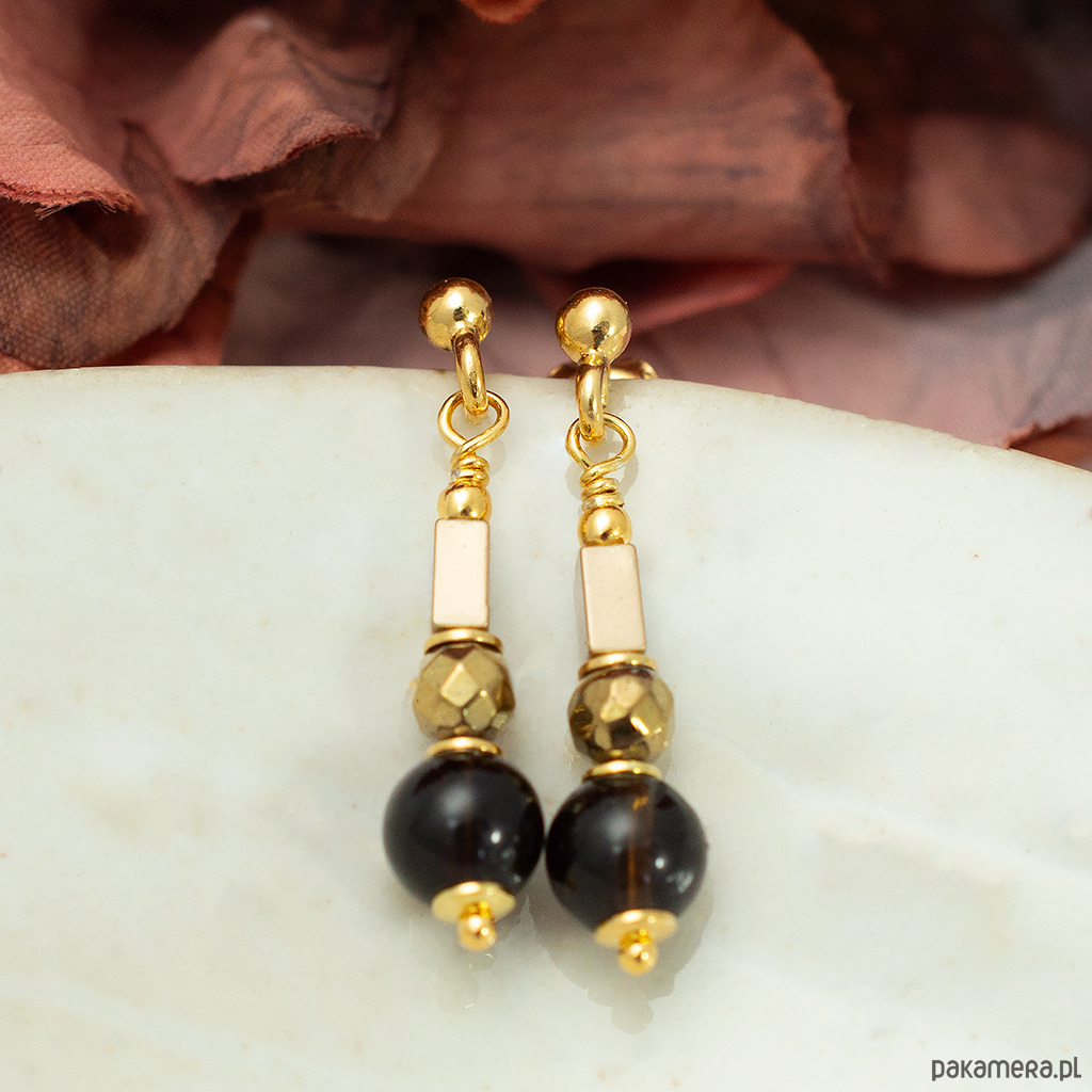 Eleganckie kolczyki z kwarcem dymnym i złoconym hematytem. Na wygodnych biglach sztyftach, dobrze trzymają się na uszach.