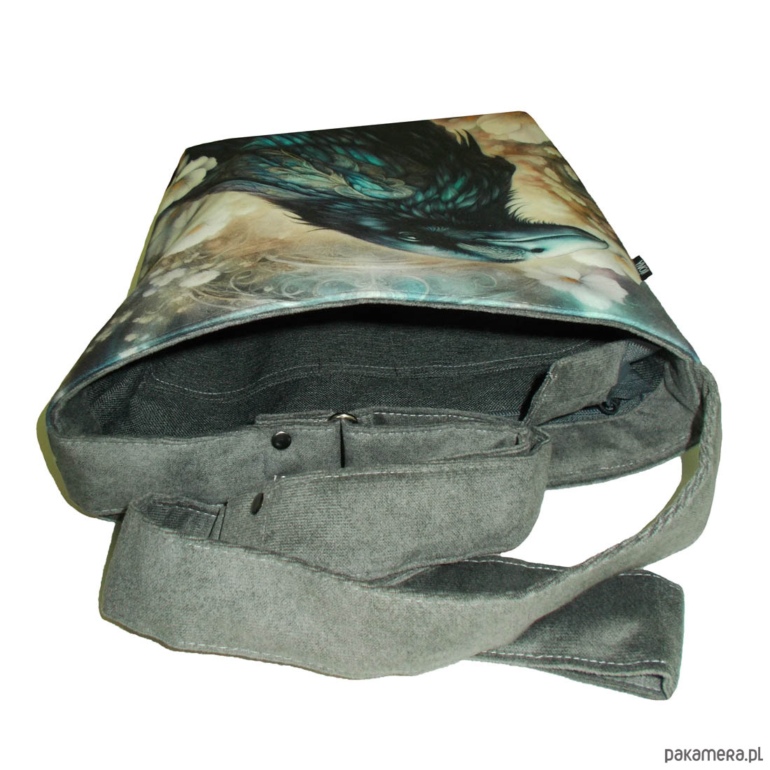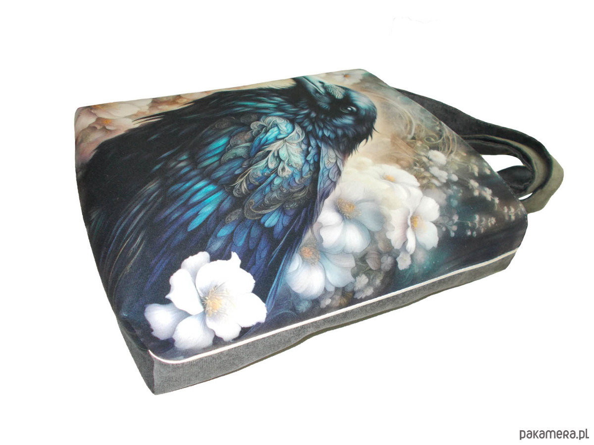 Autorska torba z usztywnionego eko zamszu, zapinana na zamek. Przód z weluru tapicerskiego. Pasek regulowany. Tył w korze paska (szary) Torba trzyma fason. Wewnątrz dwie kieszenie - jedna na zamek, druga z miejscem na telefon i coś jeszcze. W szwach wypustka. Denko poszerzone. szerokość 32cm wysokość 30cm plus denko 8cm