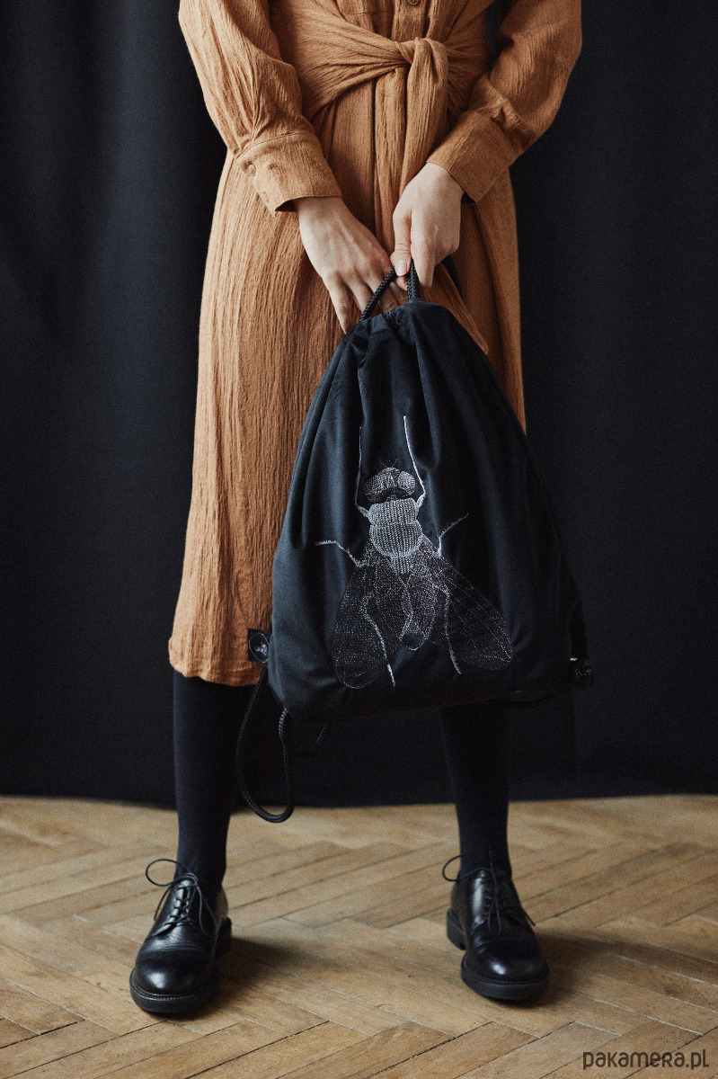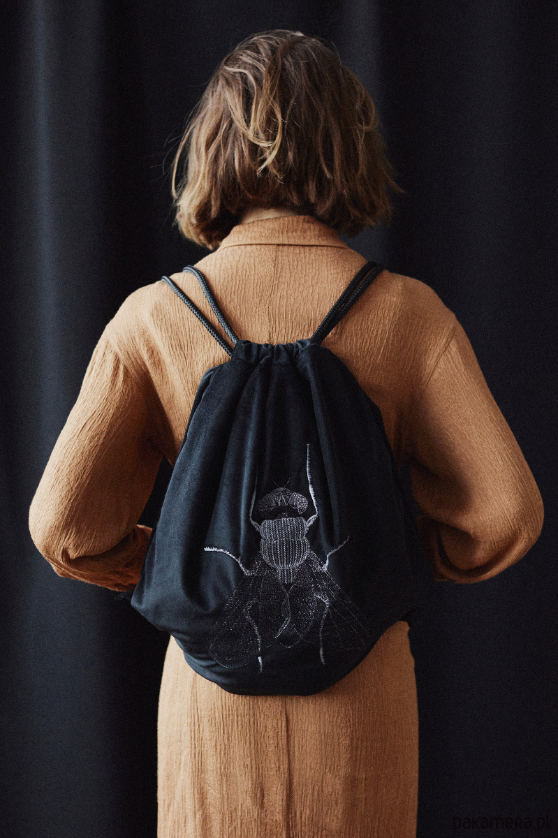 Niezwykły plecak w formie worka w kolorze głębokiej czerni. Dodatkowo zdobi go efektowny, autorski haft - MUCHA. Wzór wtapia się w tkaninę. Chociaż jest wyrazisty, nie jest przy tym nachalny. Subtelna elegancja. Plecak pasuje do wielu stylizacji.