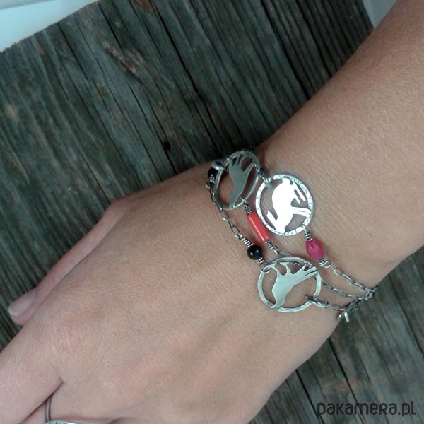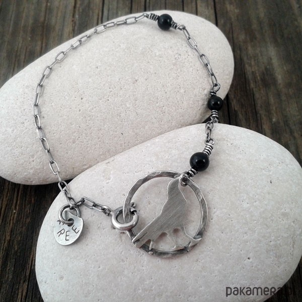 Delikatna bransoletka z ręcznie wyciętym krukiem w towarzystwie kuleczek onyksu i małej przywieszki z napisem Free. Wielkość zawieszki z ok 2cm Srebro oksydowane pr 925. Długość 16cm. (mogę dostosować)