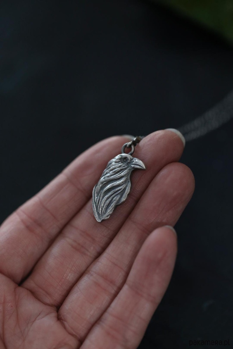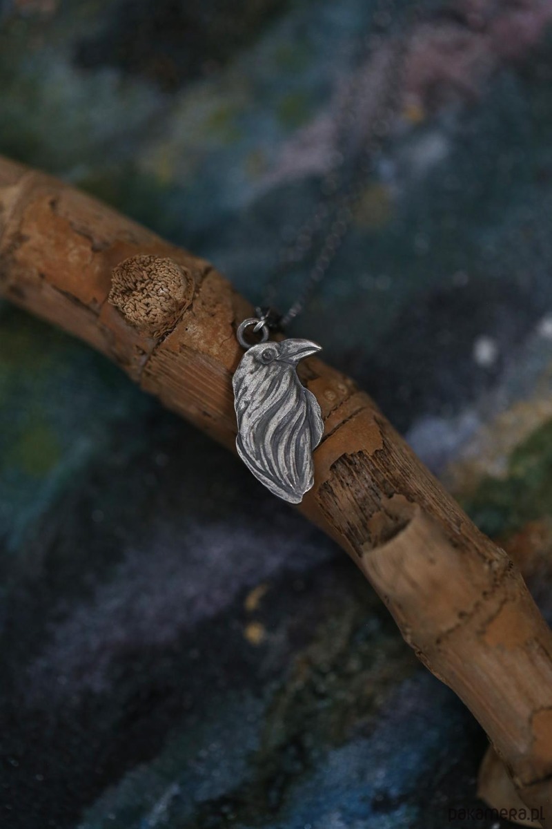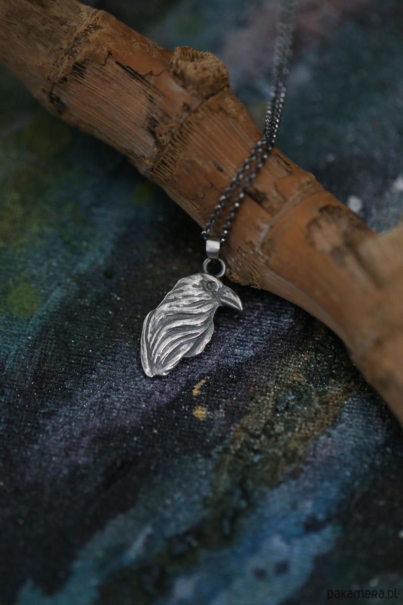 Wisior z krukiem wykonany ze srebra próby 925 + srebrny łańcuszek z przedłużką.