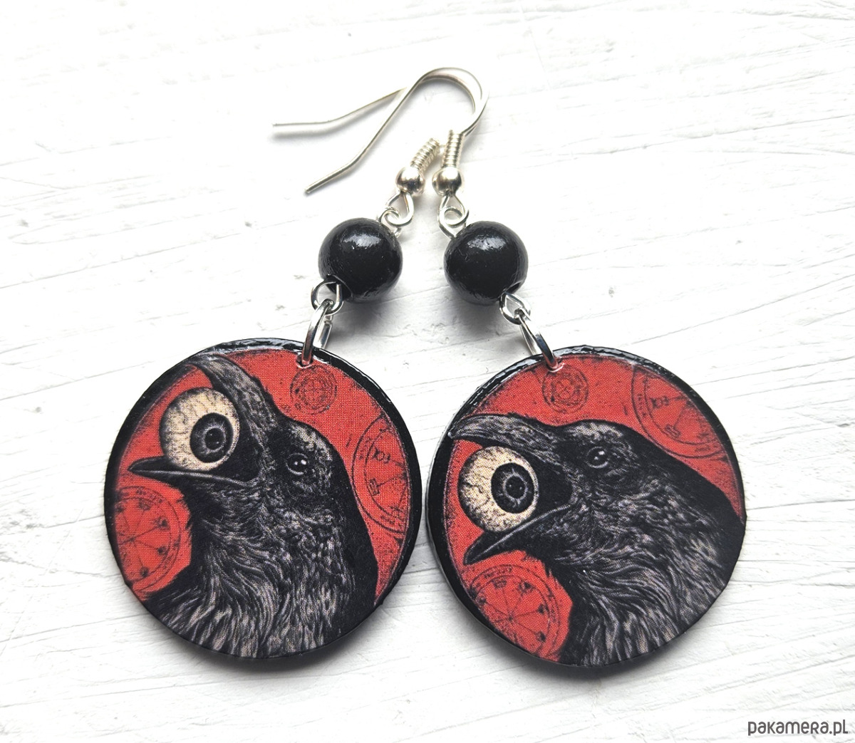 kolczyki drewniane, ozdobione metodą decoupage, dwustronne, starannie wykończone farbami akrylowymi i zabezpieczone wielokrotnie lakierem, bigle posrebrzane, długość kolczyków bez bigli: 4,5 cm, średnica: 3 cm, bardzo lekkie