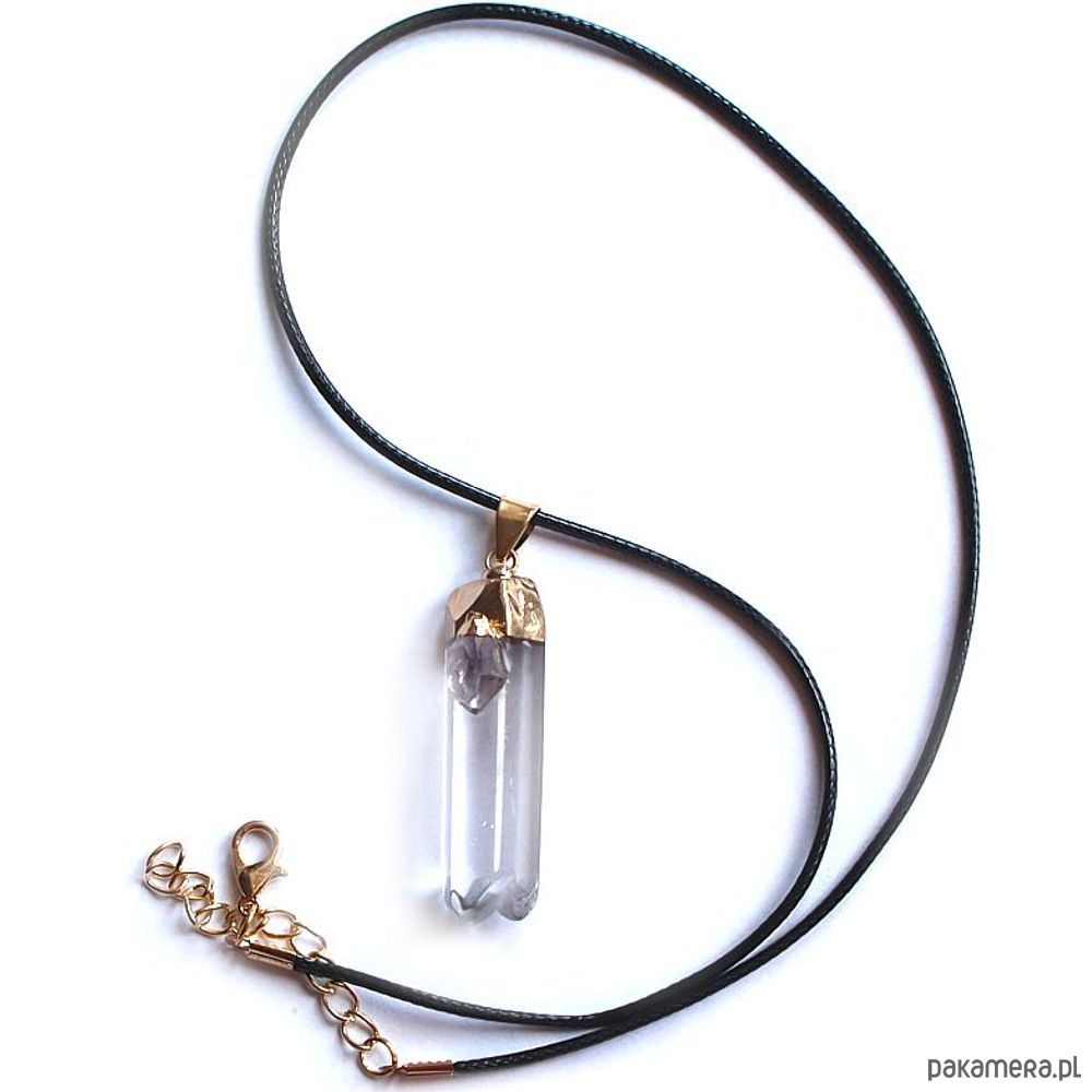 Energetyczny talizman oczyszczający wykonany z surowego kryształu górskiego i ametystu w pozłacanej oprawie na czarnym rzemyku z eko skórki. Oczyszczony, zregenerowany, napełniony energią czystego światła o najwyższej wibracji.