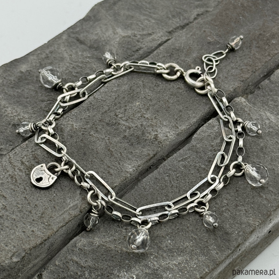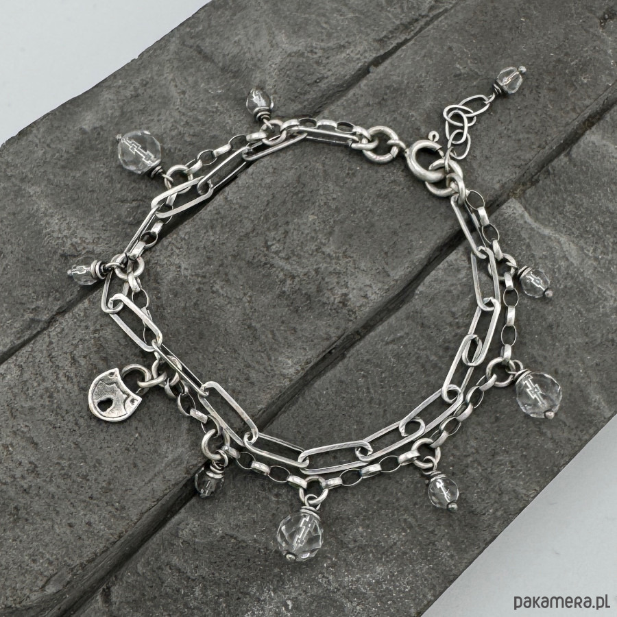 Delikatna, kobieca i wyjątkowa bransoletka na co dzień i nie tylko. Wykonana w całości z oksydowanego srebra próby 925 oraz fasetowanych kulek kryształu górskiego wielkości ok. 6 i 4 mm. Ozdobiona zawieszka w kształcie kłódki. Całkowita długość bransoletki regulowana od 18 cm do 20 cm. Na życzenie przedłużę. W mojej galerii kolczyki i naszyjnik do kompletu. Ozdobnie zapakowana.