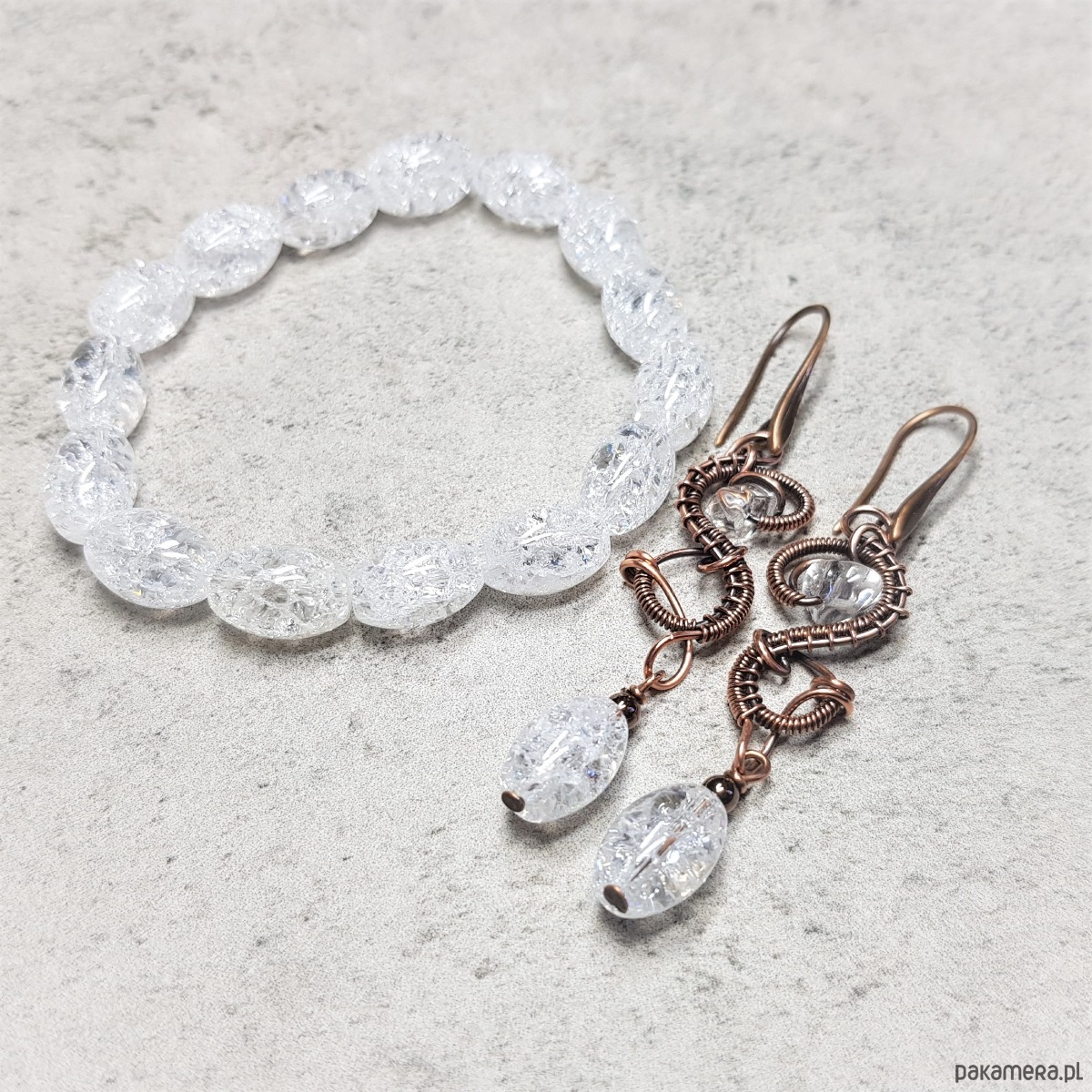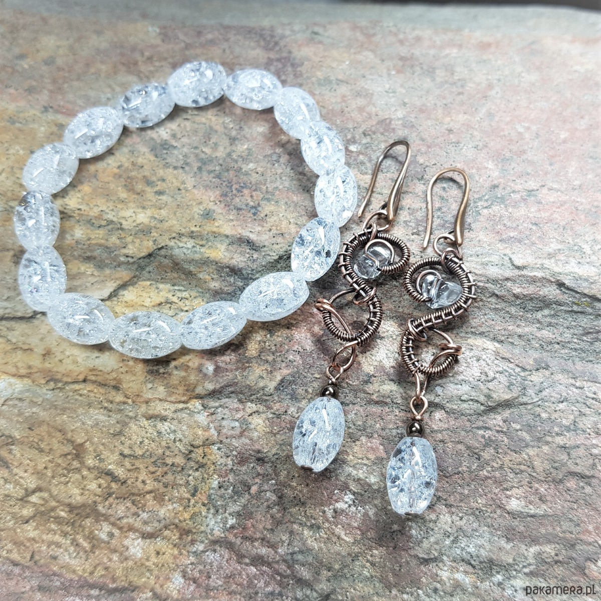 Kolczyki i bransoletka wykonane ręcznie metodą wire-wrappingu z lodowego kryształu górskiego w kształcie oliwki. Do wykonania wisiorka użyłam miedzianego drutu który następnie przyciemniłam oksydą i wypolerowałam w celu uzyskania efektu szlachetnego postarzenia . Kolczyki mają długość około 68mm, natomiast bransoletka pasuje na nadgarstek 17-18 cm. m98