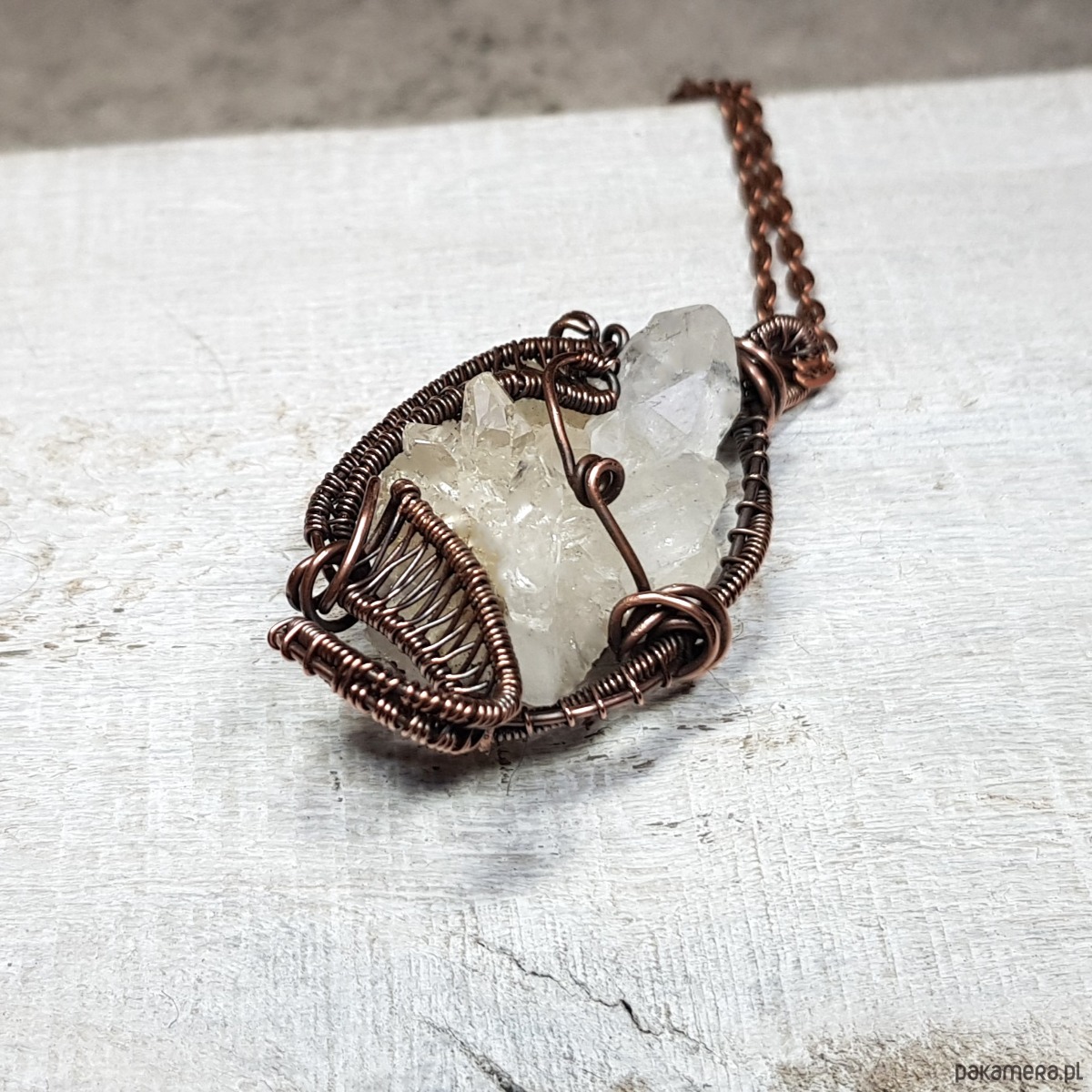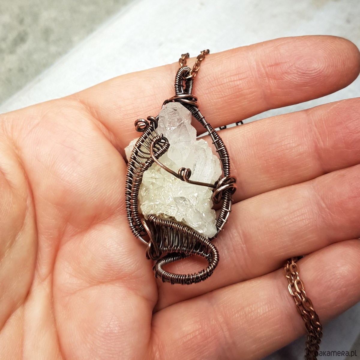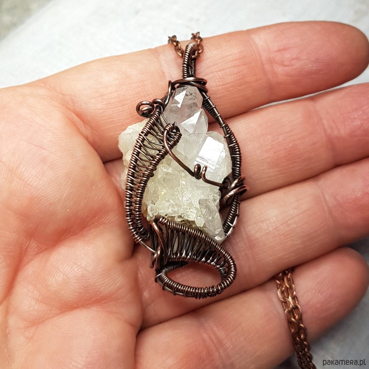 Zawieszka wykonana ręcznie metodą wire-wrappingu z kryształu górskiego w kształcie pięknej kryształowej szczotki z wieloma naturalnymi wznoszącymi się obok siebie pięknie połyskującymi szpicami. Do wykonania wisiorka użyłam miedzianego drutu który następnie przyciemniłam oksydą i wypolerowałam w celu uzyskania efektu szlachetnego postarzenia . Zawieszka ma wymiary 50x25mm z łańcuszkiem długości około 48-50 cm .