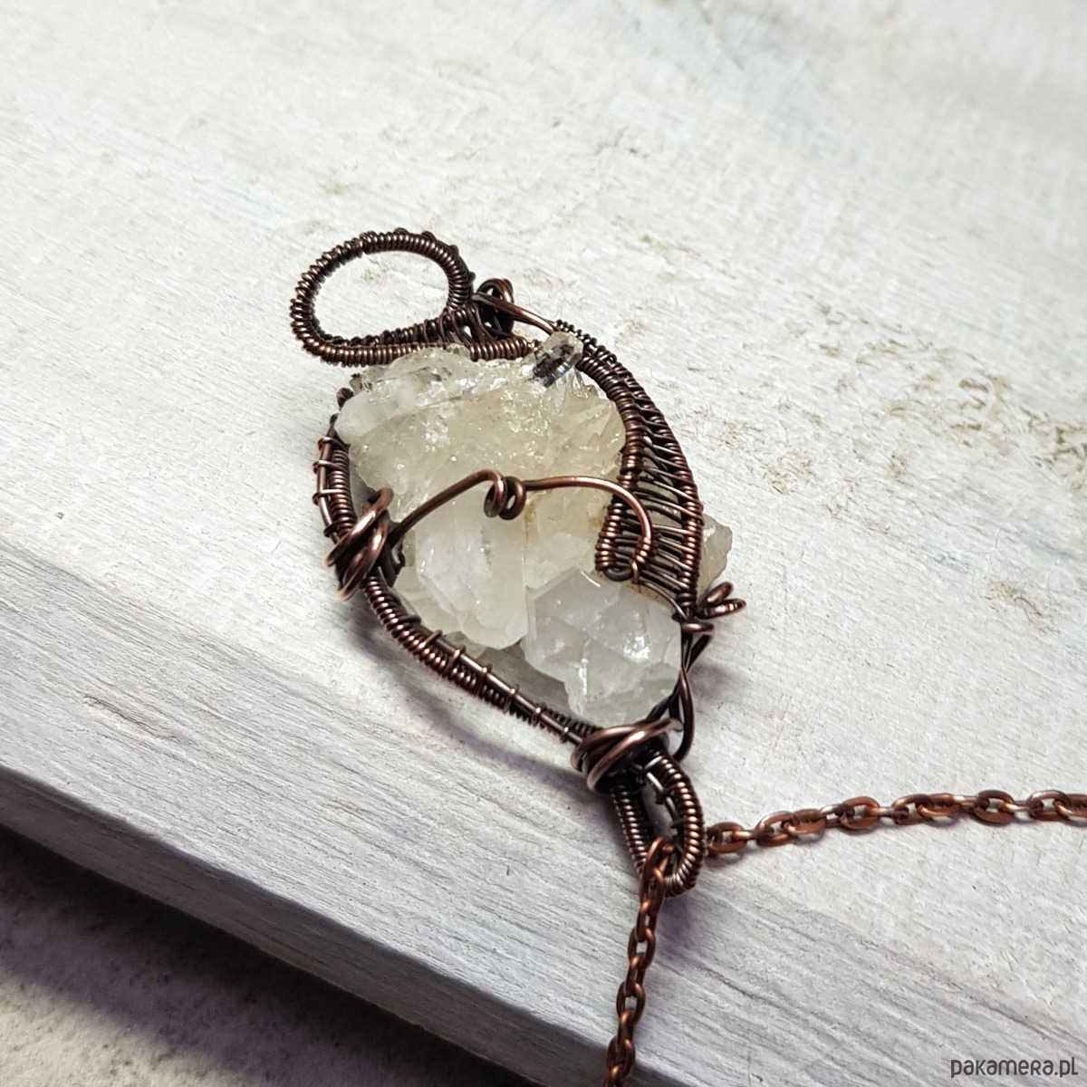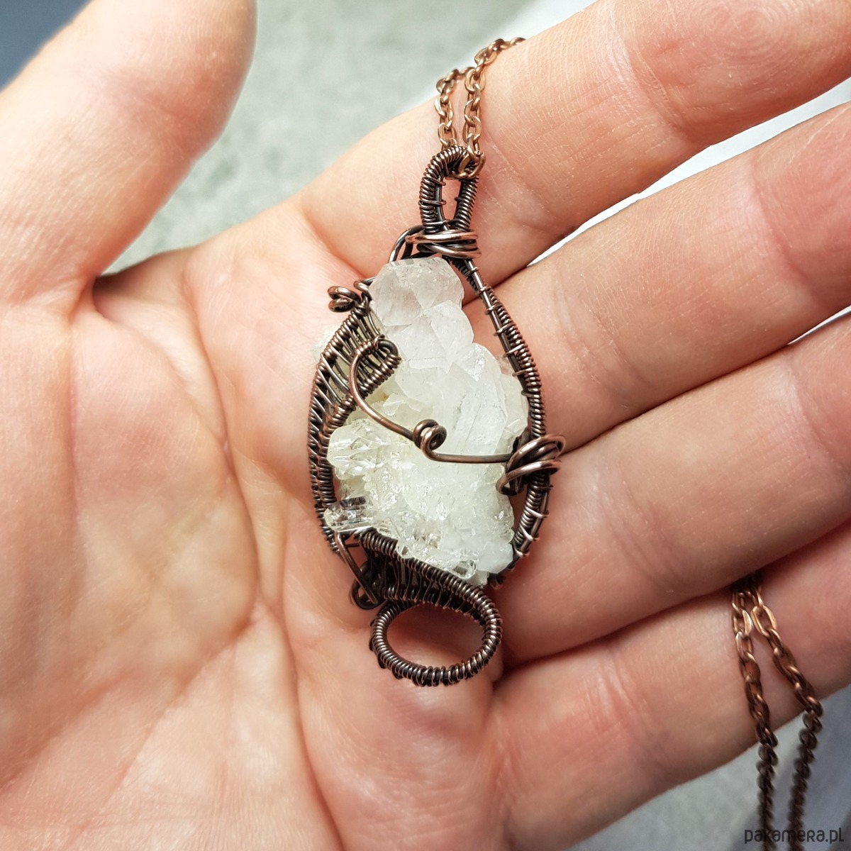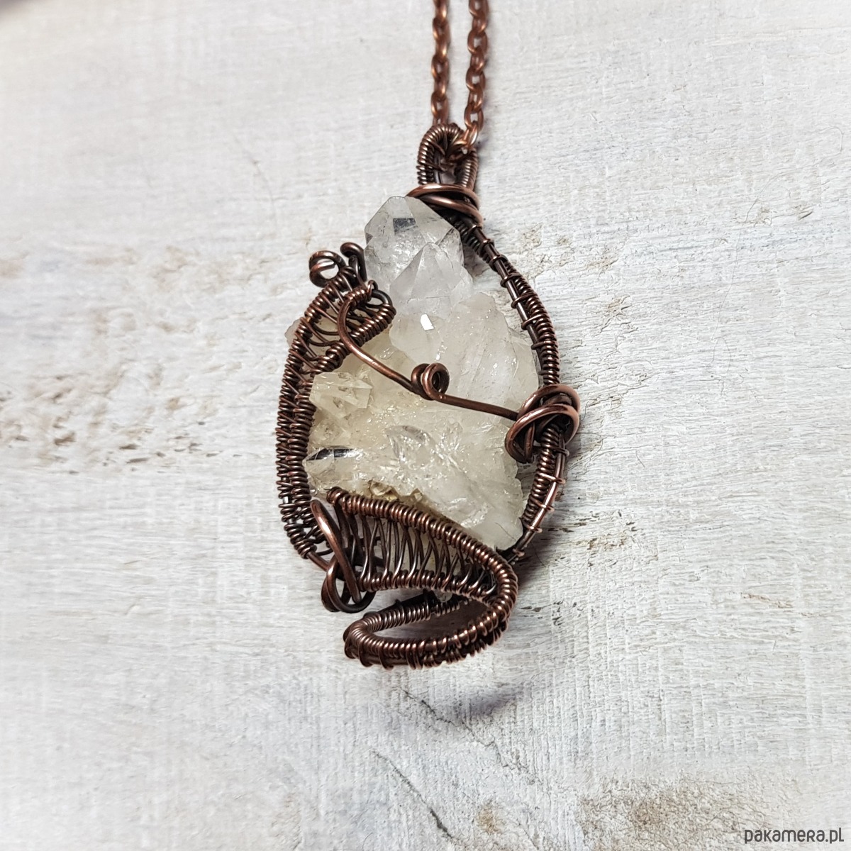 Zawieszka wykonana ręcznie metodą wire-wrappingu z kryształu górskiego w kształcie pięknej kryształowej szczotki z wieloma naturalnymi wznoszącymi się obok siebie pięknie połyskującymi szpicami. Do wykonania wisiorka użyłam miedzianego drutu który następnie przyciemniłam oksydą i wypolerowałam w celu uzyskania efektu szlachetnego postarzenia . Zawieszka ma wymiary 50x25mm z łańcuszkiem długości około 48-50 cm .