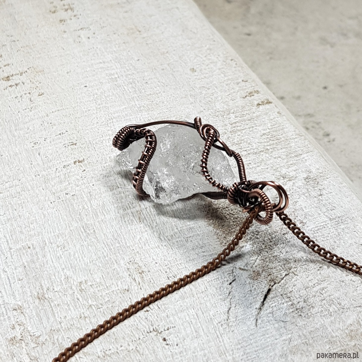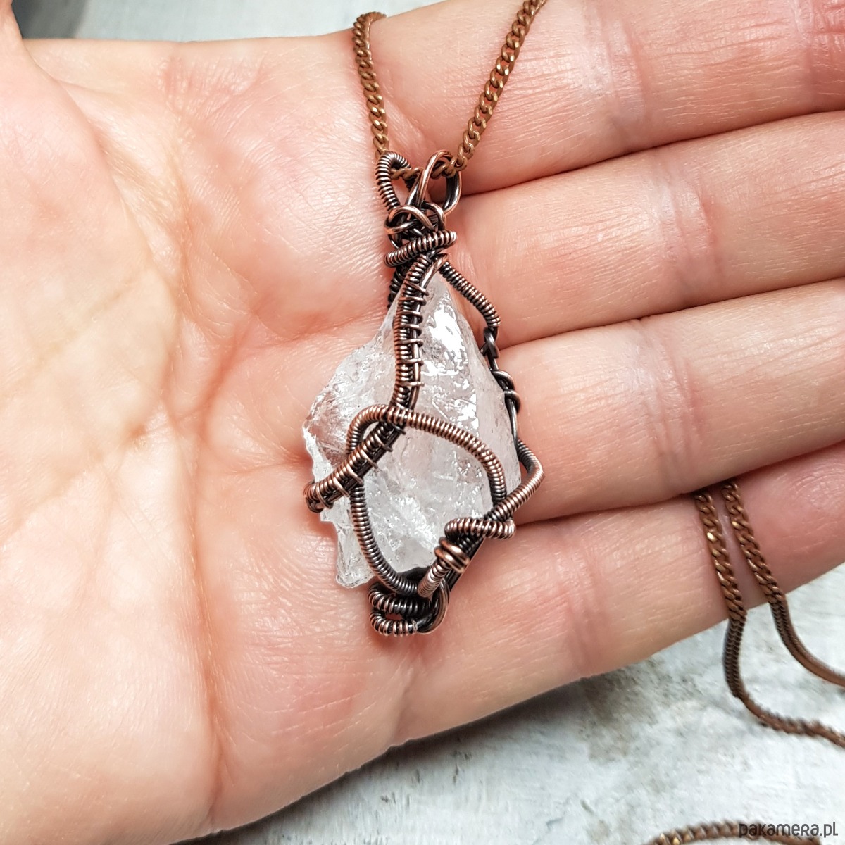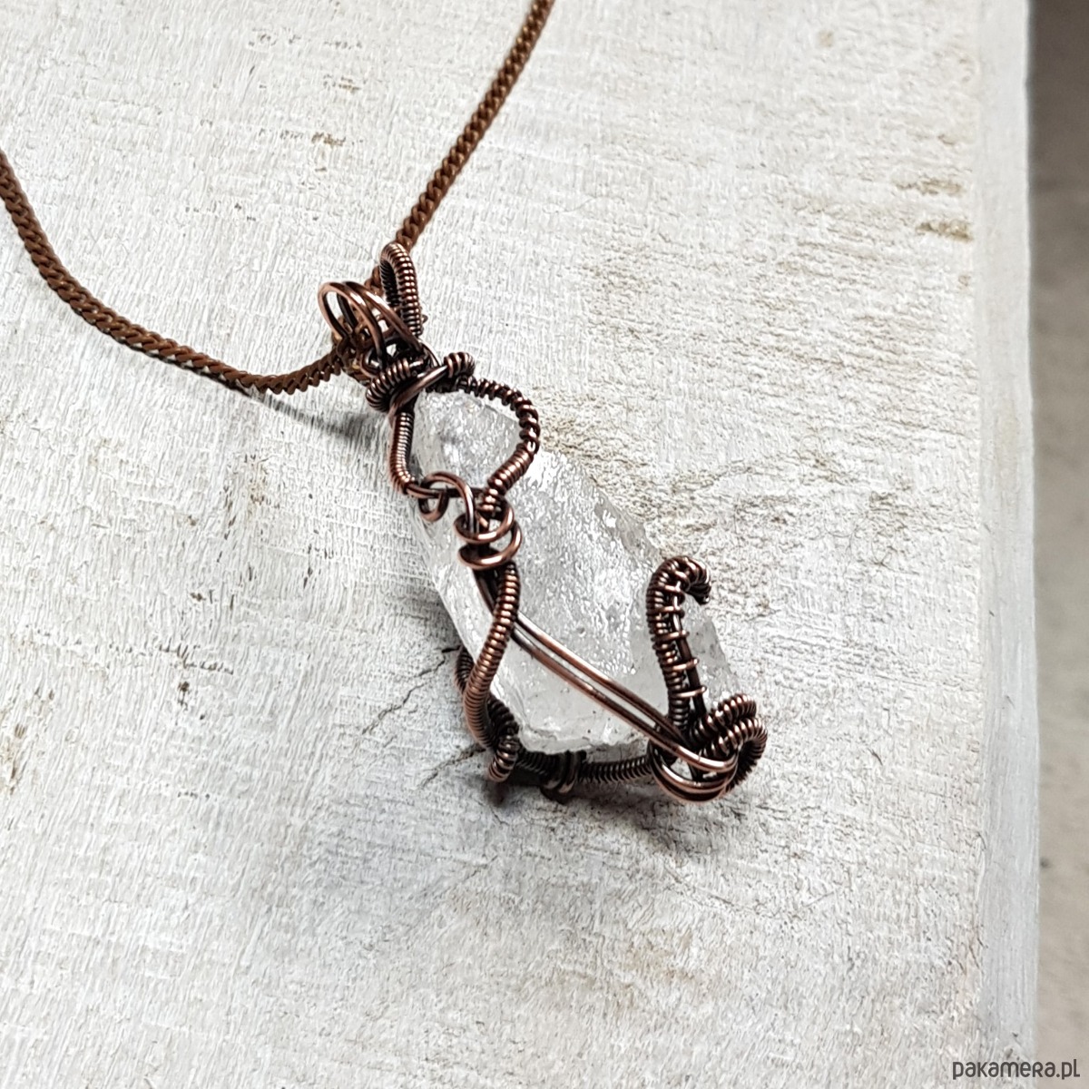 Dwustronna zawieszka wykonana ręcznie metodą wire-wrappingu z bryłki kryształu górskiego. Do wykonania wisiorka użyłam miedzianego drutu który następnie przyciemniłam oksydą i wypolerowałam w celu uzyskania efektu szlachetnego postarzenia . Zawieszka ma wymiary 47x29mm z łańcuszkiem długości około 48-50 cm .
