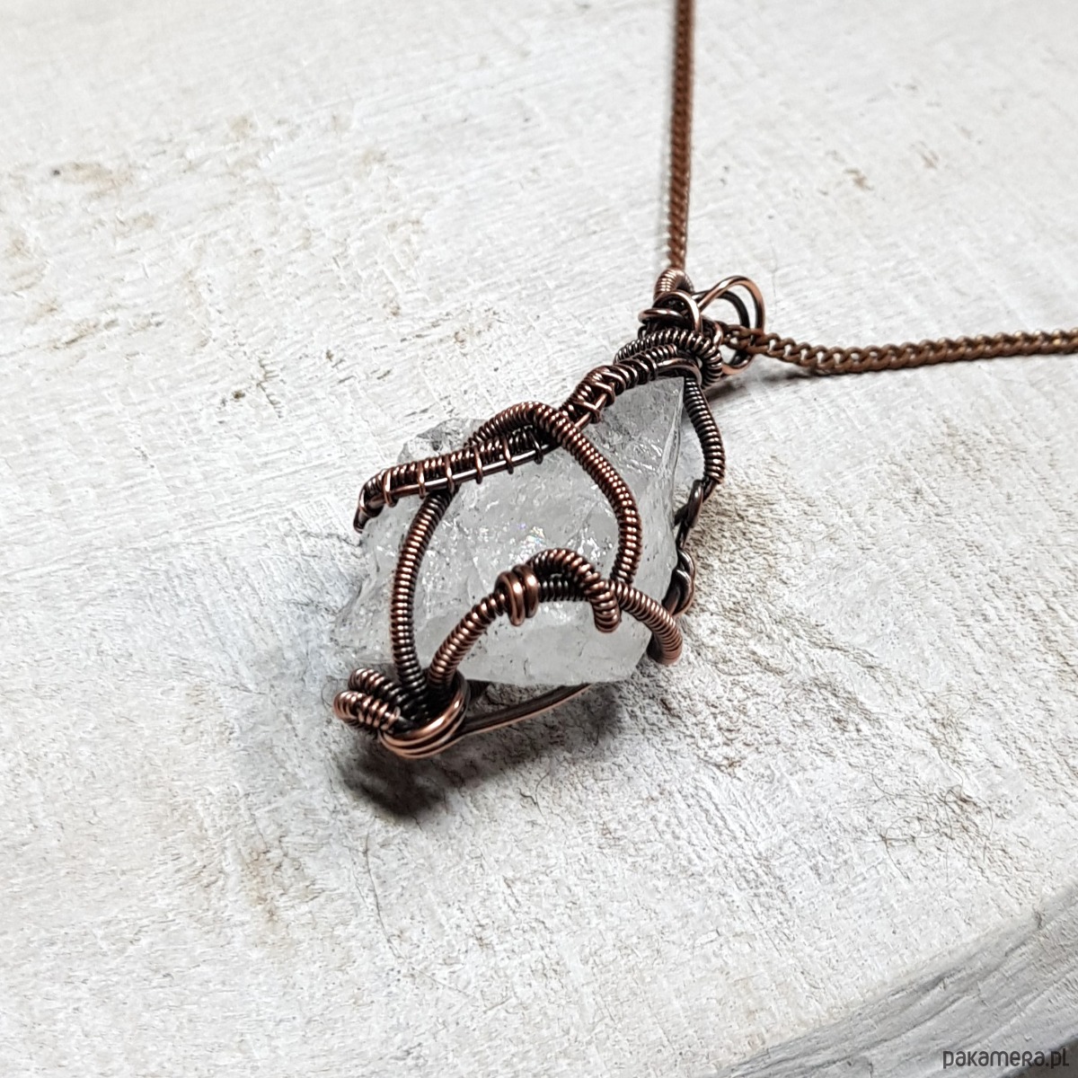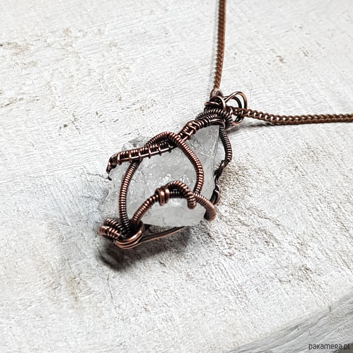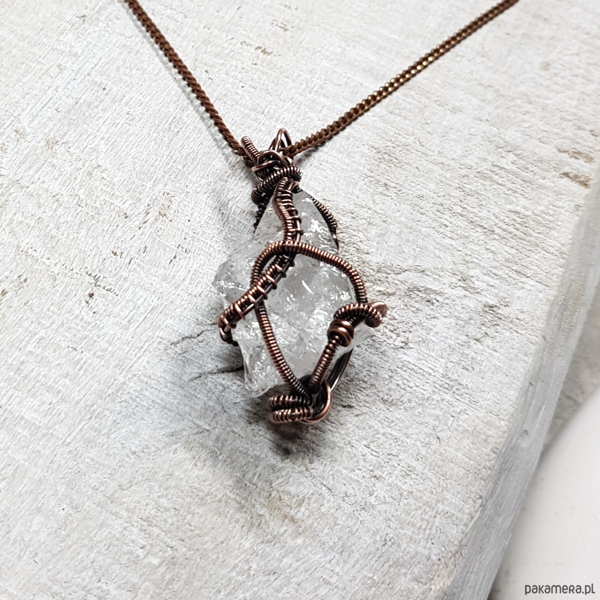 Dwustronna zawieszka wykonana ręcznie metodą wire-wrappingu z bryłki kryształu górskiego. Do wykonania wisiorka użyłam miedzianego drutu który następnie przyciemniłam oksydą i wypolerowałam w celu uzyskania efektu szlachetnego postarzenia . Zawieszka ma wymiary 47x29mm z łańcuszkiem długości około 48-50 cm .