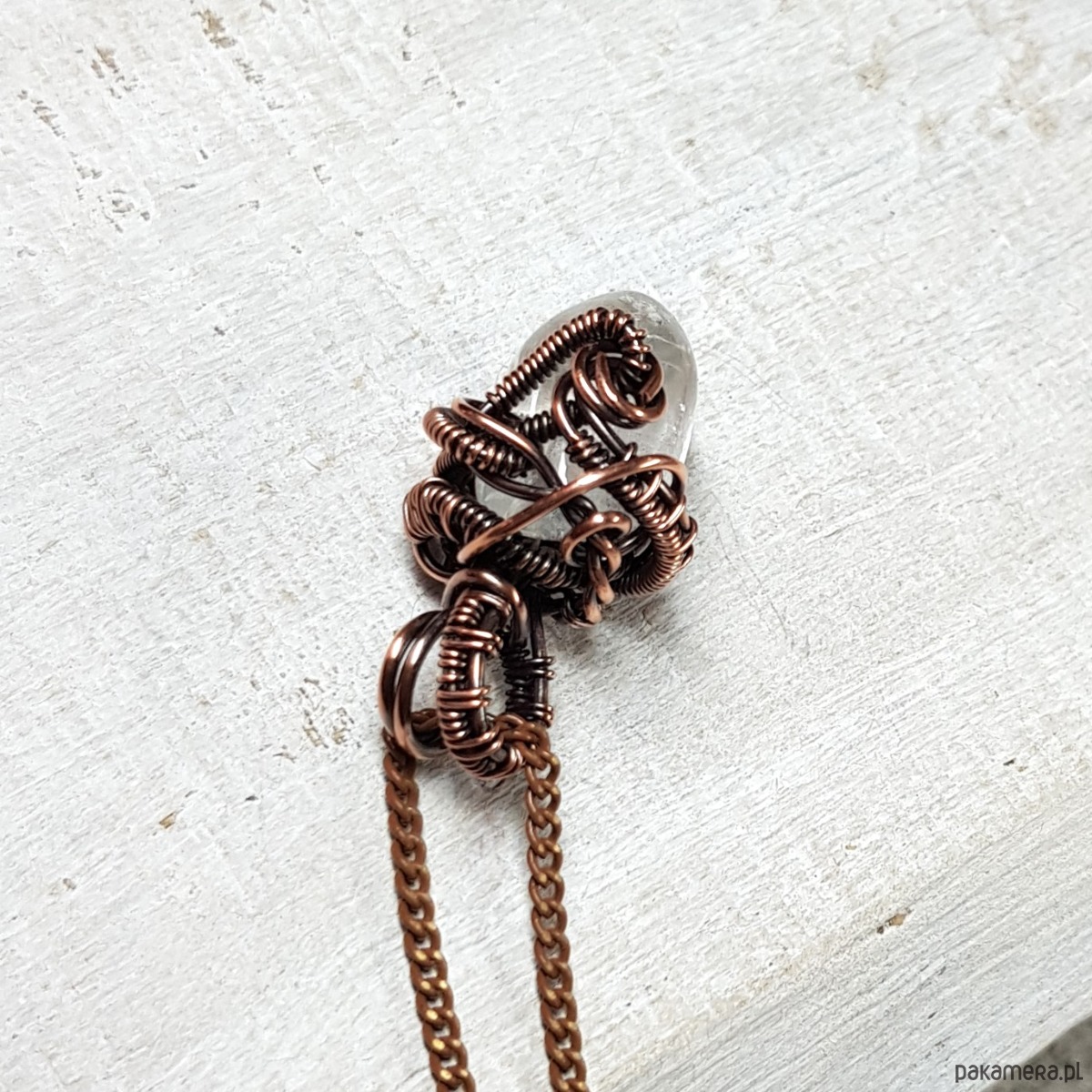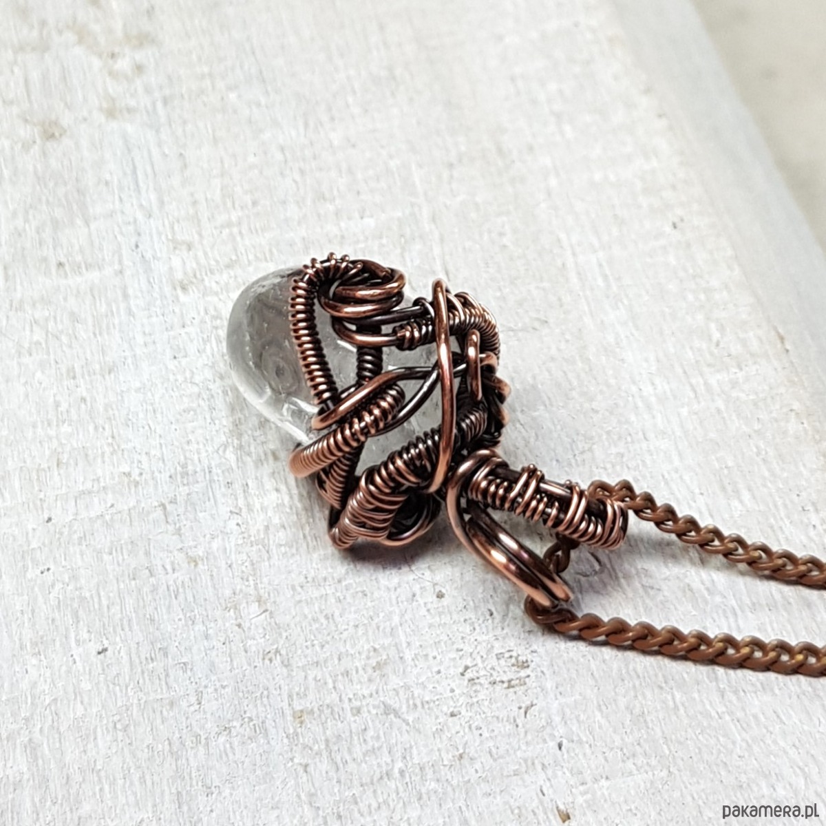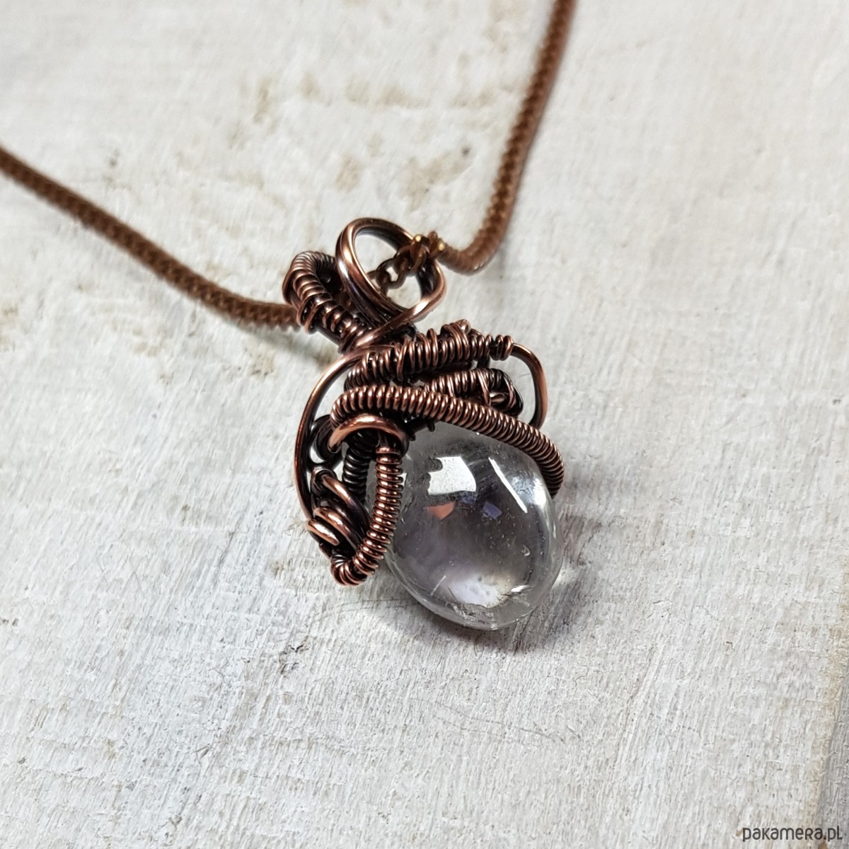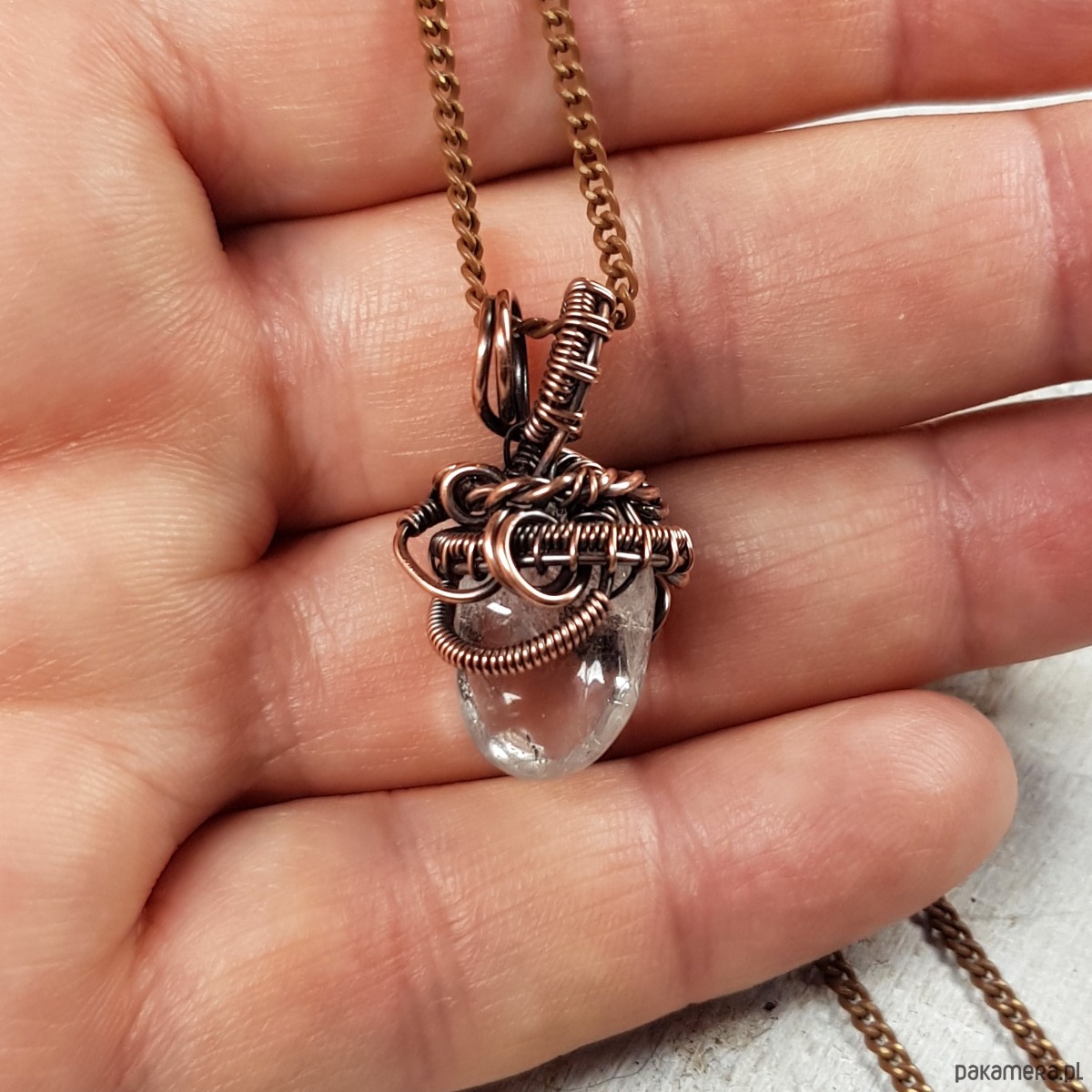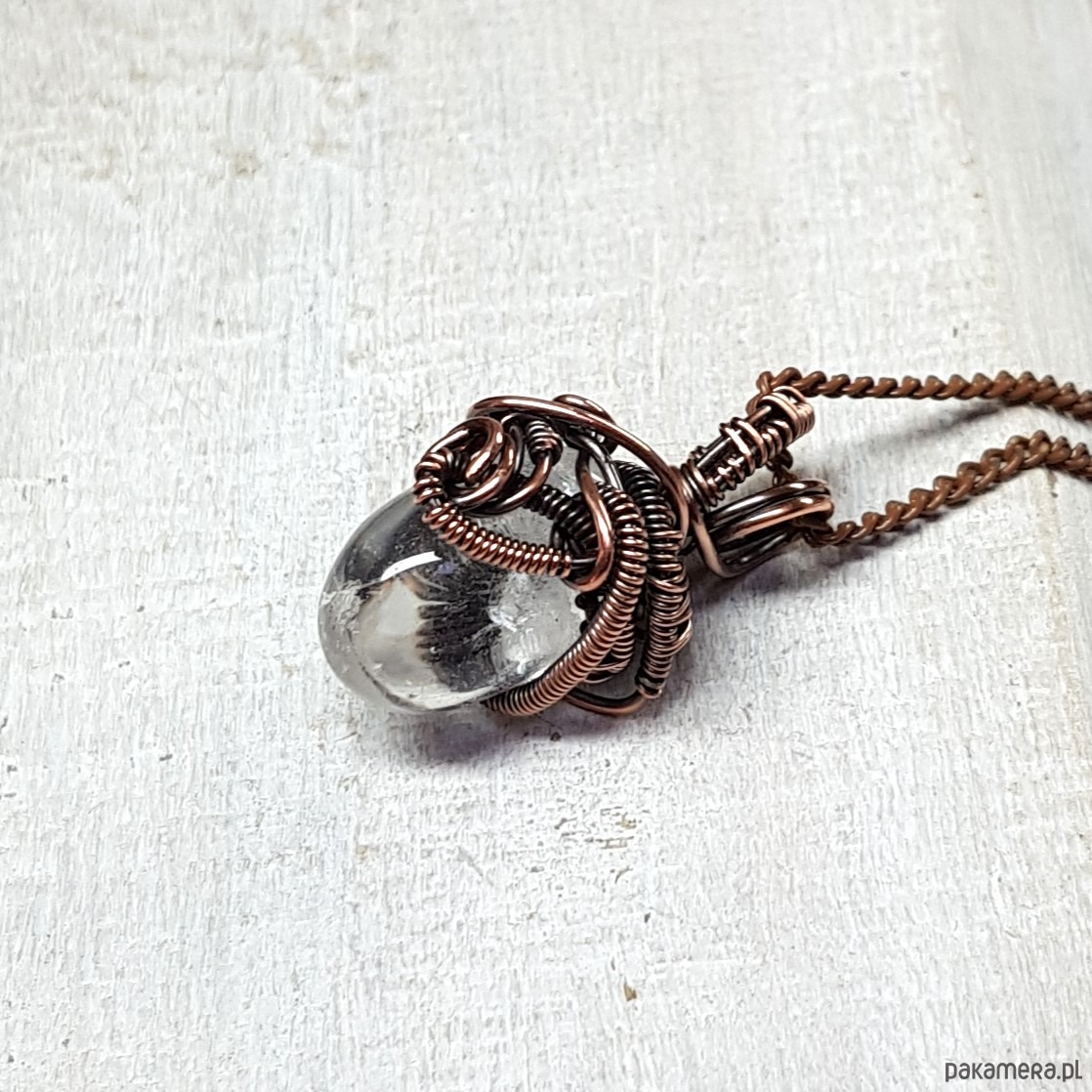 Dwustronna zawieszka wykonana ręcznie metodą wire-wrappingu z kryształu górskiego. Do wykonania wisiorka użyłam miedzianego drutu który następnie przyciemniłam oksydą i wypolerowałam w celu uzyskania efektu szlachetnego postarzenia . Zawieszka ma wymiary 28x16mm z łańcuszkiem długości około 48-50 cm .