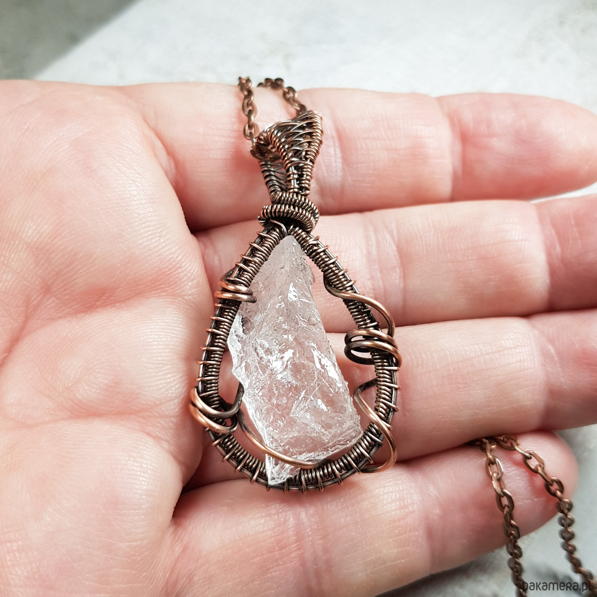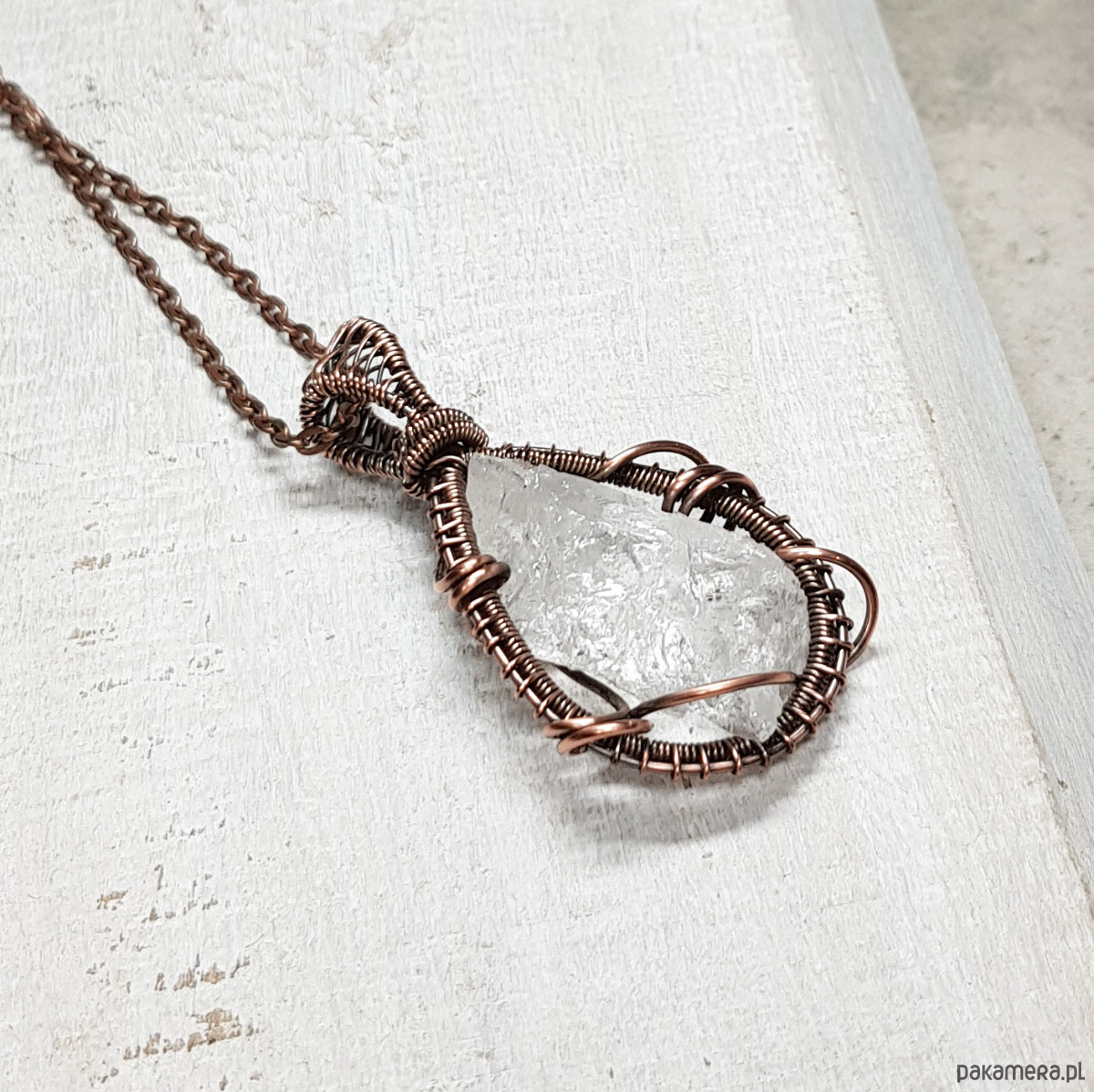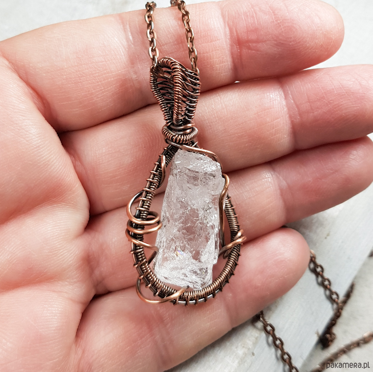 Dwustronna zawieszka wykonana ręcznie metodą wire-wrappingu z bryłki kryształu górskiego. Do wykonania wisiorka użyłam miedzianego drutu który następnie przyciemniłam oksydą i wypolerowałam w celu uzyskania efektu szlachetnego postarzenia . Zawieszka ma wymiary 45x26mm z łańcuszkiem długości około 48-50 cm .