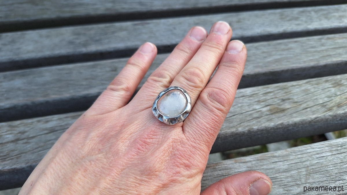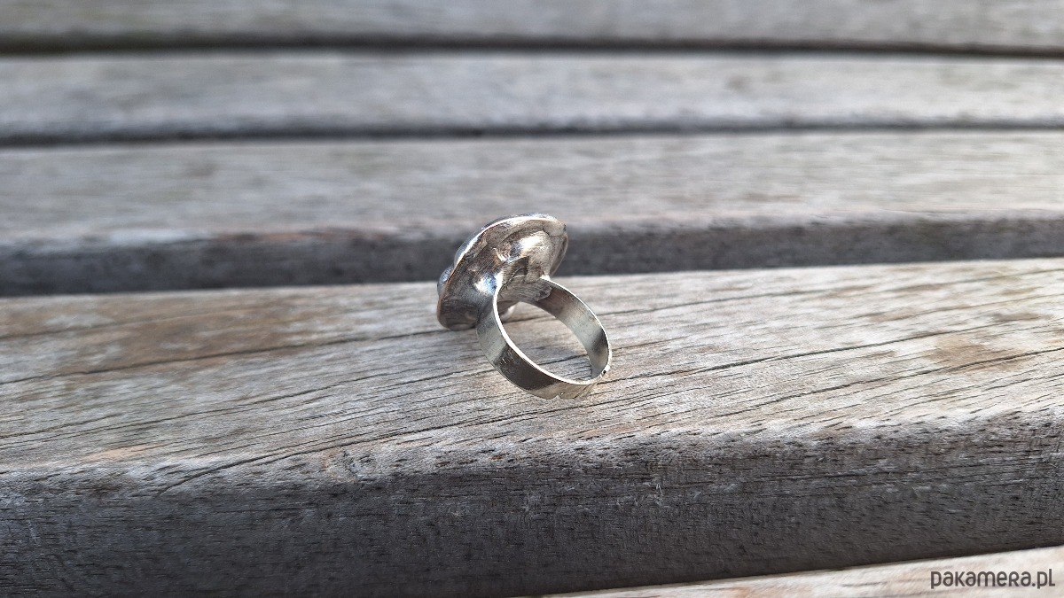 Pierścionek wykonany z miedzi, cyny i kryształu górskiego. Wymiary ok. 2 na 1.8 cm. Regulowany. Nie jest ciężki.