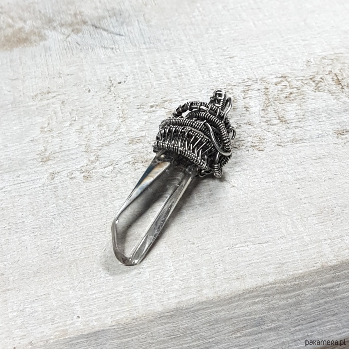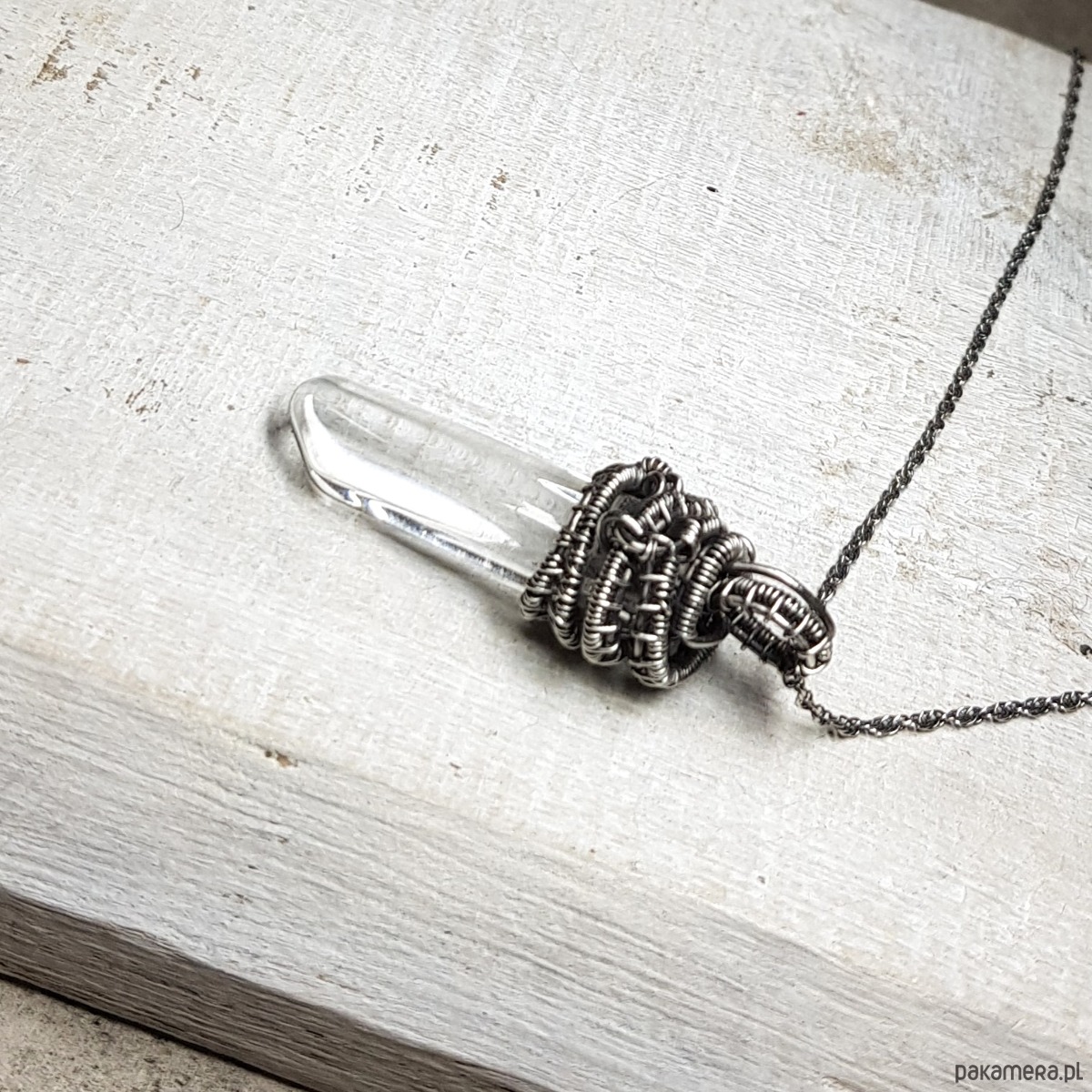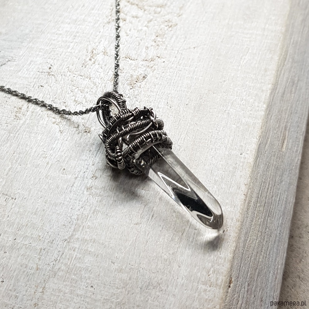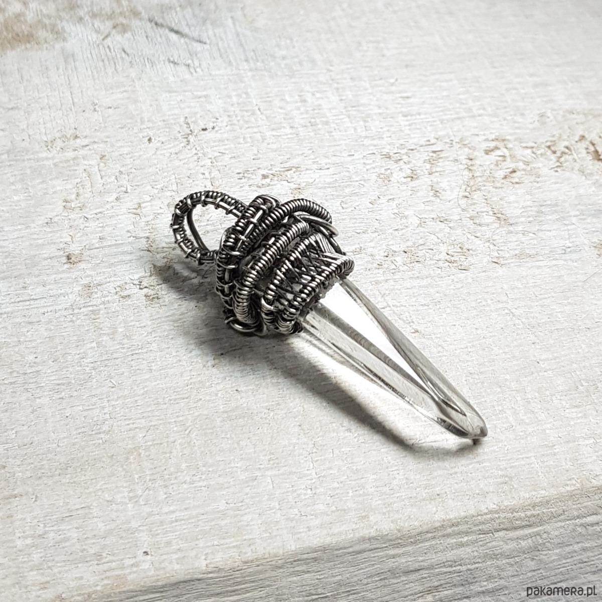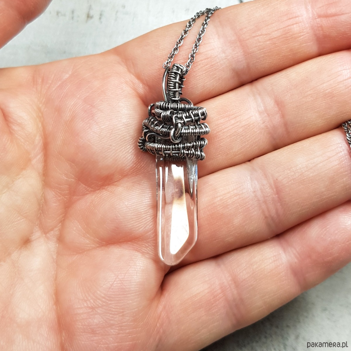 Zawieszka wykonana ręcznie metodą wire-wrappingu z pięknego, idealnie czystego sopla kryształu górskiego. Do wykonania wisiorka użyłam srebrnego drutu najwyższej próby 999, wymiary zawieszki 45x15mm, z łańcuszkiem długości około 48-50 cm. Uwaga, zawieszka jest sporych rozmiarów.
