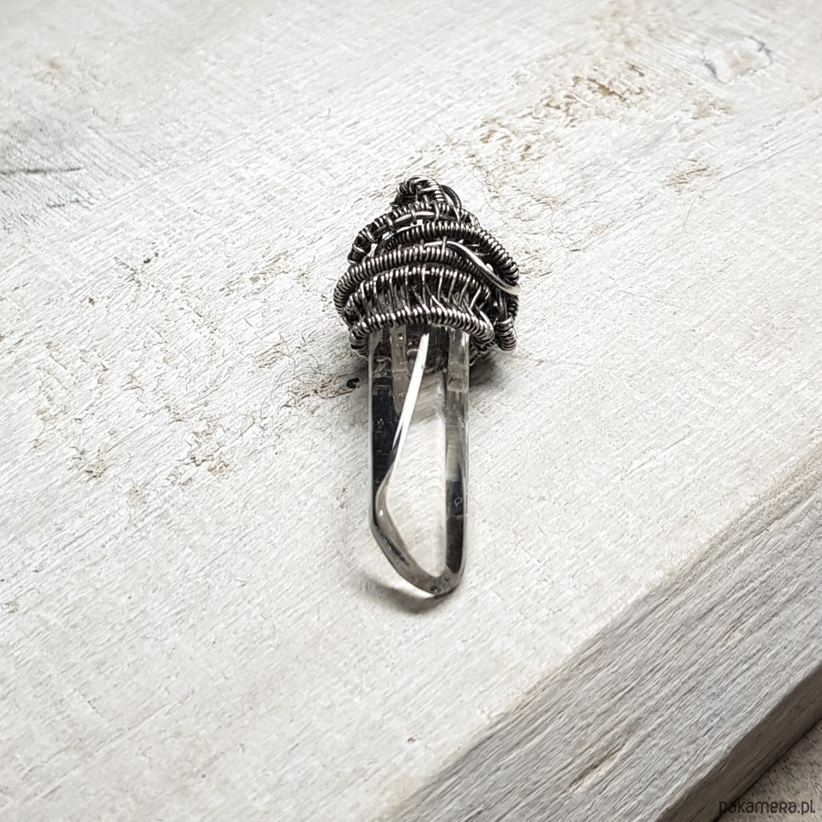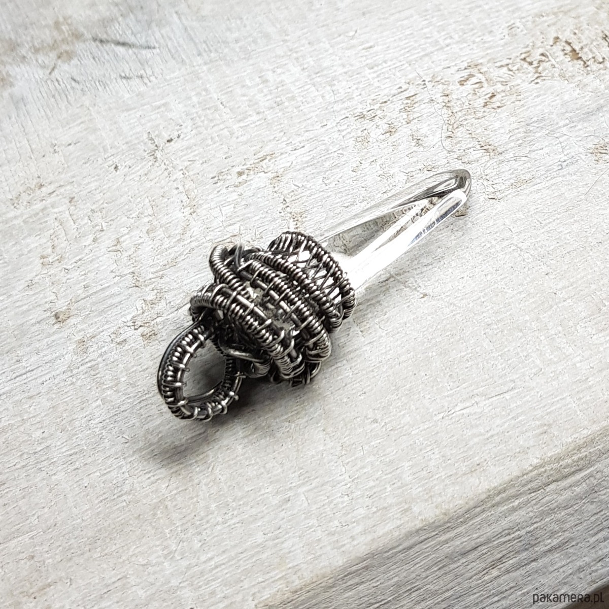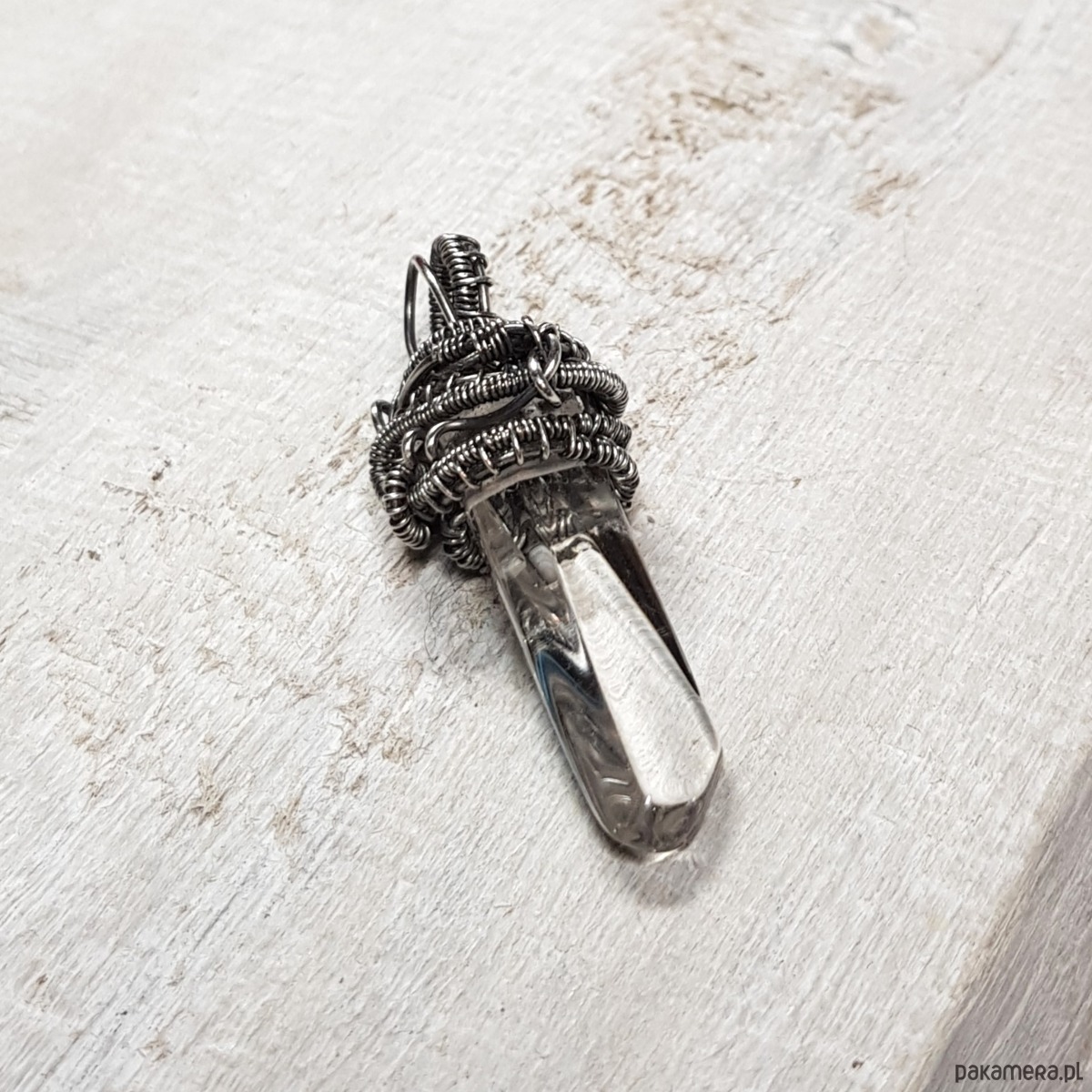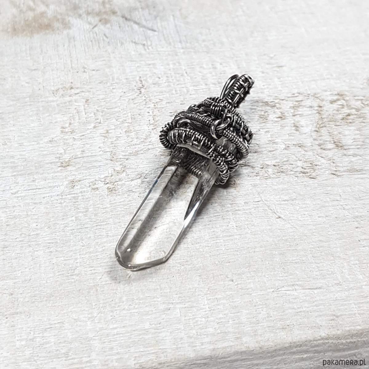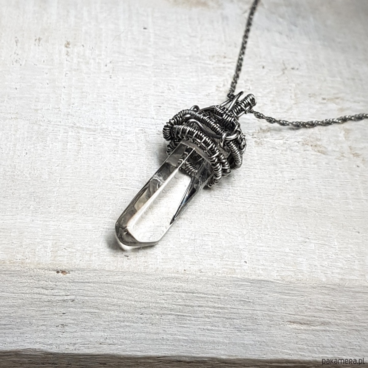 Zawieszka wykonana ręcznie metodą wire-wrappingu z pięknego, idealnie czystego sopla kryształu górskiego. Do wykonania wisiorka użyłam srebrnego drutu najwyższej próby 999, wymiary zawieszki 45x15mm, z łańcuszkiem długości około 48-50 cm. Uwaga, zawieszka jest sporych rozmiarów.