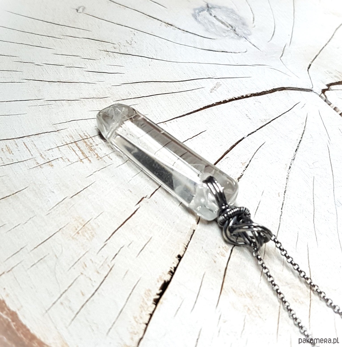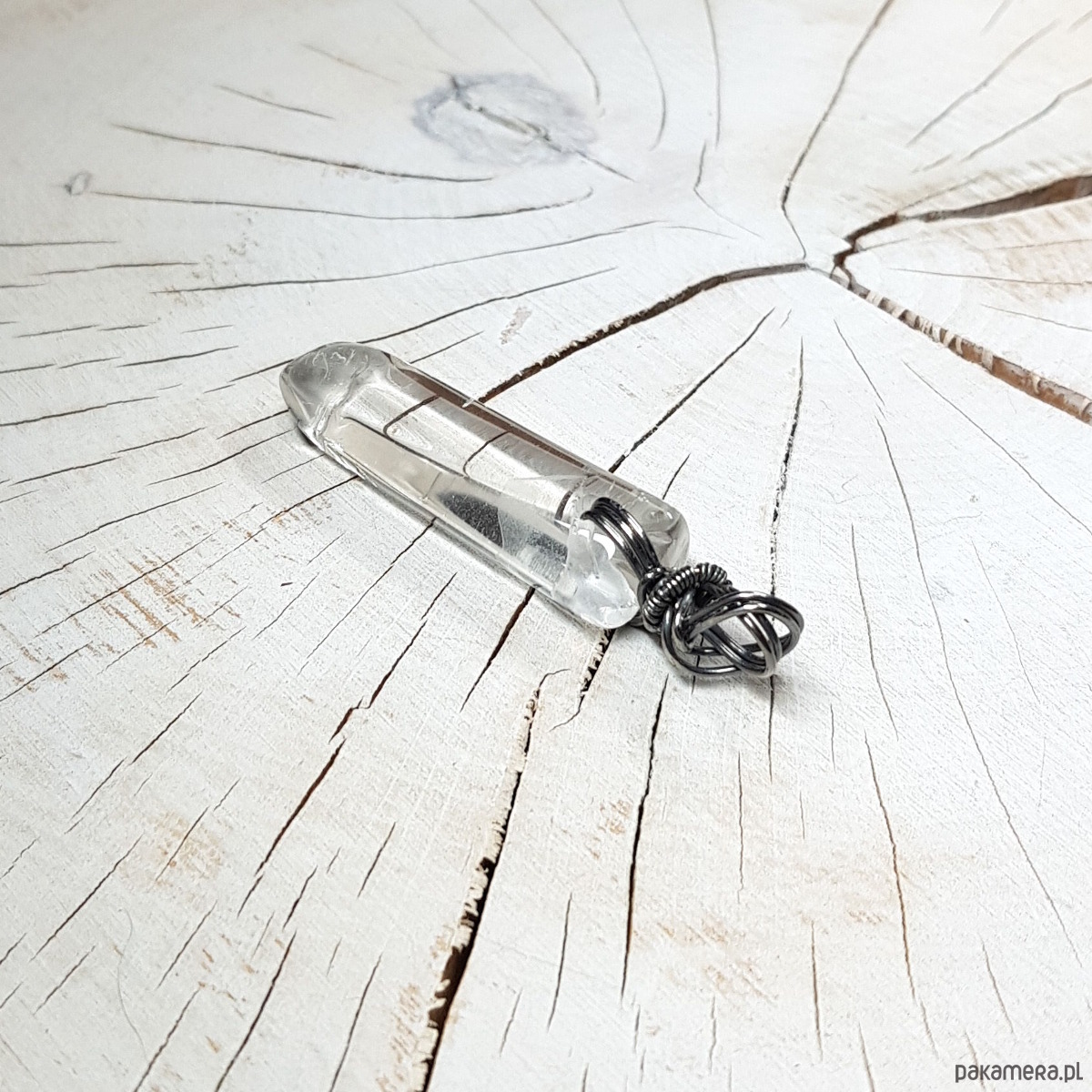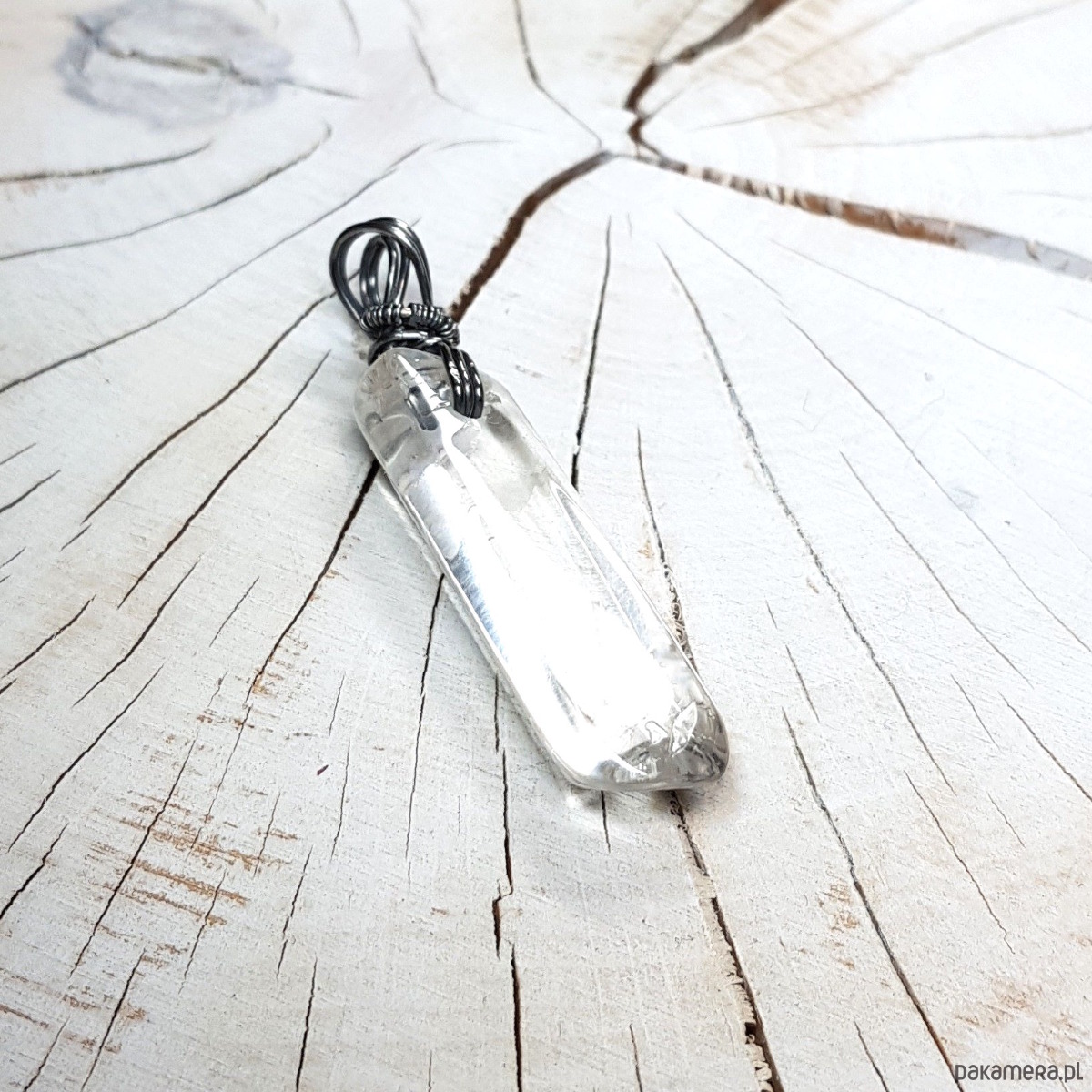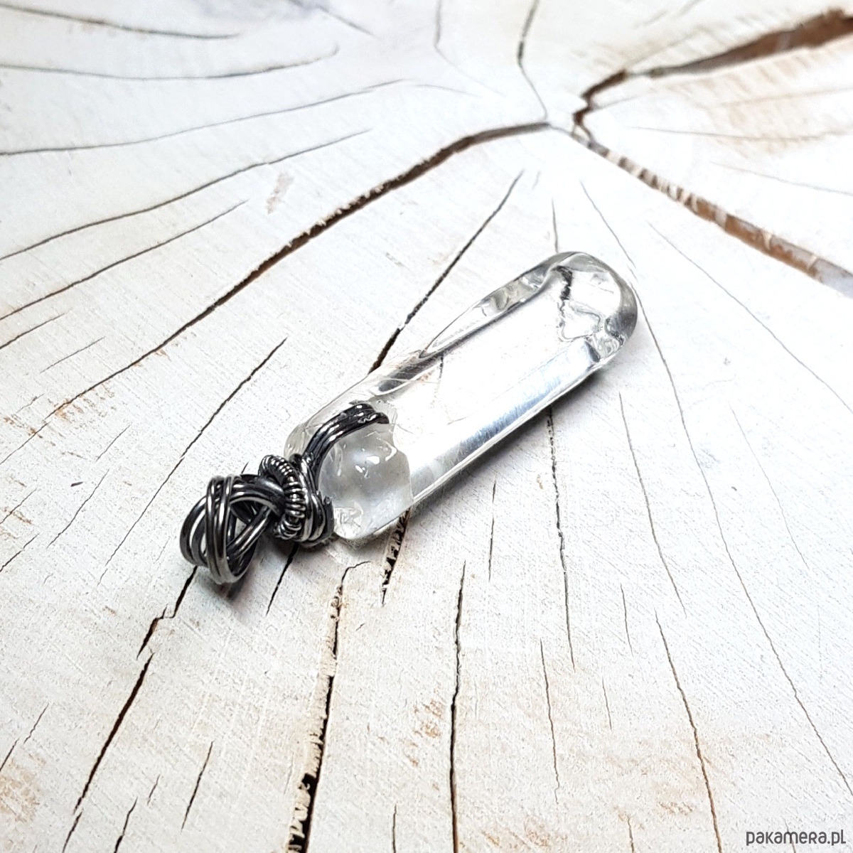 Zawieszka wykonana ręcznie metodą wire-wrappingu z sopla kryształu górskiego. Do wykonania wisiorka użyłam srebrnego drutu najwyższej próby 999, wymiary zawieszki 50x12cm, bez łąńcuszka.
