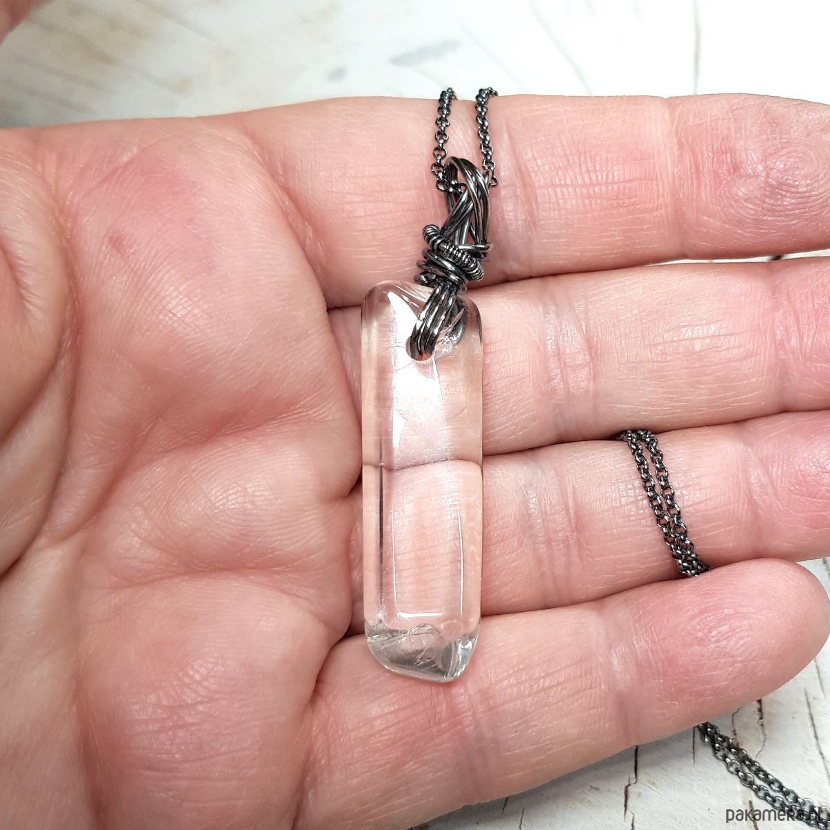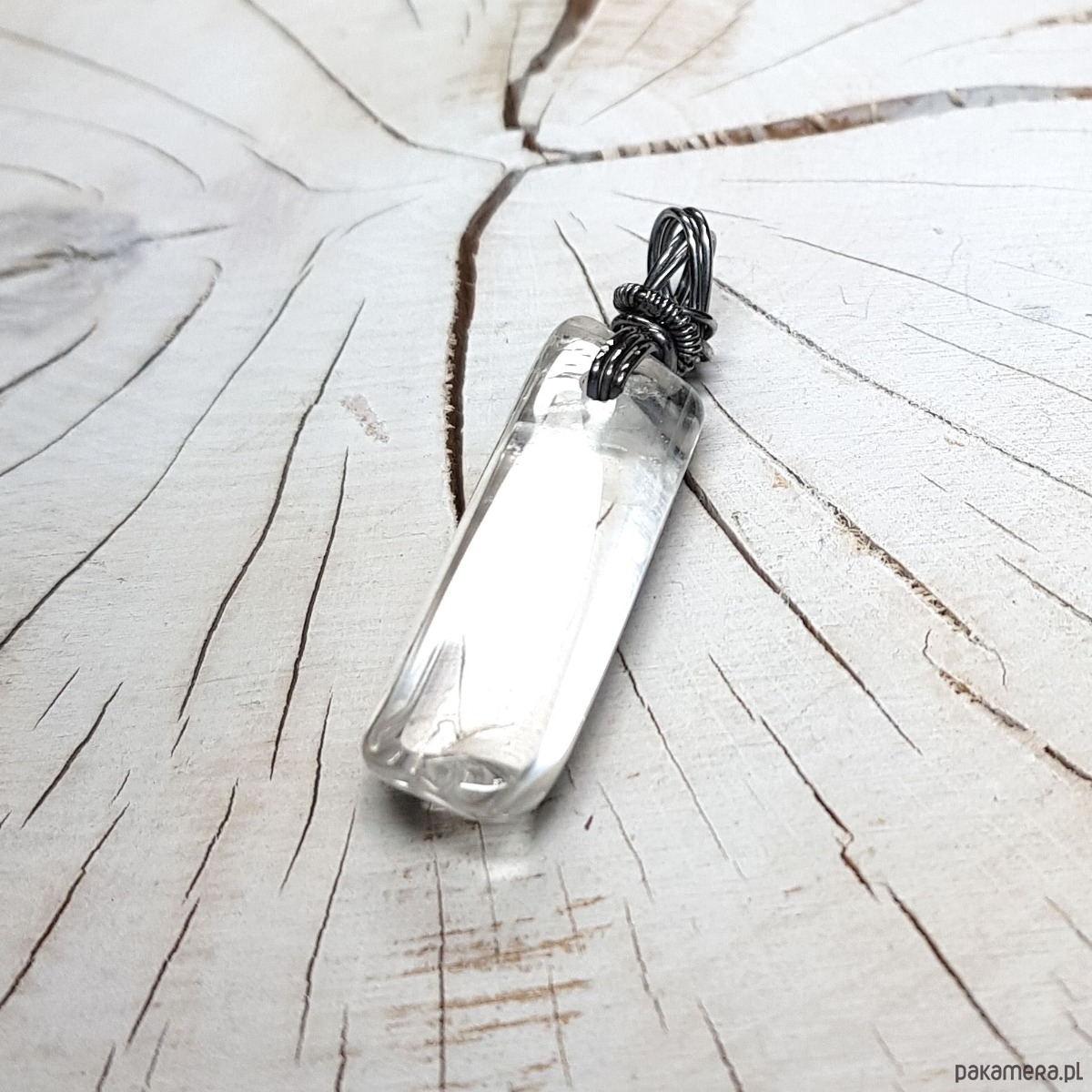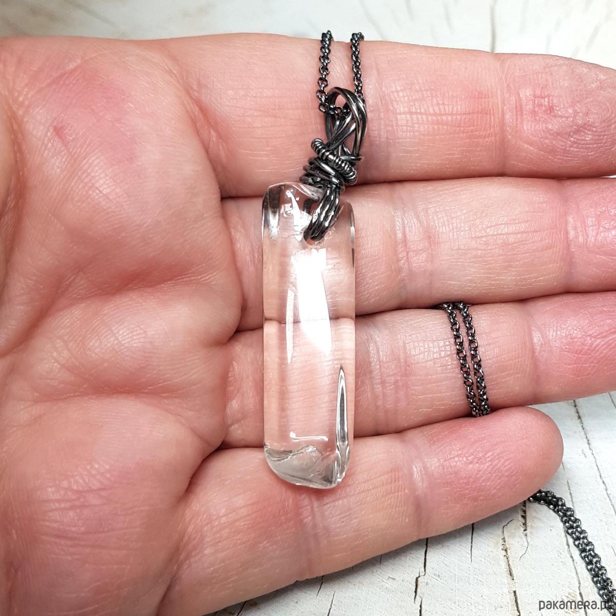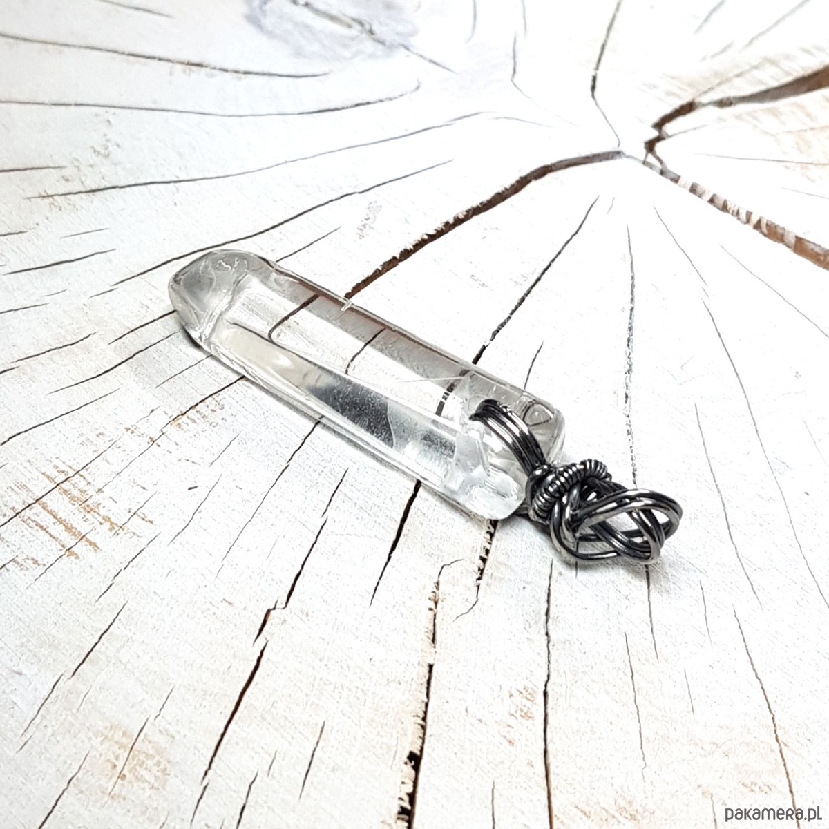 Zawieszka wykonana ręcznie metodą wire-wrappingu z sopla kryształu górskiego. Do wykonania wisiorka użyłam srebrnego drutu najwyższej próby 999, wymiary zawieszki 50x12cm, bez łąńcuszka.