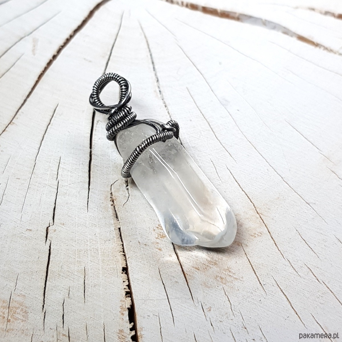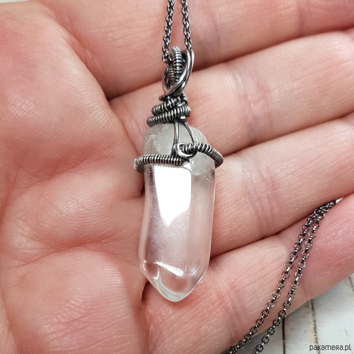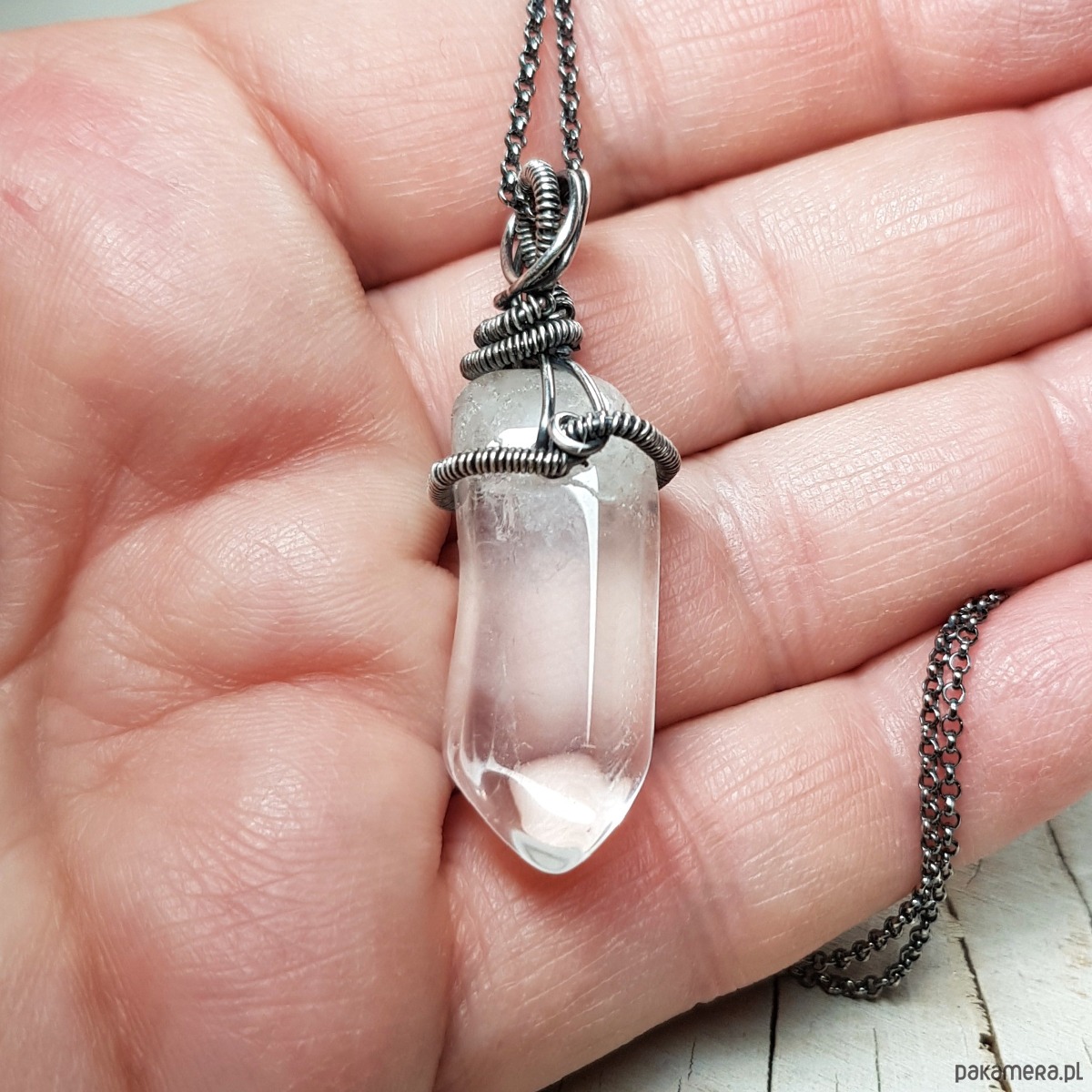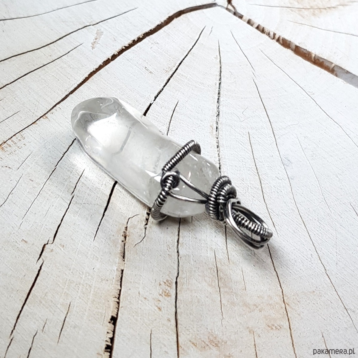 Zawieszka wykonana ręcznie metodą wire-wrappingu z sopla kryształu górskiego. Do wykonania wisiorka użyłam srebrnego drutu najwyższej próby 999, wymiary zawieszki 42x16cm, bez łąńcuszka.